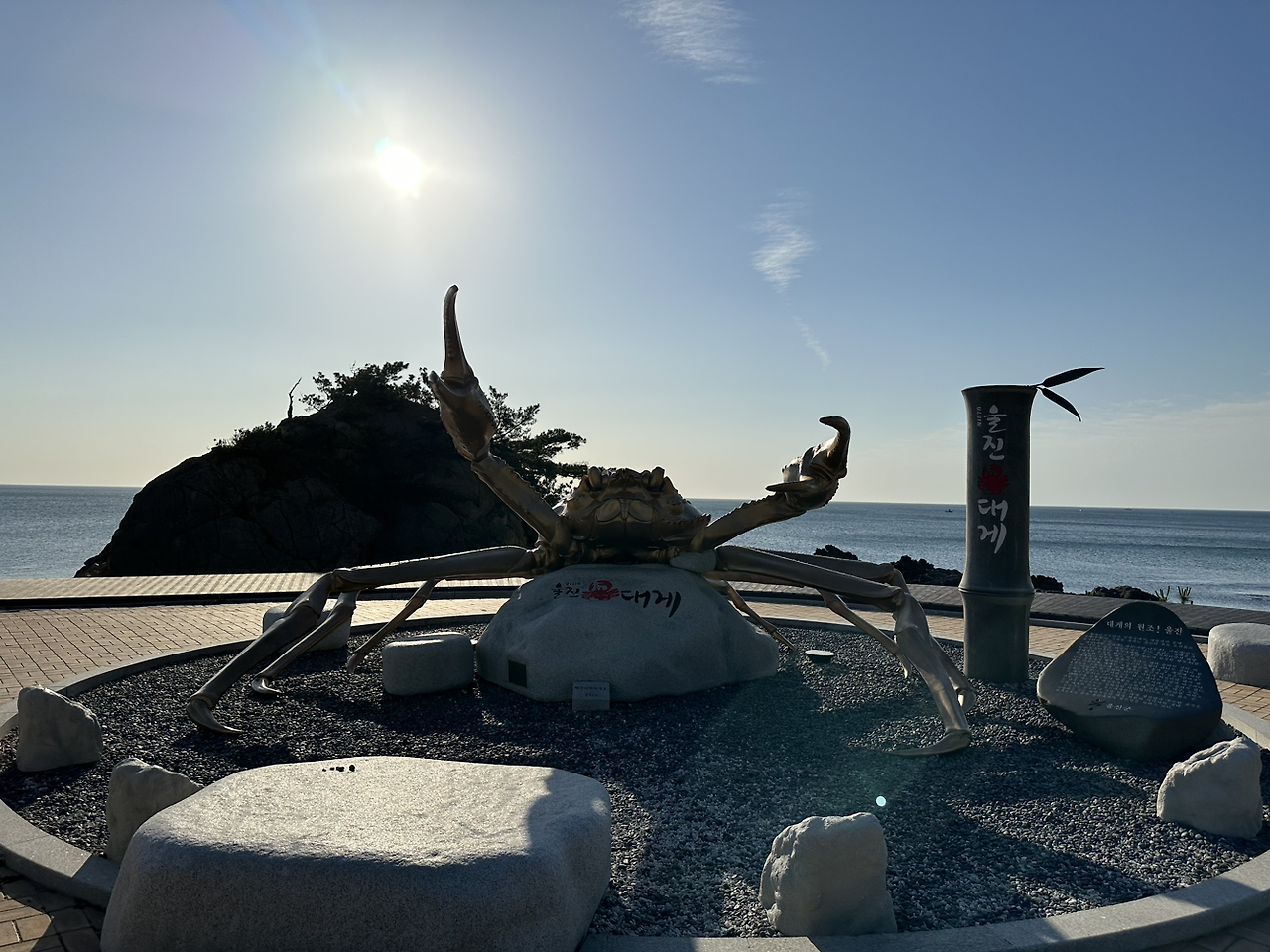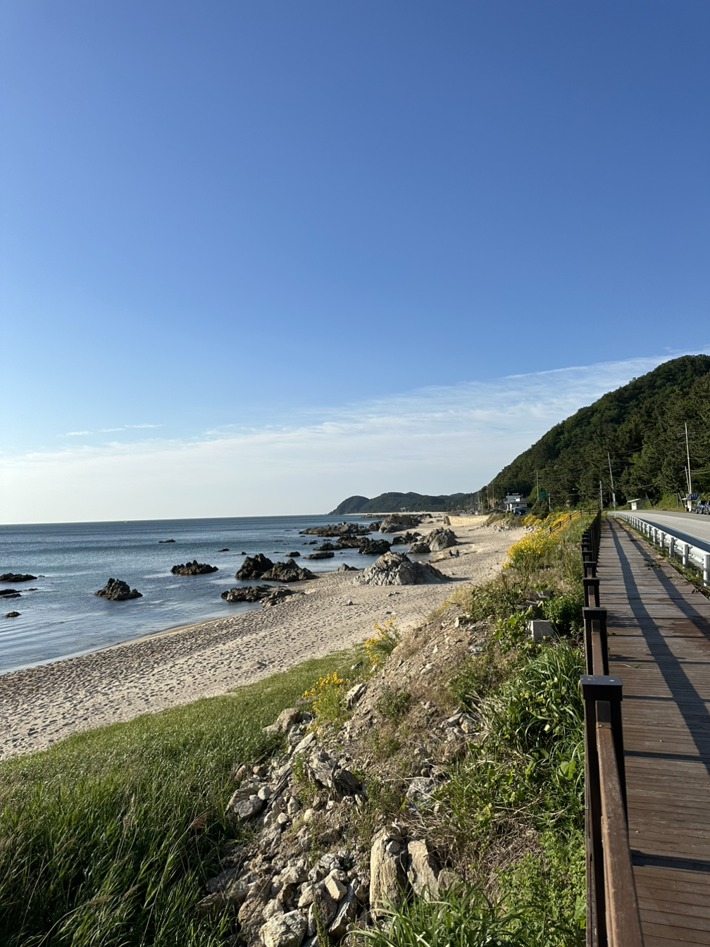 망양휴게소를 출발해 황금울진대게 공원까지 아름다운 도보여행길이 계속된다. 이른 아침 이 길을 걷게 돼서 너무 다행이다. 드문드문 신(新) 국도의 차량소리 외에는 인위적인 소리가 들리지 않는다. 성시경을 들으며 경치에 빠져 한참을 걷다가 이어폰 사이로 들려오는 파도소리가 좋아서 이어폰 없이 들려오는 소리에 집중해 본다. 바로 앞에서 들려오는 소리인가 싶어 귀 기울이면 저 멀리서 밀려오는 소리인 듯하다. 바다의 소리인가 하여 귀 기울이면 바람과 모래의 소리가 들린다. 이른 아침 아무도 없는 길 위에서 만들어진 소리는 길이 나에게 선물하는 축복이자 내가 이 여행을 하는 목적이다.