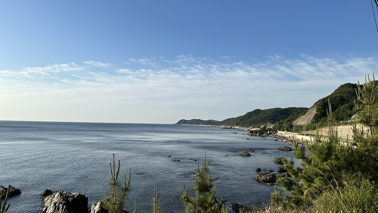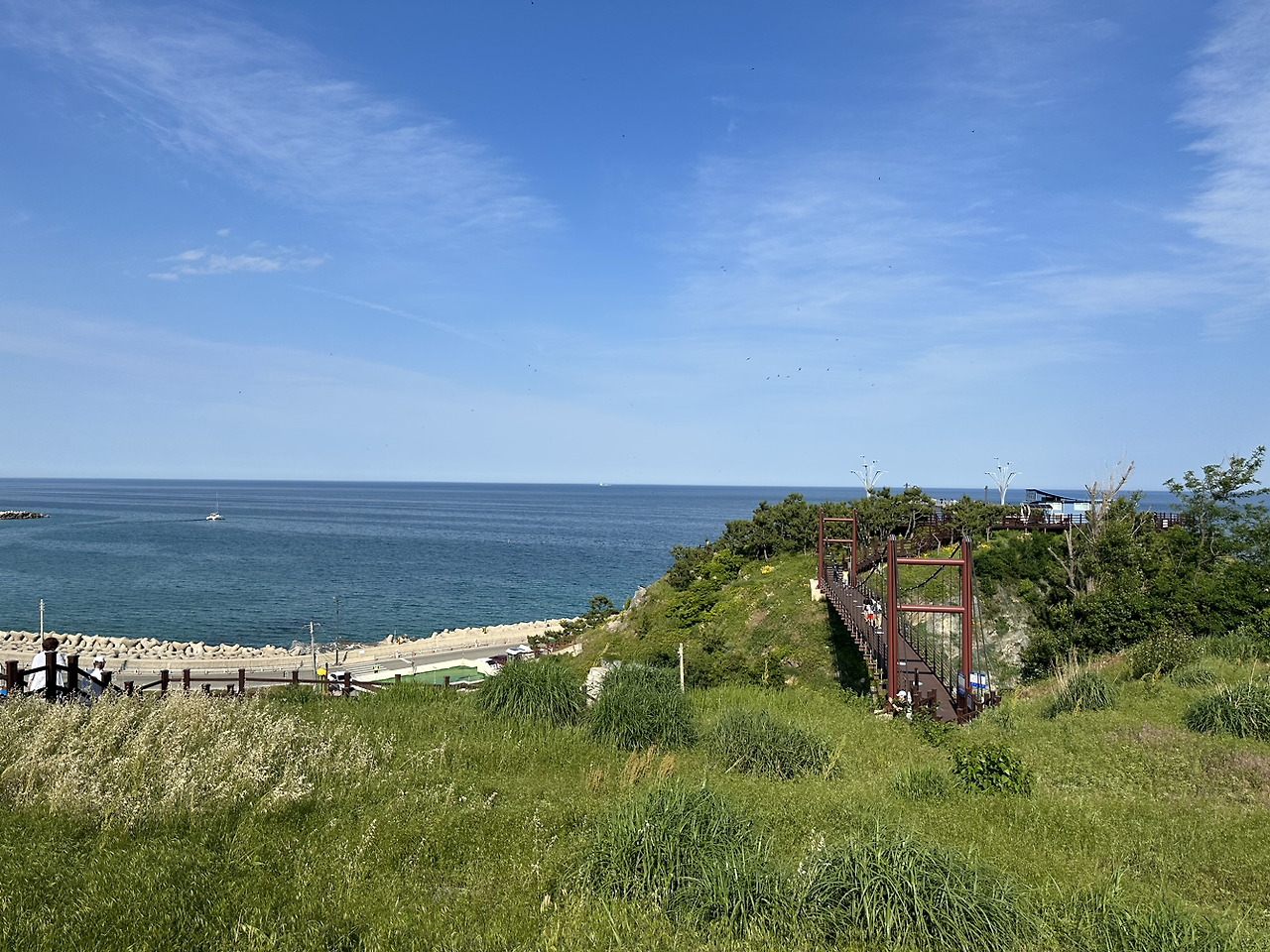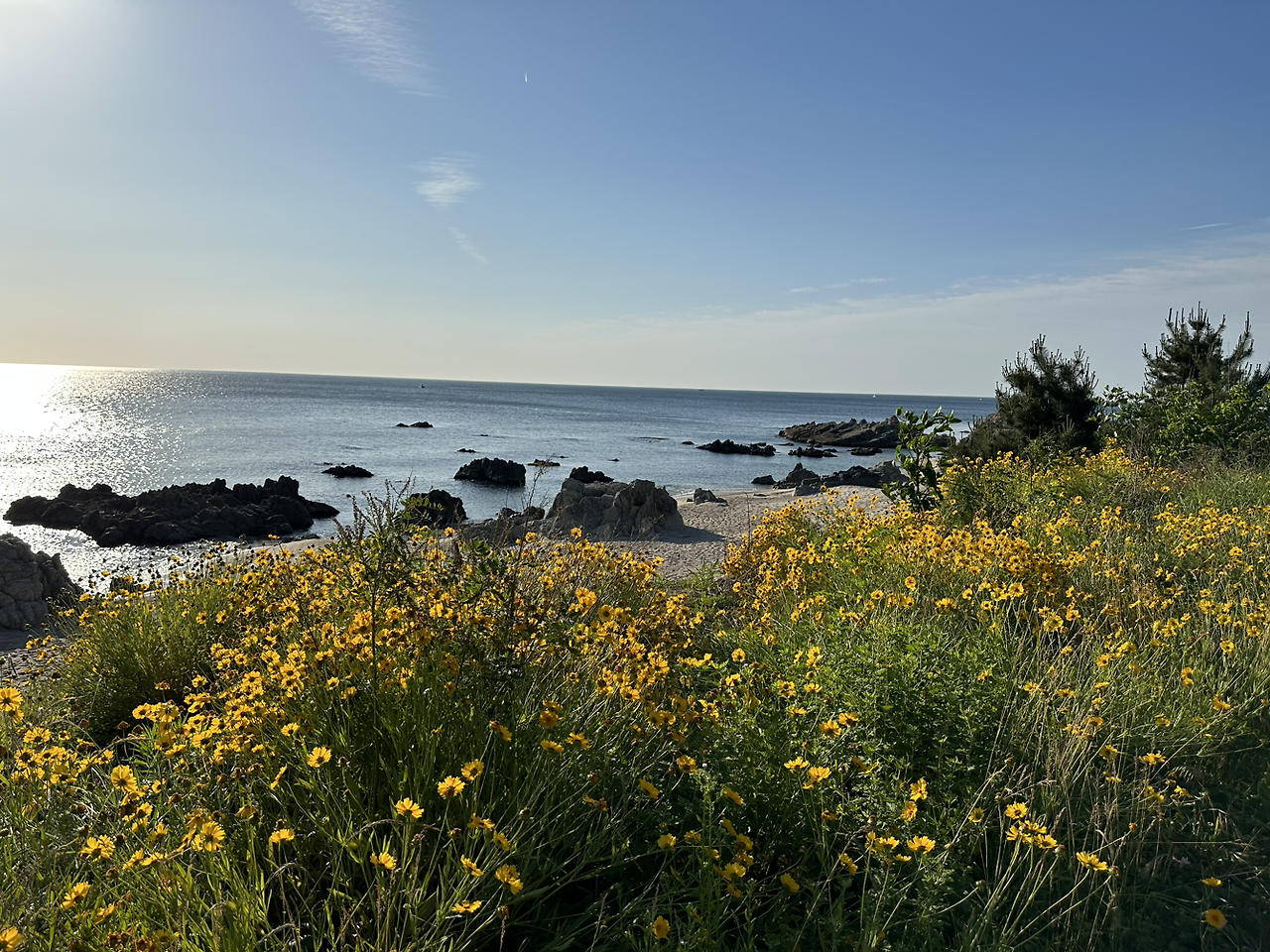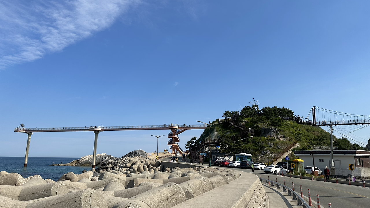 망양휴게소에서 바라다보이는 해파랑길의 모습은 절경이자 힐링이 느껴지는 길이다. 초여름 여행을 떠나온 내 마음과 같이 동해에는 잔잔한 파도가 일렁인다. 온통 하늘색으로 물들였다면 부담스러웠을 하늘 한쪽을 양떼구름이 차지하며 조화를 맞추고 있다. 양떼구름을 향해 둥글게 뻗은 도로마저도 자연의 하나인 양 자연스럽다. 해안가에 드문드문 검은 갯바위가 바닷가의 아름다움을 더하고 도로변의 자그마한 연녹색 군솔과 노란색 들꽃이 초여름 아침 싱그러운 빛의 향연을 펼친다. 먼지 낀 오래된 도로의 가드레일과 파란색 차선마저도 신의 조화인 양 아름답게만 보인다.