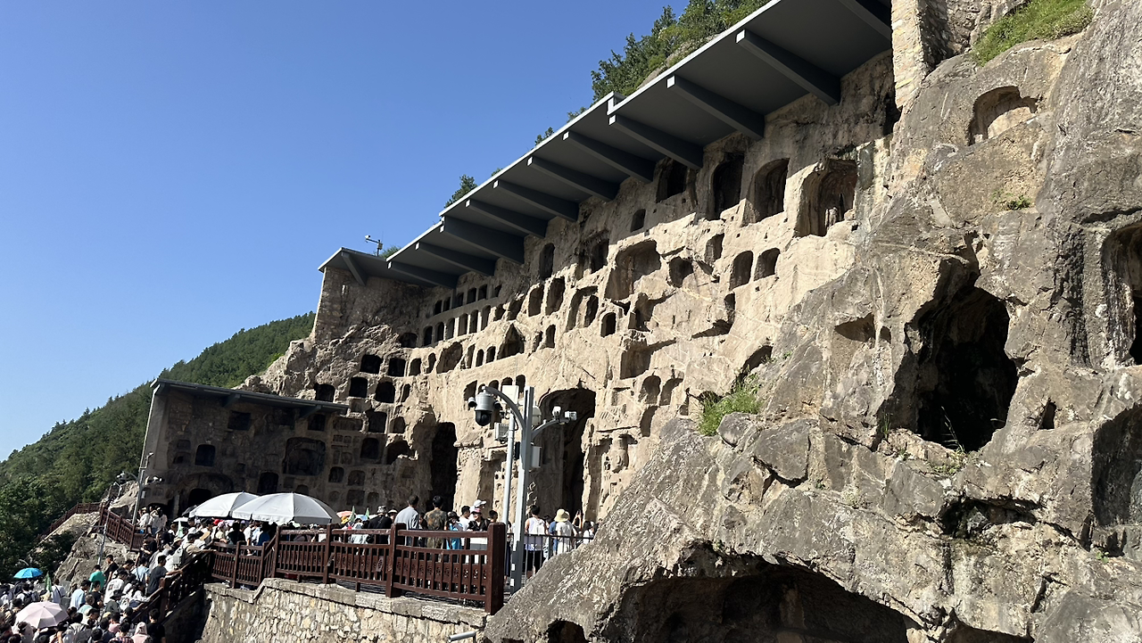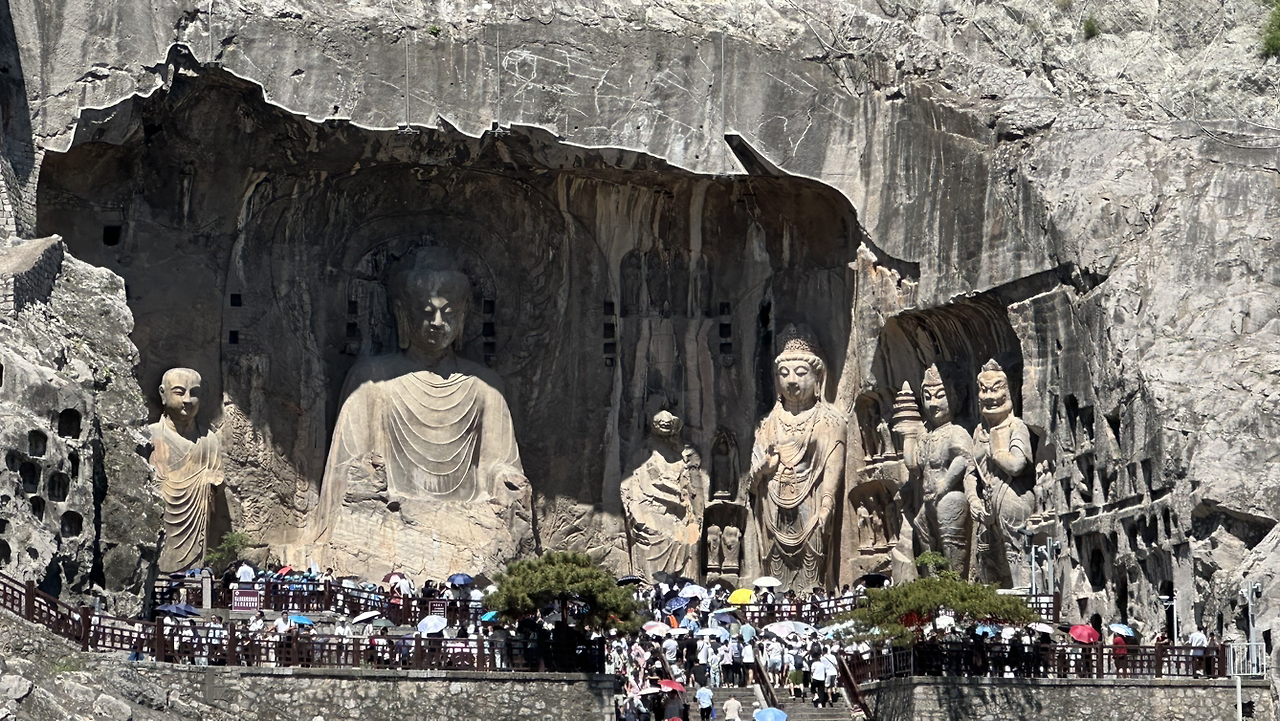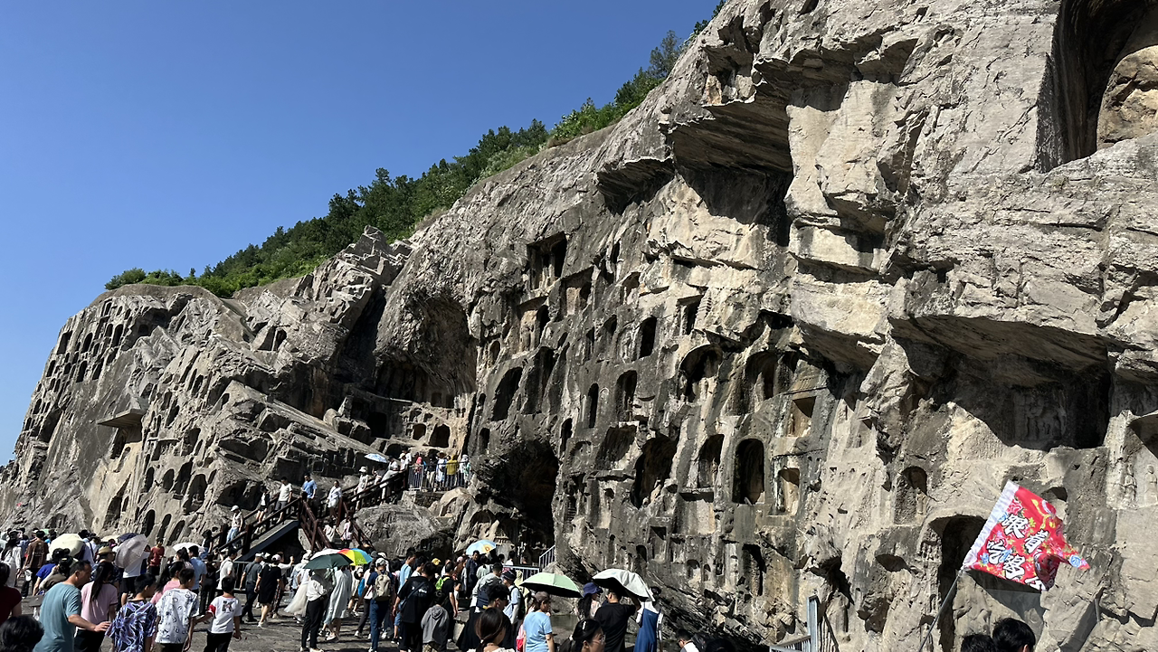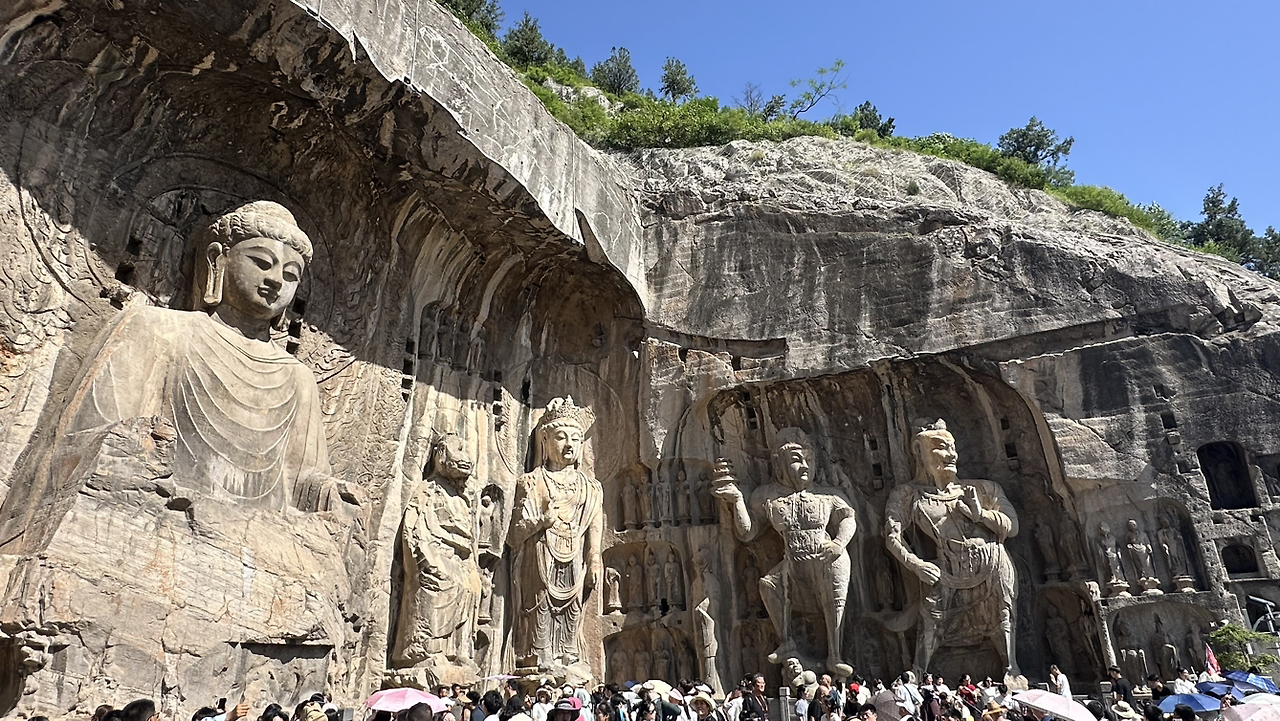 뤄양에서의 실질적 첫 방문지는 용문석굴이야. 뤄양을 흐르는 강인 이수의 강변 돌산에 수천 개의 석굴을 만들어 불상을 모신 유적이야. 우리가 잘 알고 있는 유비, 관우, 장비의 시대인 위진남북조 시대에 만들어지기 시작해서 당나라시대에 대부분이 완성된 석굴이야. 많은 석굴들이 조성되어 있어서 멀리서 바라보면 마치 소고기 천엽 조각을 보는 것 같아.