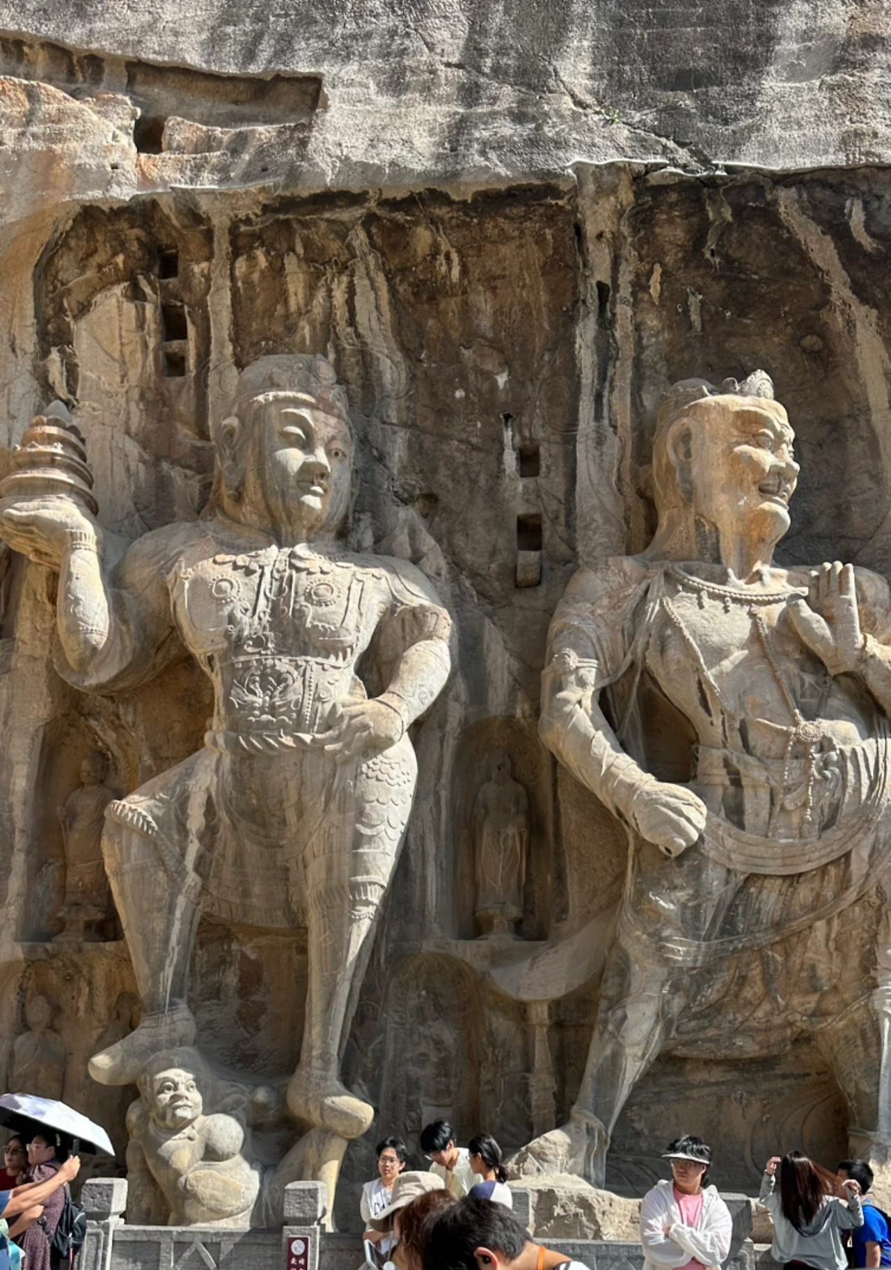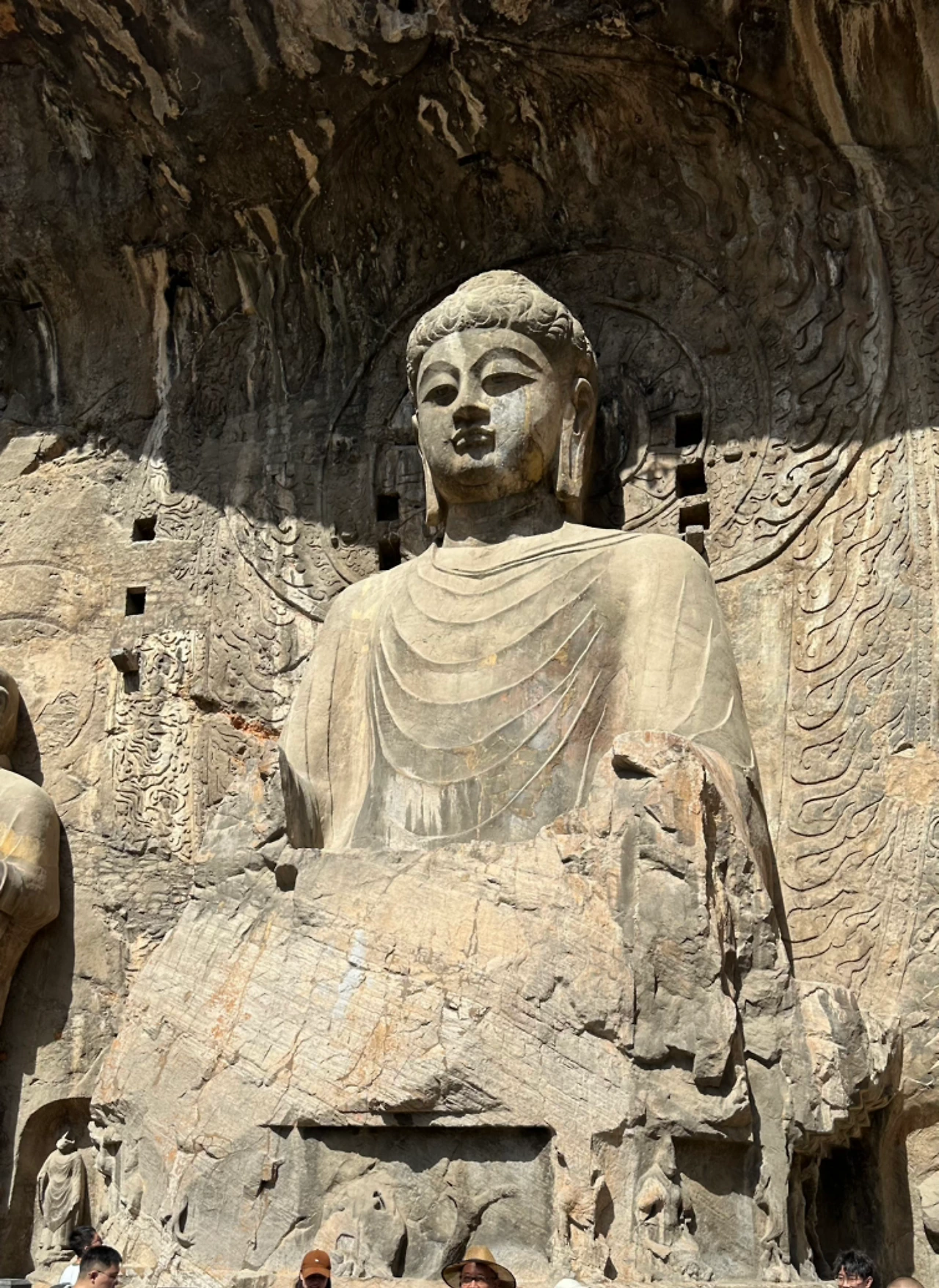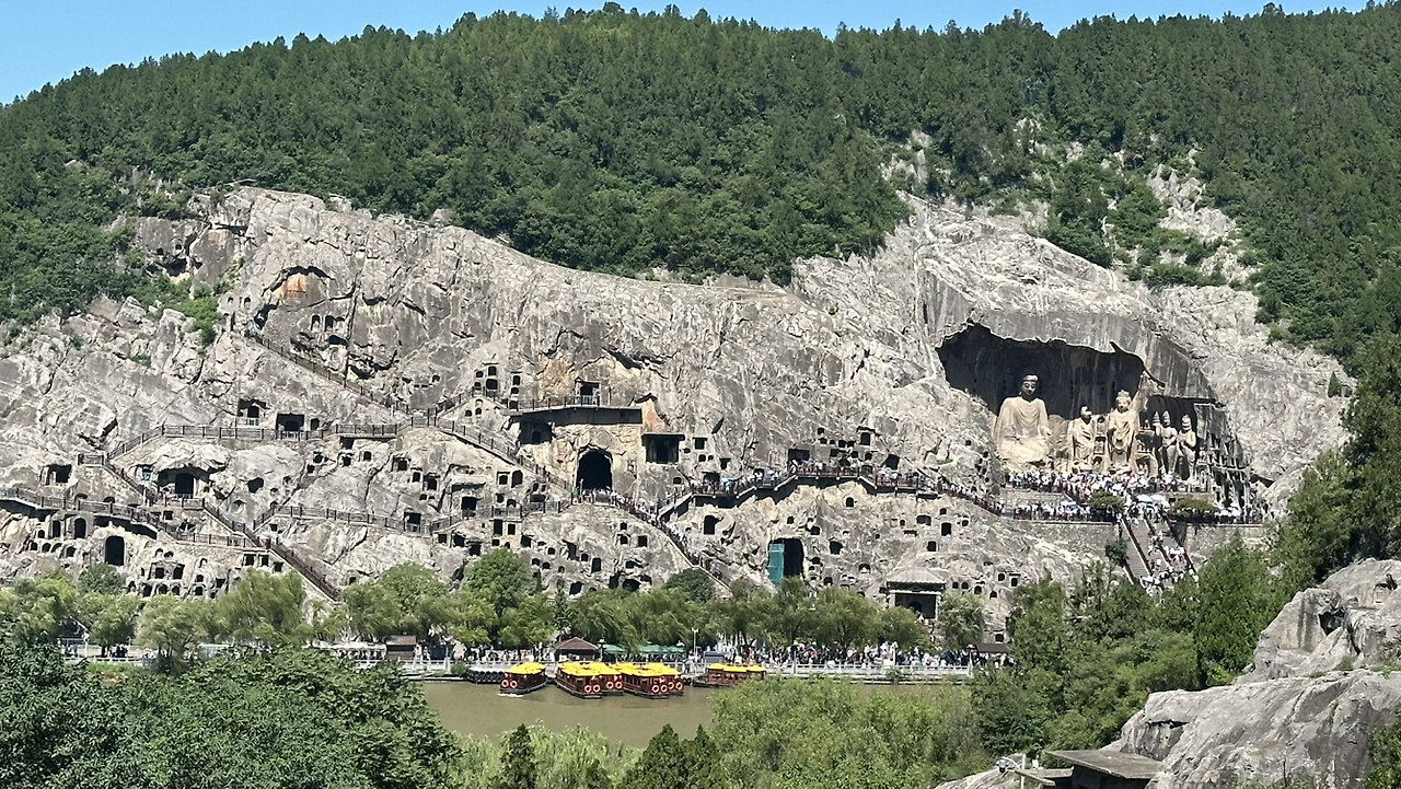 뤄양에서의 실질적 첫 방문지는 용문석굴이야. 뤄양을 흐르는 강인 이수의 강변 돌산에 수천 개의 석굴을 만들어 불상을 모신 유적이야. 우리가 잘 알고 있는 유비, 관우, 장비의 시대인 위진남북조 시대에 만들어지기 시작해서 당나라시대에 대부분이 완성된 석굴이야. 많은 석굴들이 조성되어 있어서 멀리서 바라보면 마치 소고기 천엽 조각을 보는 것 같아.