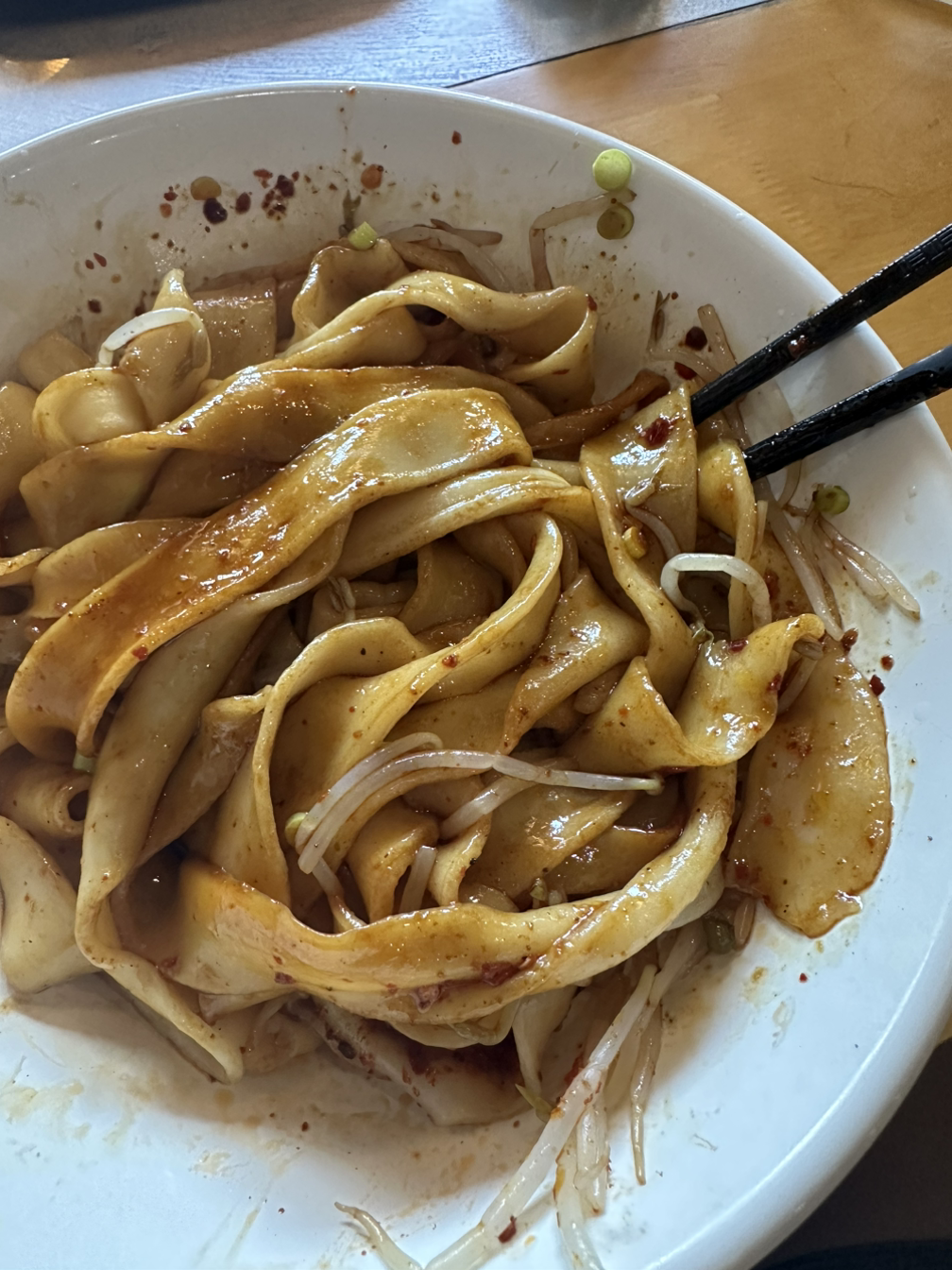 식당 메뉴를 둘러보니 몇가지 면종류와 간단한 반찬을 파는, 식당규모에 비해 단촐한 메뉴를 가진 식당이었어. 대표적인 면종류는 용지면(龙之面)이라는 해물탕면과 몇 가지 고기탕면 종류와 유포면(油泼面)이 있었어. 나는 책과 SNS에서 본 적이 있는 유포면을 주문하고 반찬으로는 산두부피(涮豆腐皮)를 주문했어. 유포면은 널찍한 밀가루면에 숙주와 파 그리고 끓은 고추기름을 부어서 비벼 먹는 면이야. 아주 익숙한 맛은 아니지만 한국사람에게 특별한 거부감은 없을 것 같았고, 시안에서 먹었던 뺭뺭면보다 훨씬 더 맛있었어. 반찬이라는 표현보다는 사이드 메뉴라는 표현이 더 어울릴듯한 산두부피(涮豆腐皮)는 내가 집에서 가끔 만드는 건두부볶음과 비슷한 맛이야. 산(涮, shuan)이라는 한자는 "데치다"라는 의미의 중국어야. 뜻 그대로 데친 두부피로 만든 음식이야. 실제 이 음식은 데친 건두부를 꼬치에 꽂아서 고추기름을 얹어서 조리한 것으로 보여. 우리 가족에게는 익숙한 모습과 예상되는 맛을 가진 음식일 거야.