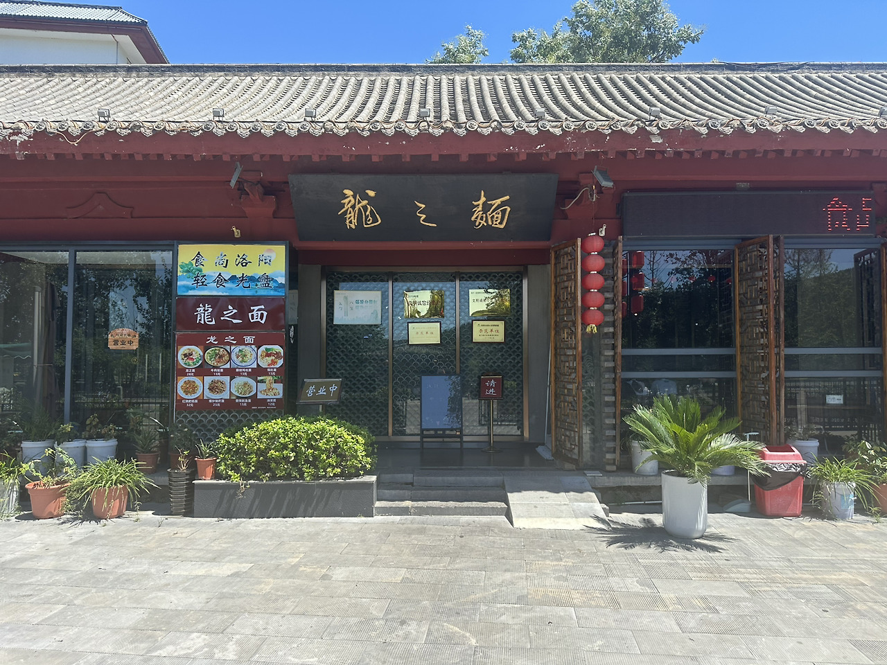 용문석굴 외에도 이수의 동편에는 향산사라는 사찰이 있어. 이 사찰은 당나라 시인 백거이와 중국 국민당 주석 장개석의 흔적을 찾아볼 수 있는 곳이야. 향산사에 도착할 즈음에는 오전부터 찌는 듯한 더위와 수많은 인파에 시달려서 사찰이 눈에 잘 들어오지 않더라고. 향산사를 대충 둘러보고 언덕배기를 내려와서 좀 쉬기도 하고 점심도 먹을 겸 식당을 찾았어. 주변 식당을 둘러보다가 용지면(龙之面)이라는 그럴듯한 이름의 식당을 찾았어. 워낙 면을 좋아하는 사람이라 식당명을 보자마자 들어갔어.