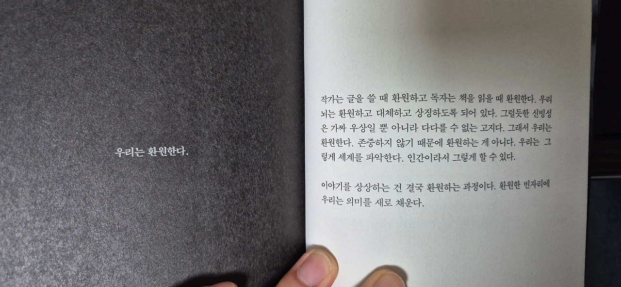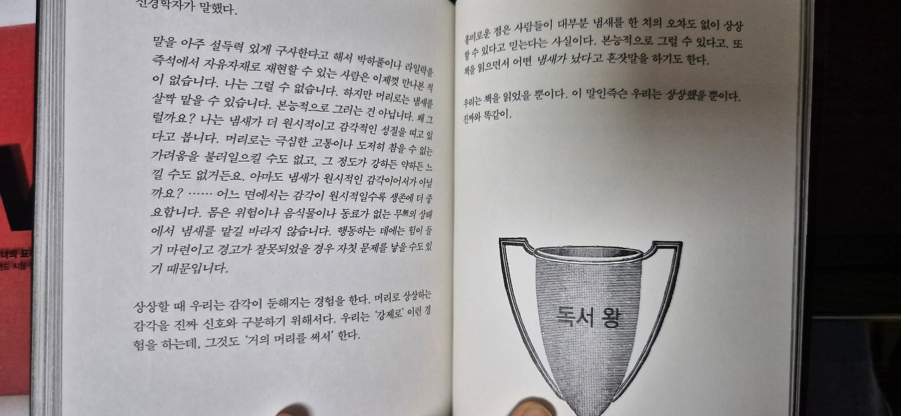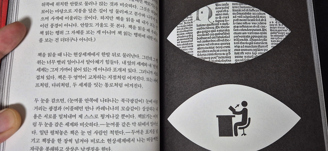 두 번째 책『책을 읽을 때 우리가 보는 것들』은 지금껏 내가 읽어 본 그 어떤 책과도 차별되는 기상천외한 레이아웃을 보여주는데, 이를 통해 저자는 '책을 읽는다는 것이 무엇인가', '책을 읽을 때 우리 눈과 머리, 그리고 마음 속에 어떤 일이 벌어지는가'에 대한 '거의 현상학적인 통찰'을, '거의 만화적으로' 보여준다.