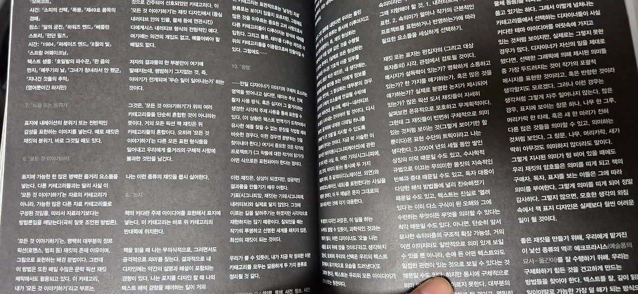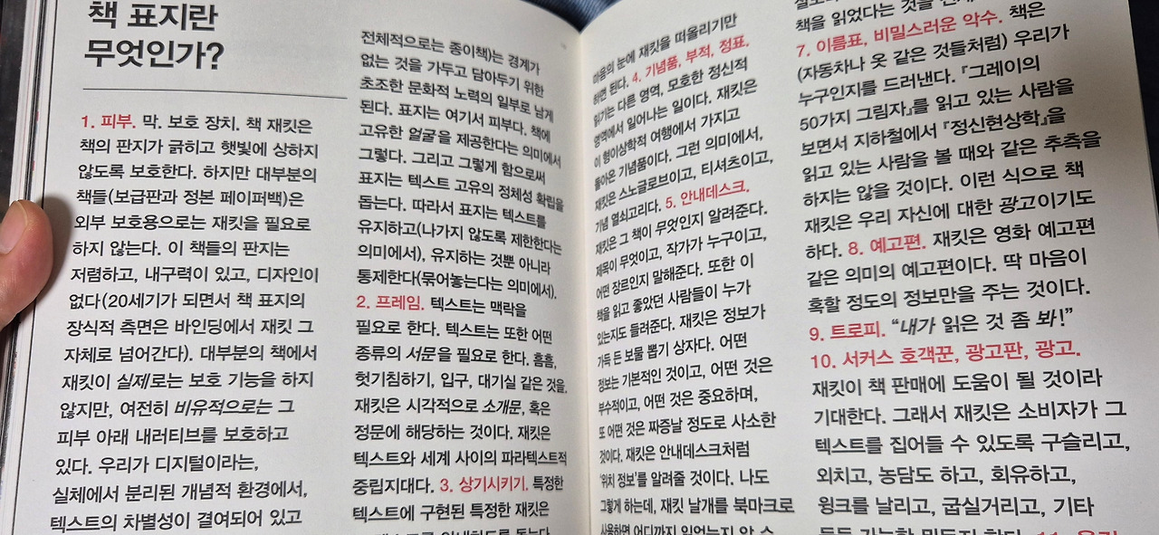션 홀의 기호학, 피터 멘덴선드의 책 모두 감사하게도 나에게 '책의 미학', '책의 경험'이라는 측면에서 매우 신선한 경험이 되어주었다. (신학교에서 경전을 취급할 때 이후로 이렇게 '책 자체'에 관하여 깊게 사유해 본 일이 없는 것 같다.) 다만, 여전히 실무적인 절차와 요령, 그리고 책이라는 물건의 '속살(내지)'에 대하여 나는 지식과 경험은 미천하다. 앞으로는 습작과 함께 이 부분에 대한 부족한 상식과 경험을 채워가야 할 것이다.
