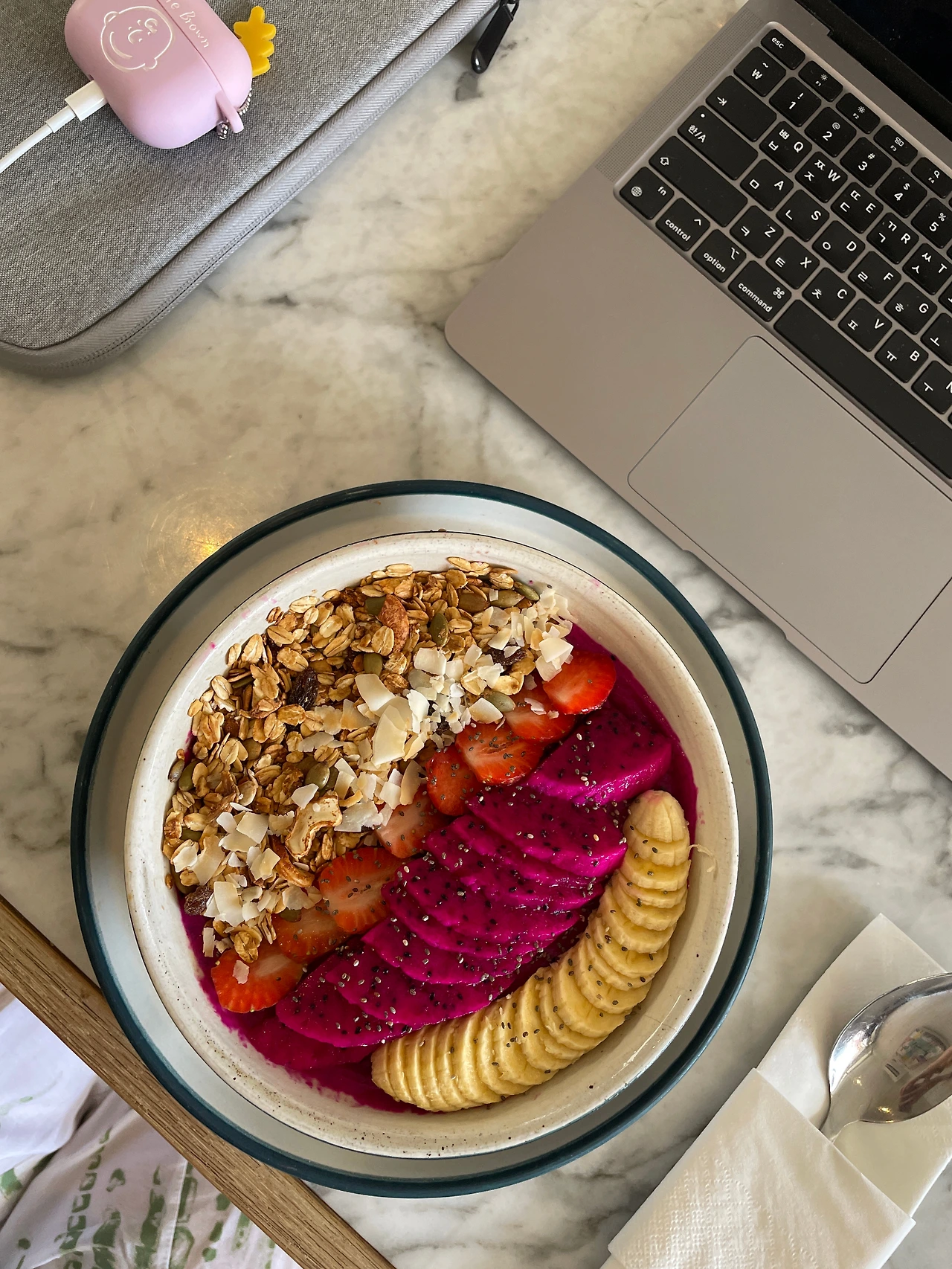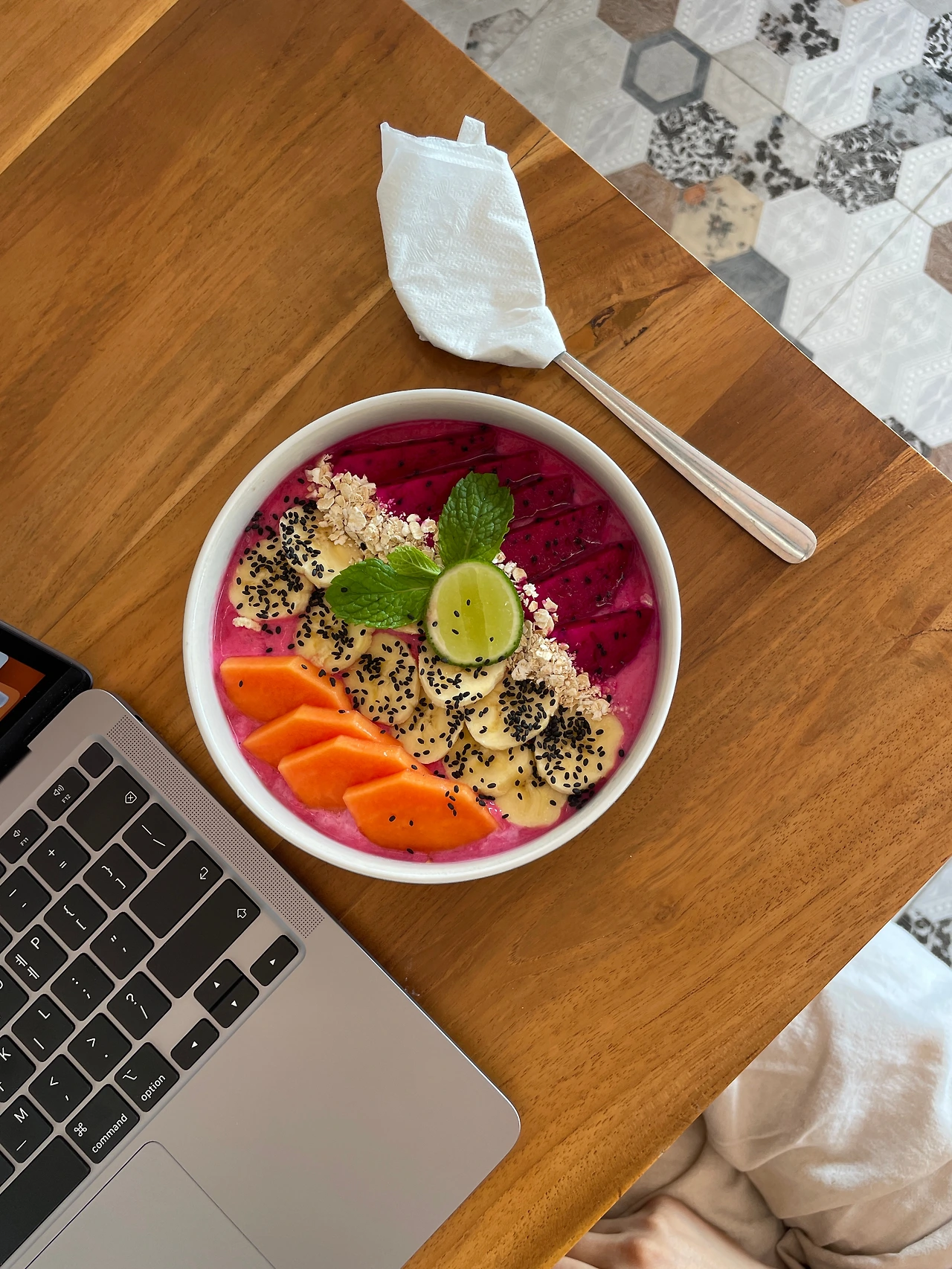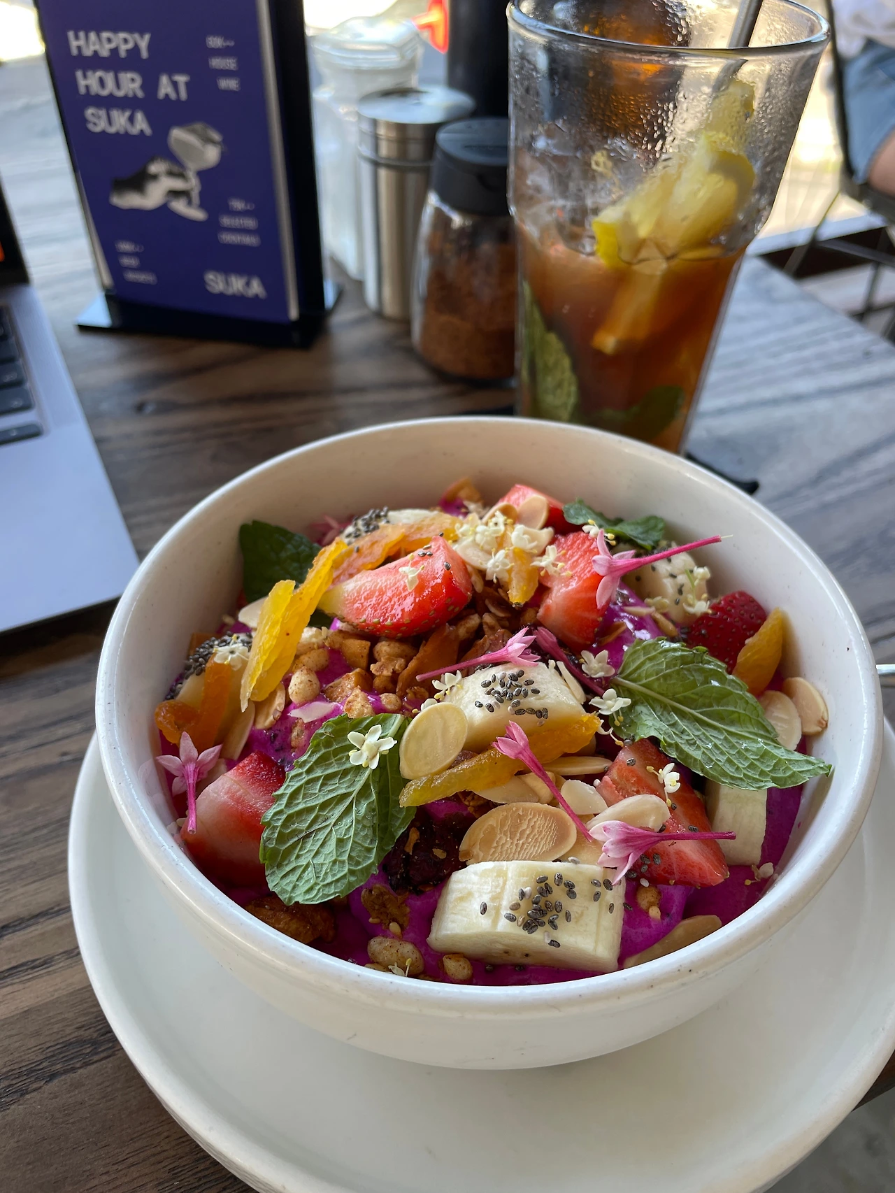 내가 발리에서 사랑에 빠진 것 중 하나가 바로 스무디볼이다. 실제로는 설탕이 많이 들어가서 그렇게 안 건강하다지만(?) 매우 건강해 보이는 요구르트+과일+견과류 파티. 내가 이거에 빠져서 한국 돌아와서도 혼자 치아시드랑 냉동과일 사서 열심히 스무디를 해 먹었더란다. 특히 용과(Dragon Fruit)가 색깔이 너무 예뻐서 먹을 맛이 났다.