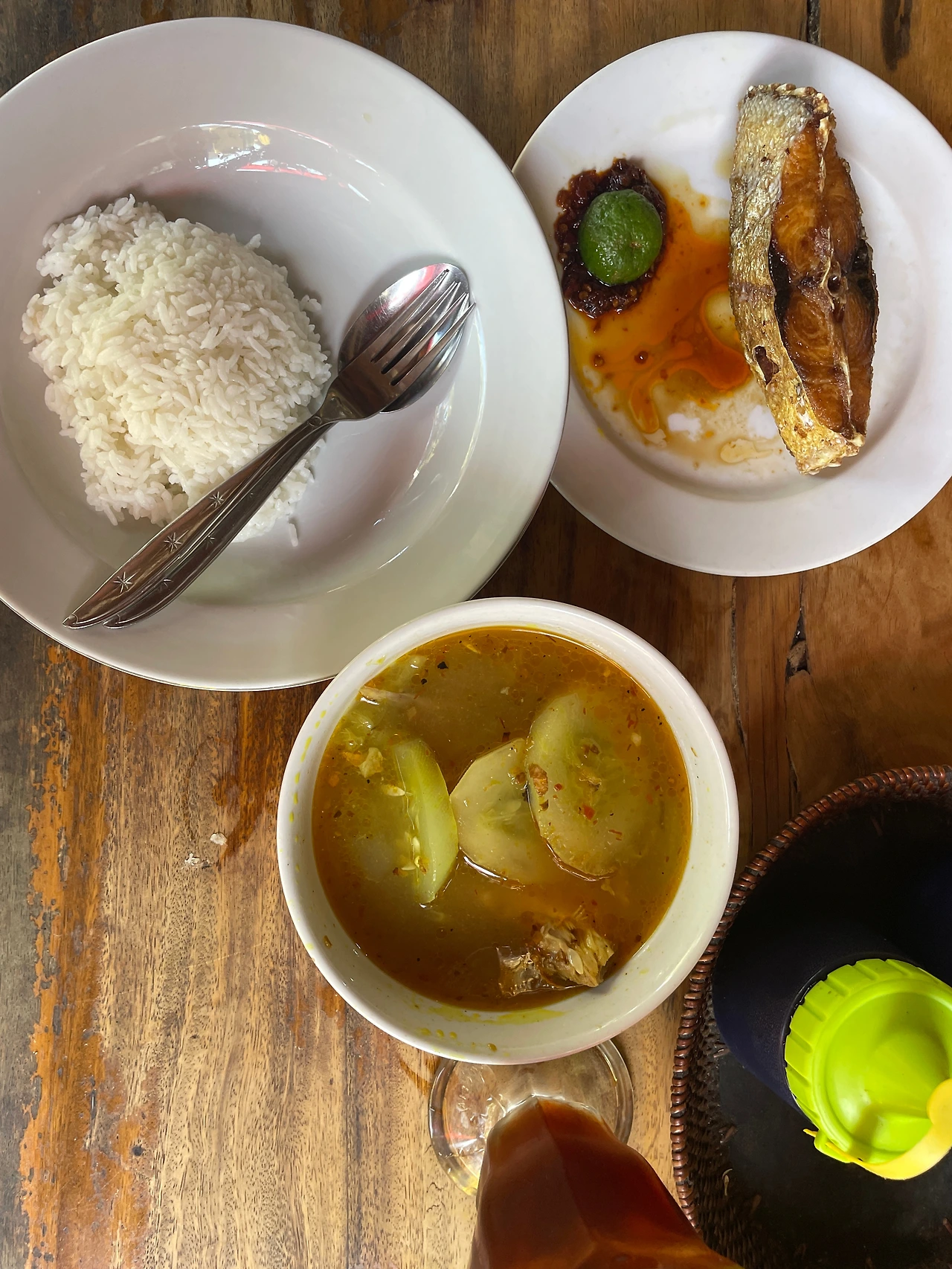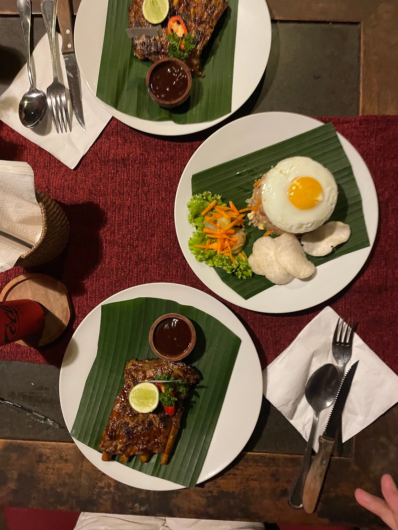 보통 새로운 사람을 만나거나, 기분 좀 내고 싶을 때 이 가격대의 식당들을 찾았다. 처음 방문한 곳은 유명한 바비굴링집이었다. 묵고 있는 숙소의 옆방에 새로 들어오신 한국인 부부께서 이 식당을 추천해주셔서, 냉큼 바이크를 빌려서 찾아갔다. 바비굴링는 돼지고기 덮밥이라고 보면 되고, 사태는 돼지고기 꼬치다. 단일 메뉴만 시켰다면 4천 원에 먹었겠지만, 혼자 멀리 맛집 찾아간 김에 다 먹어보고 시켜서 통 크게(?) 6천 원어치 시켰다. 발리에는 태국음식들도 많이 파는데, 대체로 인도네시아 음식보다는 비싸다. 대신 맛은 정말 태국음식 맛을 기가 막히게 잘 낸다. 가까워서 그런가. 우리나라 매운탕 맛이 똑같이 나는 생선구이 맛집도 찾았다. 현지인들이 줄을 서서 기다리는 곳이라길래 가봤는데 과연, 너무 맛있어서 두 번 갔다.