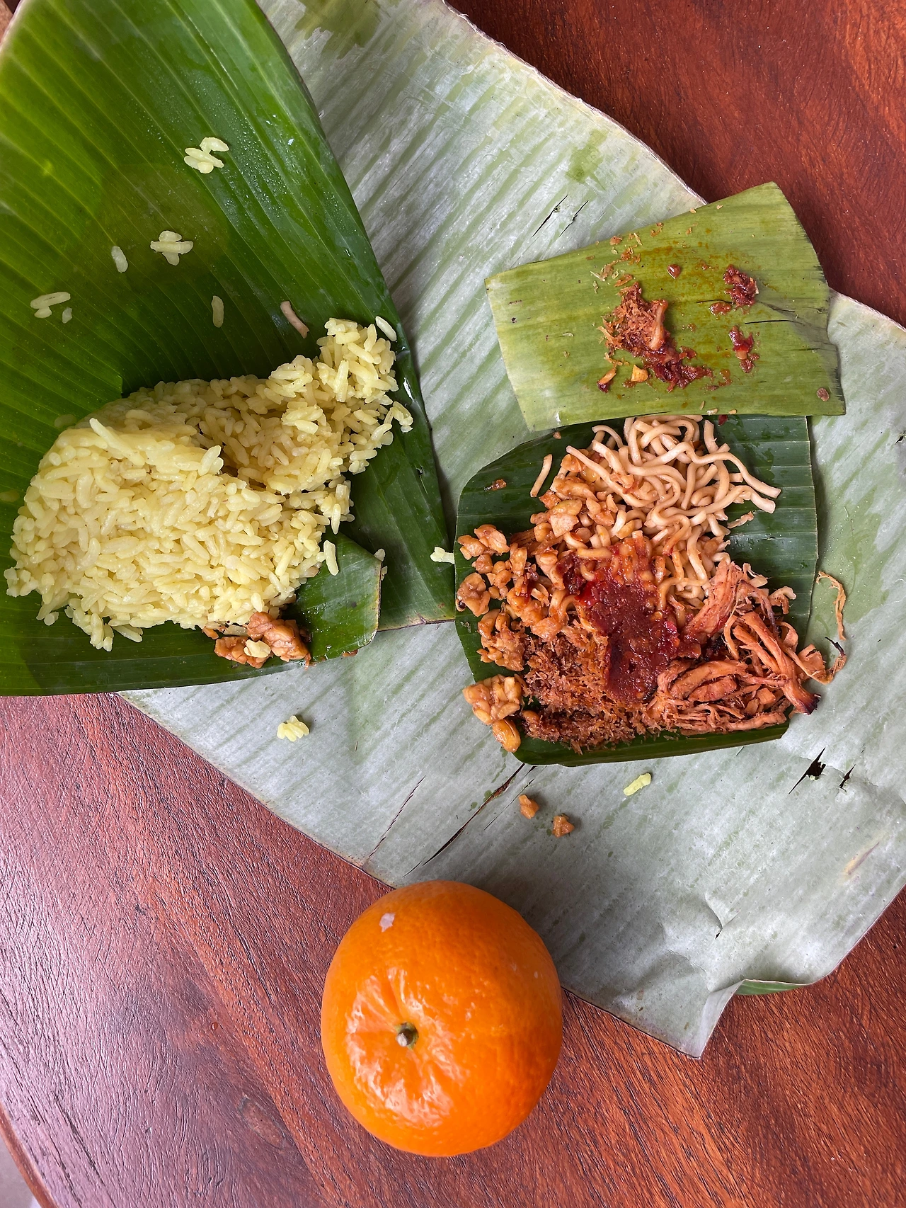 현지인들의 식사다. 간판이 달려있지 않은 식당들은 보통 현지인들이 많이 찾는 간이식당인데, 거기서는 천 원으로 식사를 해결할 수 있었다. 환율 따지면 정확히는 800원이다. 아침 7시경에는 거리를 걷다 보면 노점상이나 문방구같이 생긴 가게들이 있는데, 거기서 바나나잎으로 싼 미니 식사를 단돈 500원에 팔고 있다. 정말 놀랍다. 닭고기도 들어있고, 구성이 꽤 알차다. 아침에 어차피 많이 먹지도 않는지라 오백 원에 한 끼 식사는 정말 가성비 넘쳤다. 이런 가게들은 관광지 한복판에 있지 않고, 도심에서 조금 벗어난 외진 길목에 주로 자리잡고 있다.
