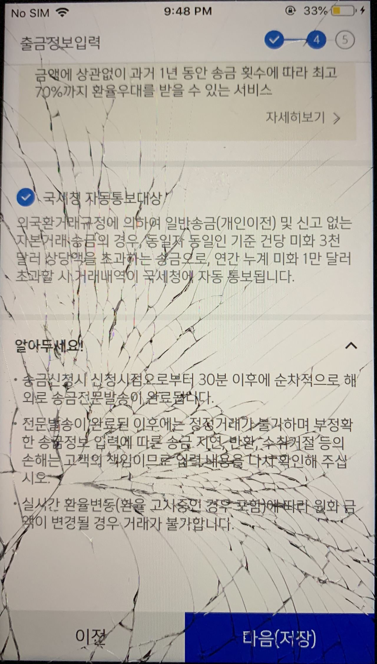 해외 유학생 체제비 등 주기적으로 송금하는 주요 고객들은 이 과정이 다 익숙하고 쉬운지 모르겠으나 일회성 송금 사용자에게는 모든 용어가 너무 낯설고 어려우며 혹시 잘못한 건 아닐까 스스로 계속 의문이 드는 상태로 컨펌 버튼을 누르기가 꺼려지는 좌절의 경험이었다. 정말 저 모든 항목을 다 입력받아야 하는 건가요? 이번만은 카카오뱅크에게 박수를 보내고 싶다.