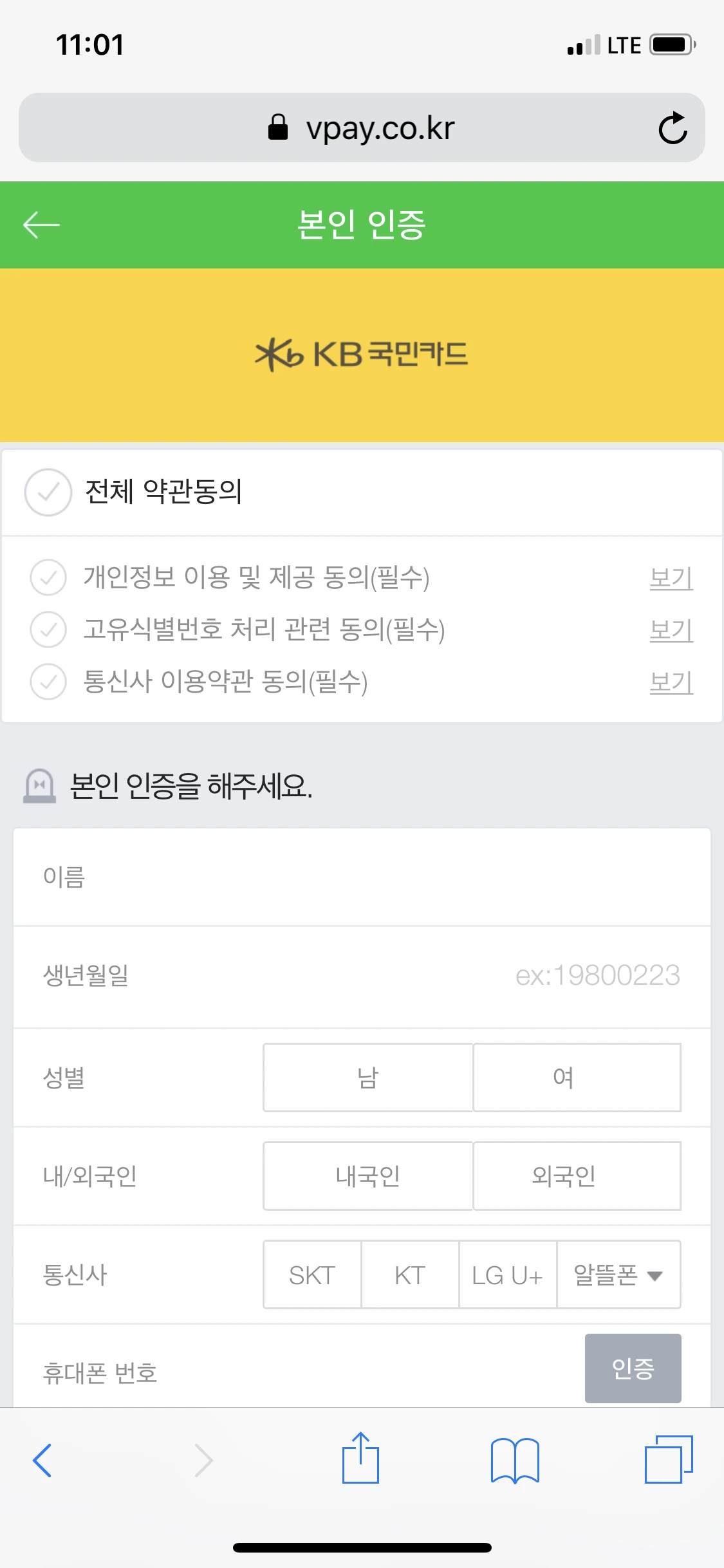 국민카드는 약관동의에 본인인증을 따로 받는다. 카드사마다 약관 정책이 달라서 프로세스가 다른 거겠지?