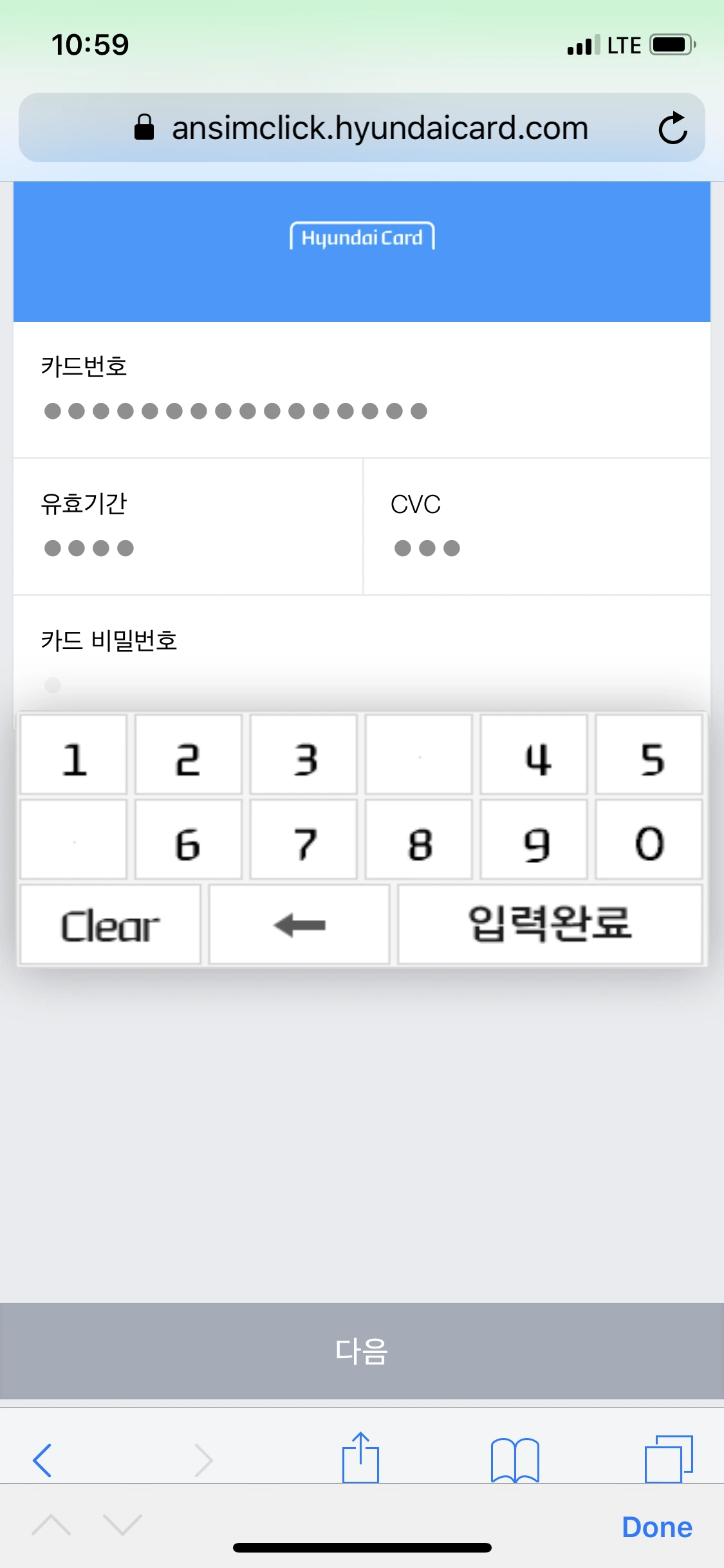 세젤싫, 가상키패드 제대로 눌렀는지 확인도 안되는데 현대카드는 16자리를 다 누르게 만들어놨네? 하핫 게다가 입력중 •는 왜 더 흐려지는거야? ’다음’버튼은 회색이라 비활성인줄 알았다.