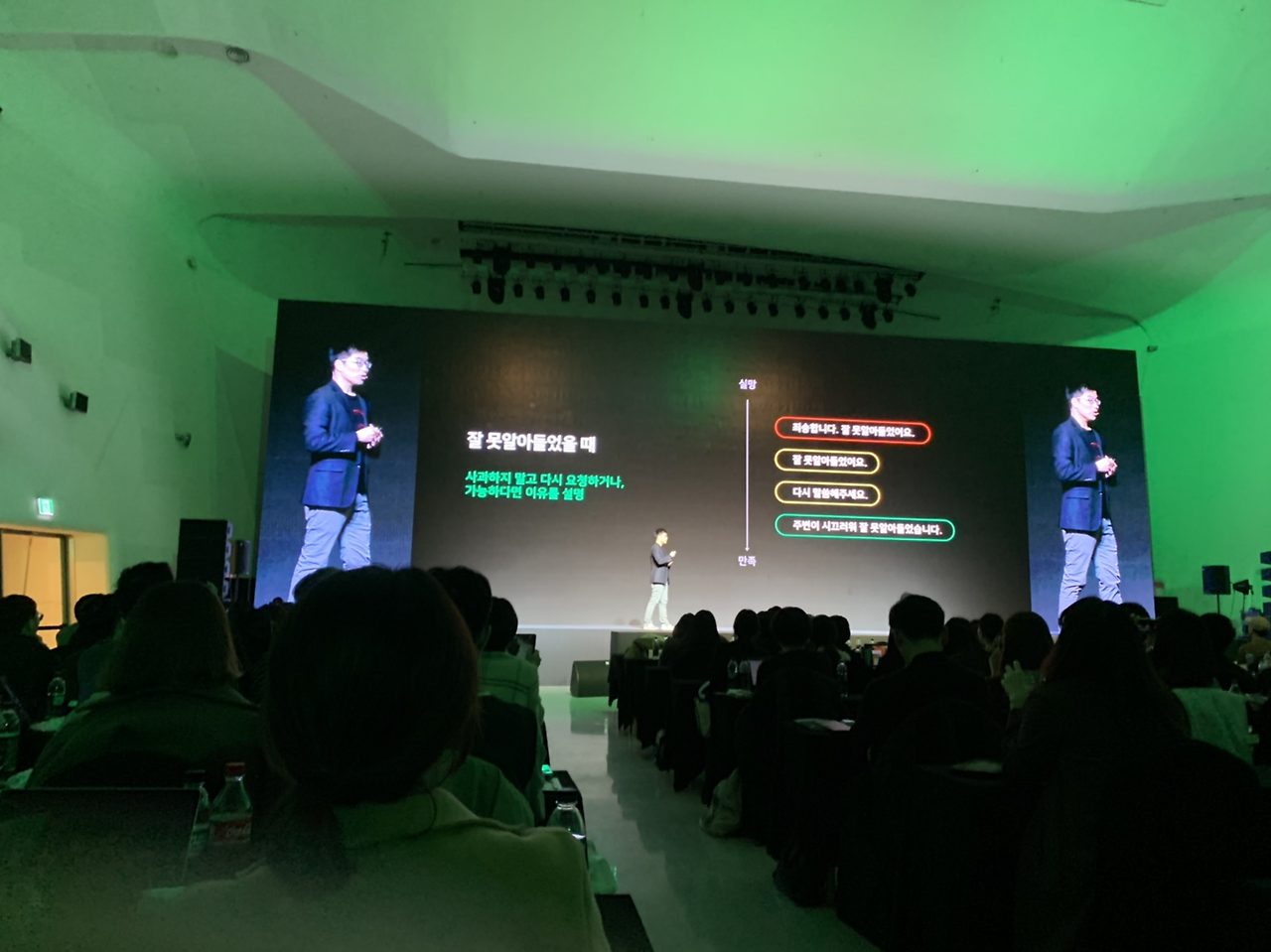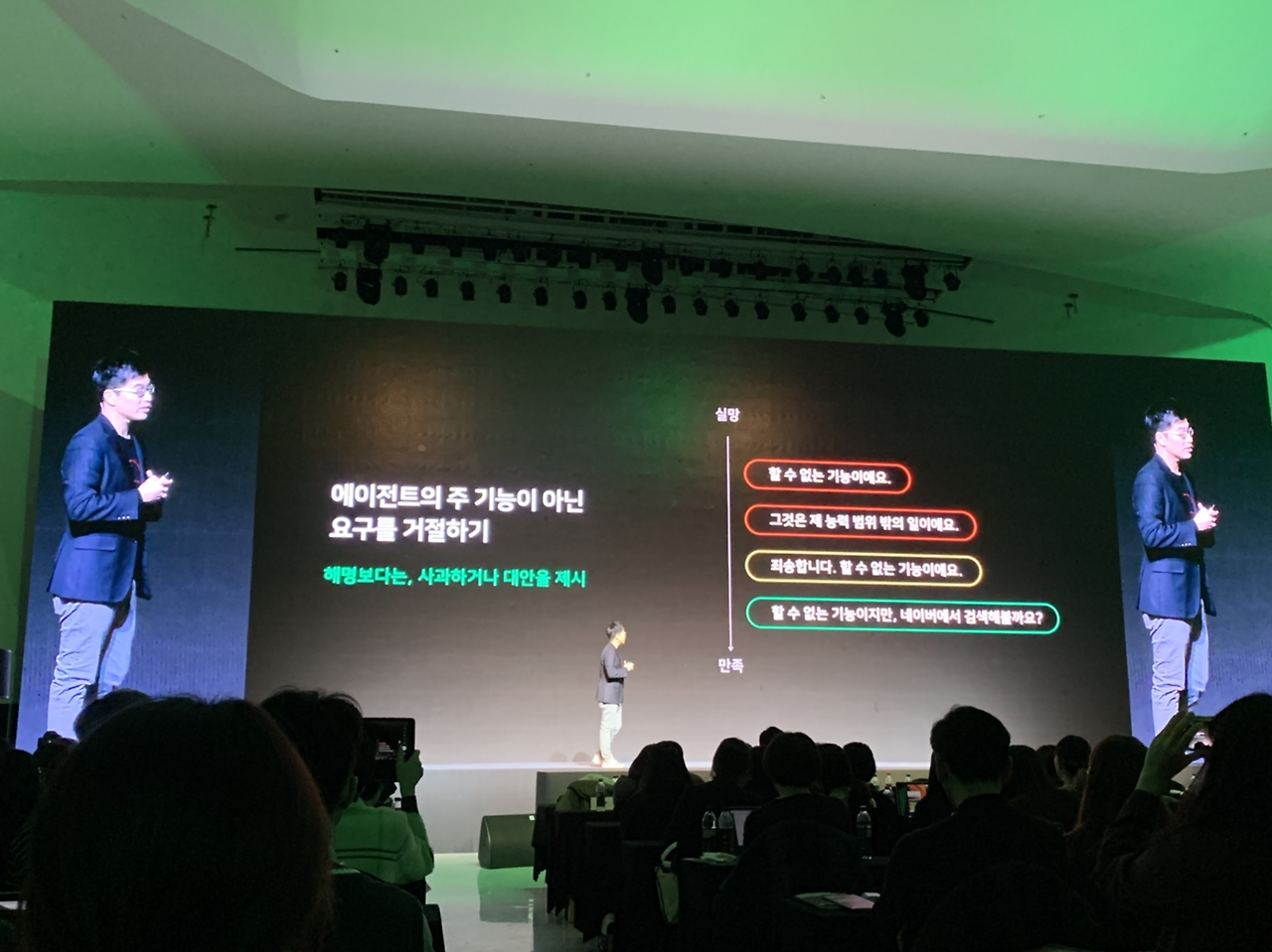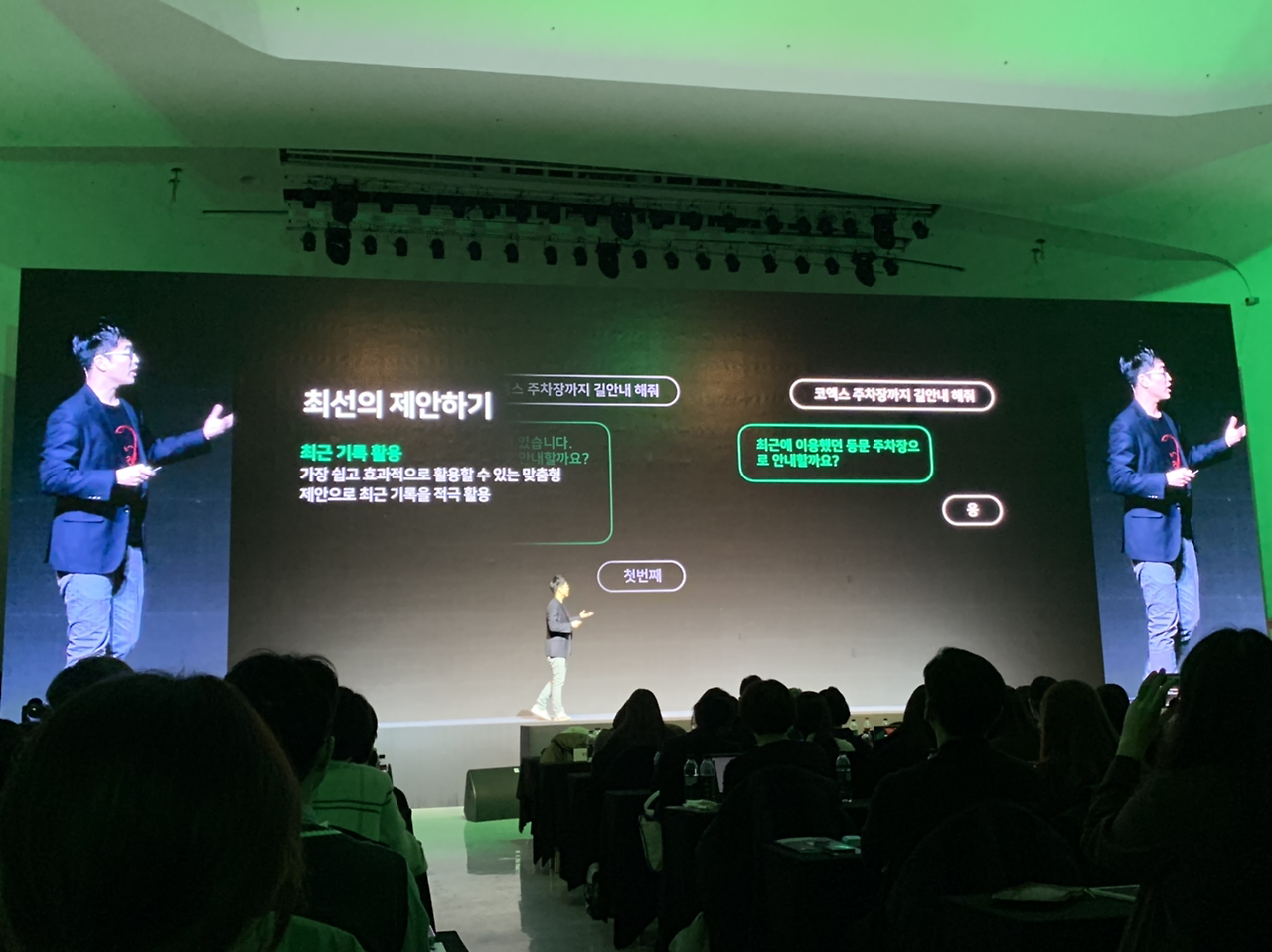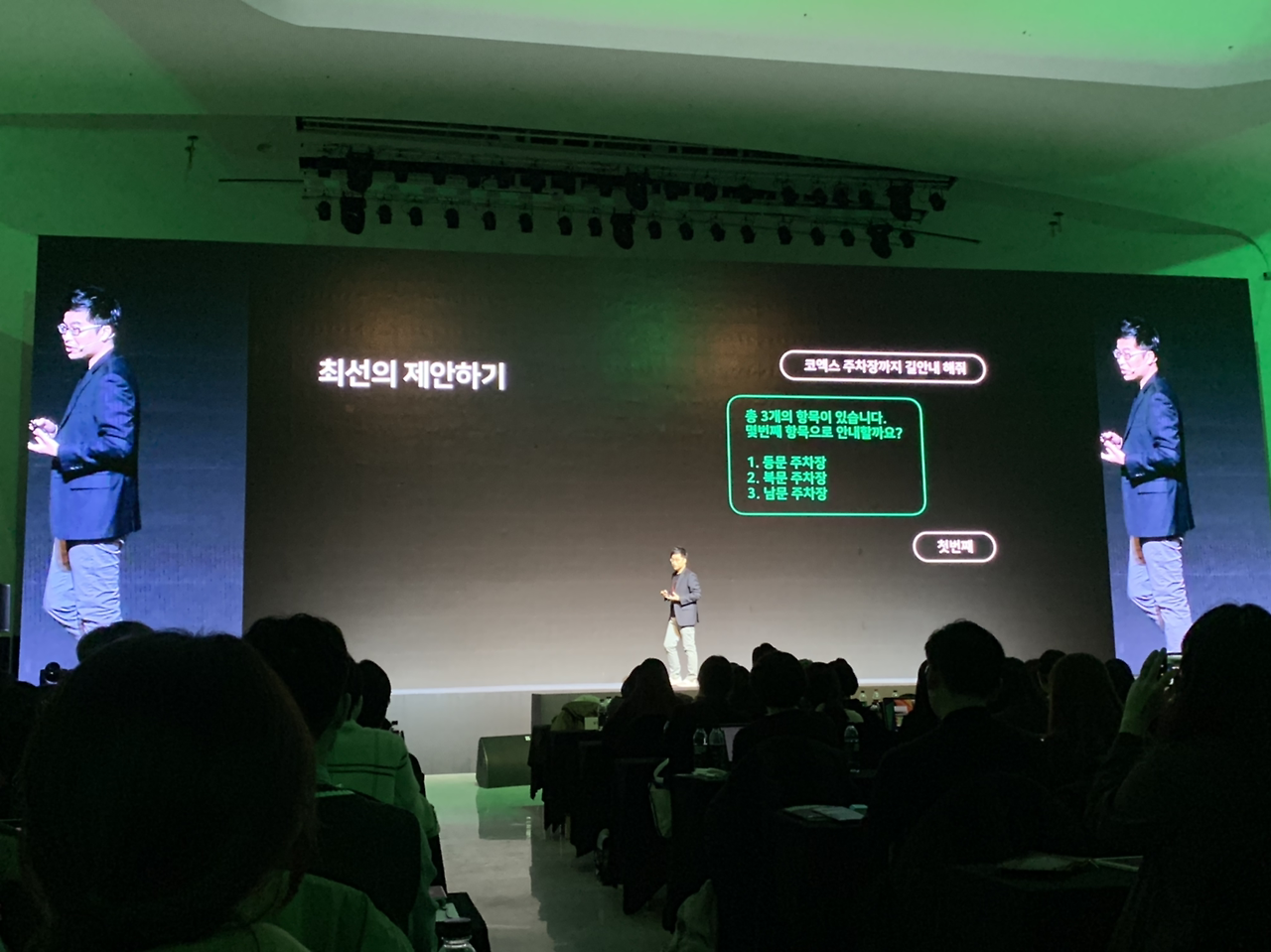 사실 가장 기대한 세션인데 인쇄책자에 있는 내용과 거의 그대로여서 조금 실망... 그래도 Voice UI에서 사용자에게 옵션을 제공할 때 GUI와는 다르게 1,2,3 옵션을 제공하기 보다는 기존 사용 내역이나 컨텍스트를 통해 최적의 안을 먼저 제안하는 것이라든지, 사용자는 Voice agent를 생물(?)로 인지하기 때문에 페르소나를 잡는게 중요하다든지 하는 중요한 몇가지 포인트를 짚어주었다. 몇개월 후 산학이 마무리되면 더 의미있는 공유가 가능할 것으로 기대.