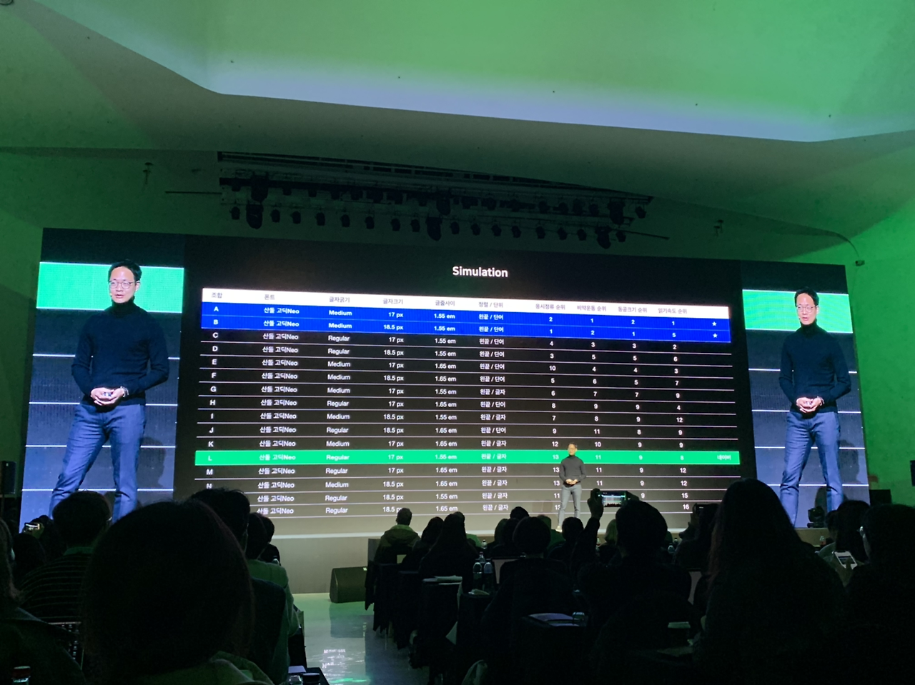 이 세션의 재밌는점은 마루프로젝트는 한글의 정통성을 계승하기 위해 부리꼴(명조체?) 계열의 디지털 서체를 개발하는 프로젝트인데 반해 함께 프로젝트는 모바일 가독성에서 고딕체의 압승이었다는점?ㅎㅎ