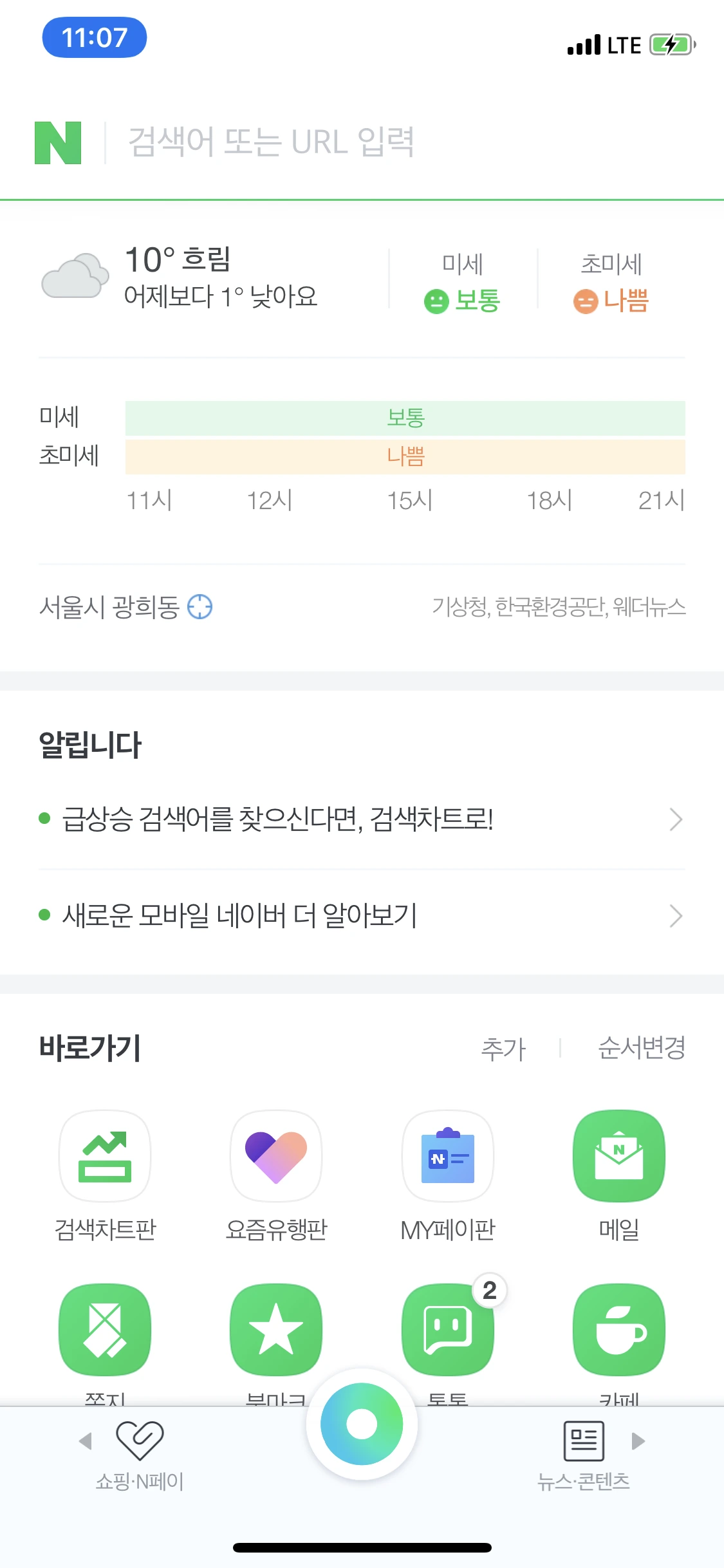 그래서 베타앱을 켜보았다. 미세먼지가 나쁜 상황에서는 미세먼지 정보를 우선 보여주고 보통으로 돌아오자 시간별 날씨정보로 바뀜