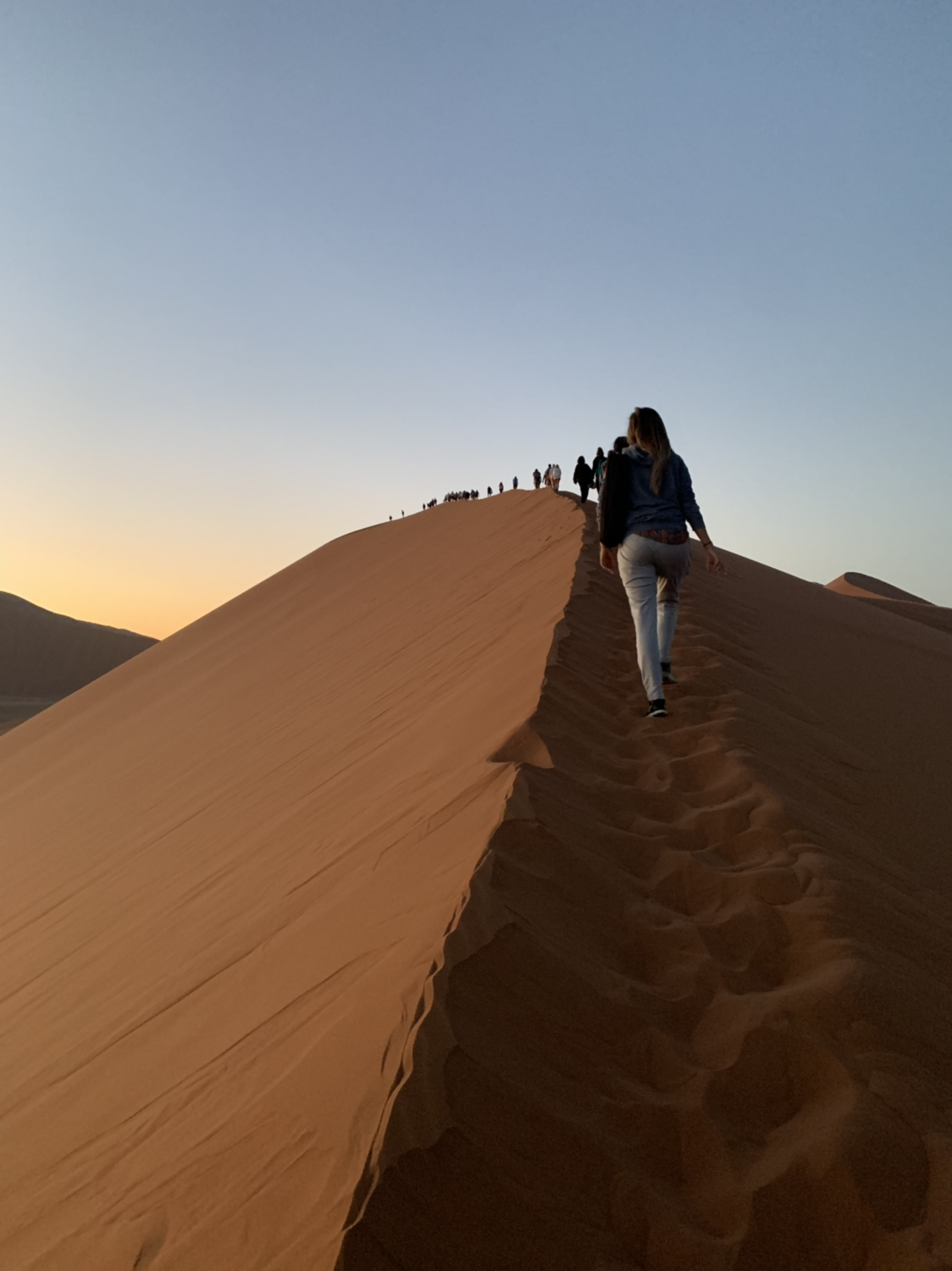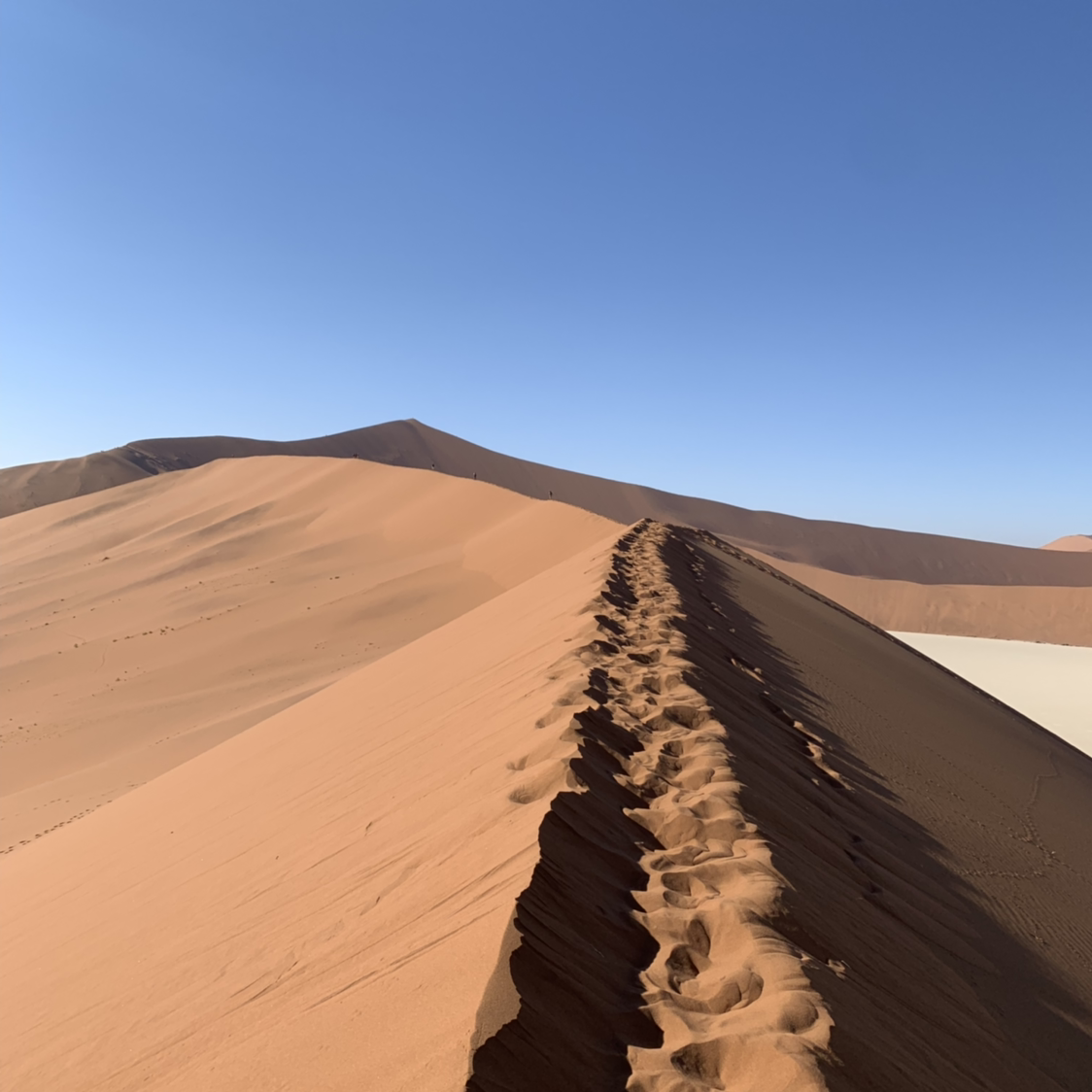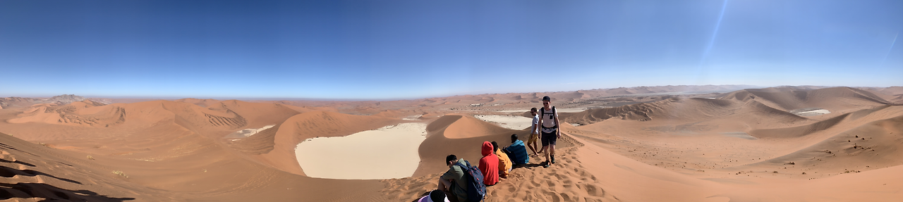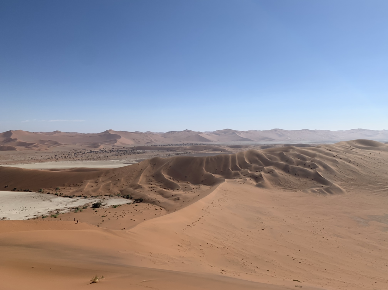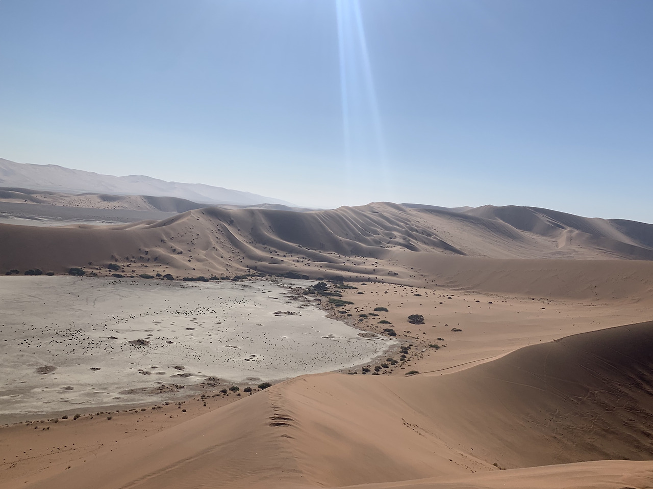 다음은 Deadvlei 높이가 300m라서 Dune45에 오르길 포기했던 나는 잠시 쫄았으나 가파르기가 Dune45보다는 낫다는 말에 용기내어 오르기로 했다. 정상에서 보는 풍경이 절경이라길래 정상까지 올랐는데 사실 가는 길에 본 풍경이 더 아름다웠고 경사로로 내려오는 게 훨씬 재미있었다. 모래에 푹푹 발이 빠지며 순식간에 달려 내려오는 재미는 해본 사람만 알 수 있지 ㅎㅎ