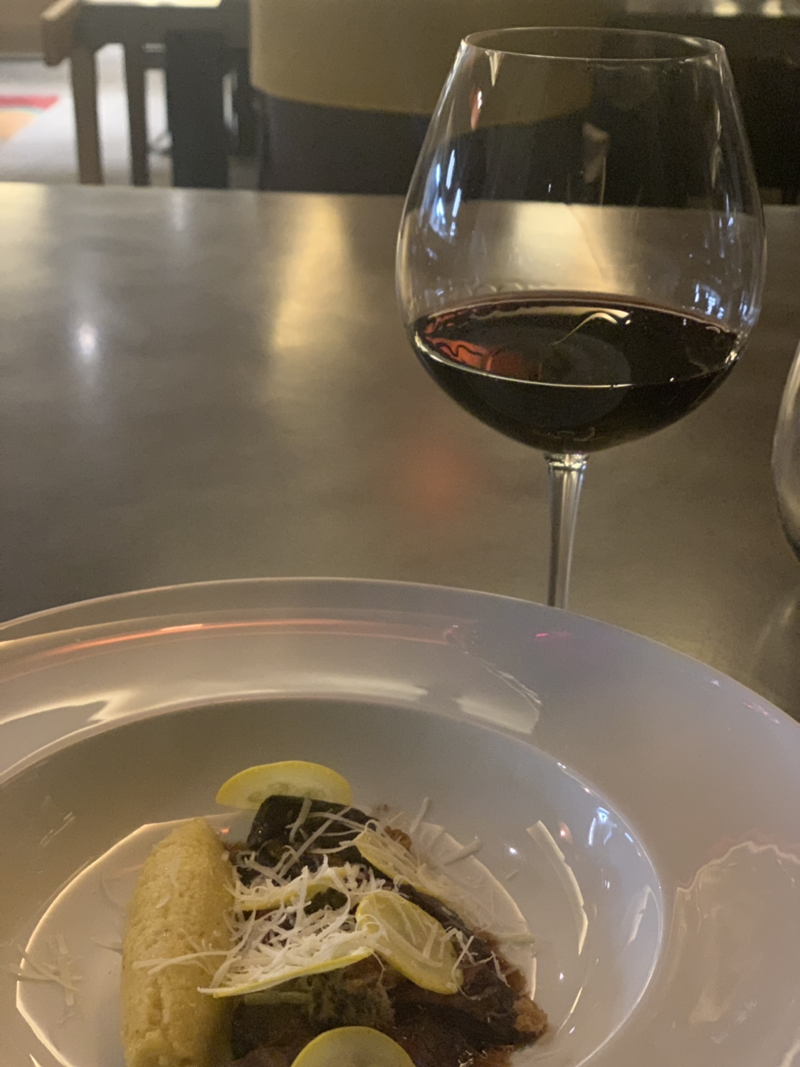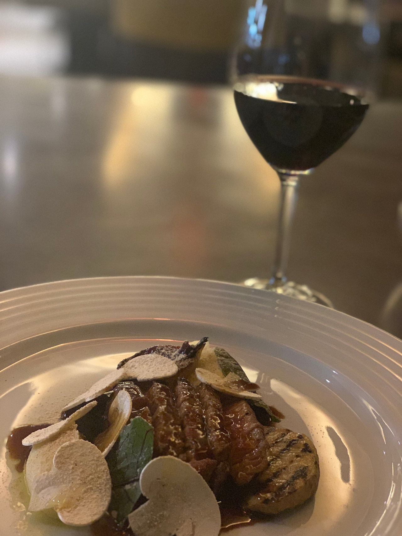 Lowerland famieliemeel pap, grilled ox heart, Jamestown aubergine, tomato - HV pinotage 2015
