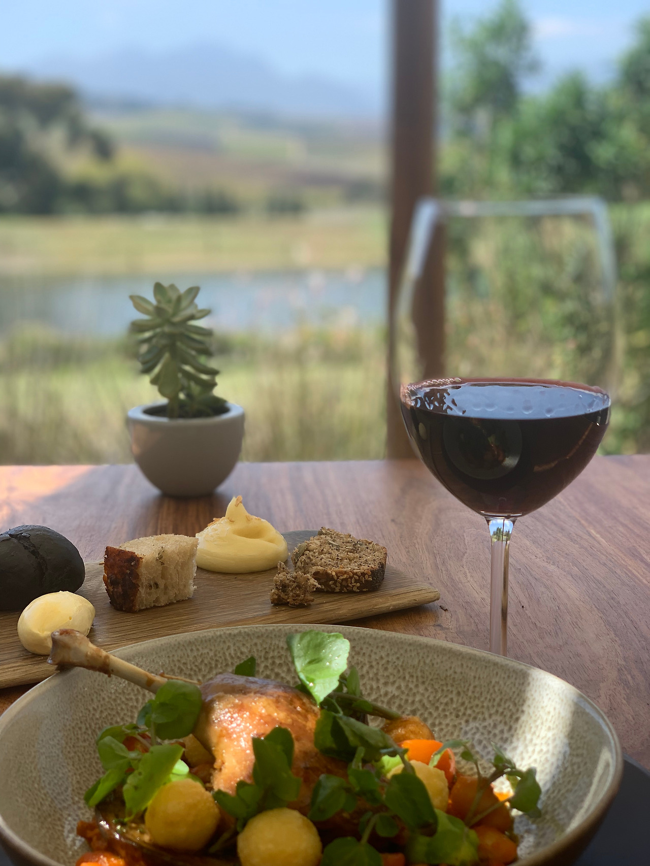 Confit kroon duck leg, tomato and white bean stew, grilled aubergine, roasted vine tomato with basil - Jordan the prospector Syrah 2015(tobacco and tannic)