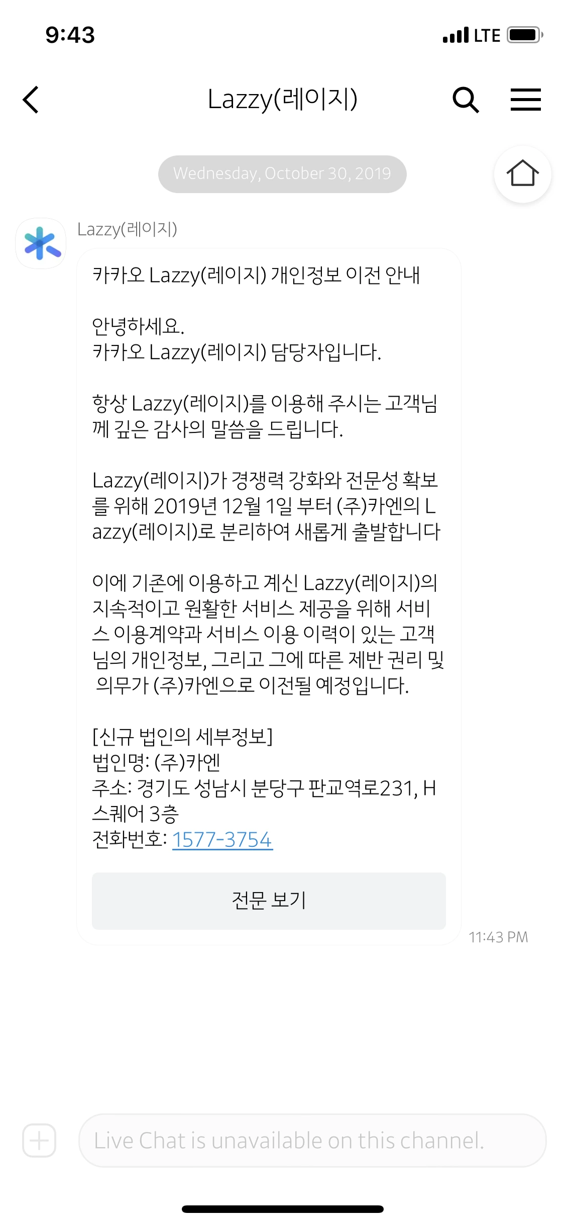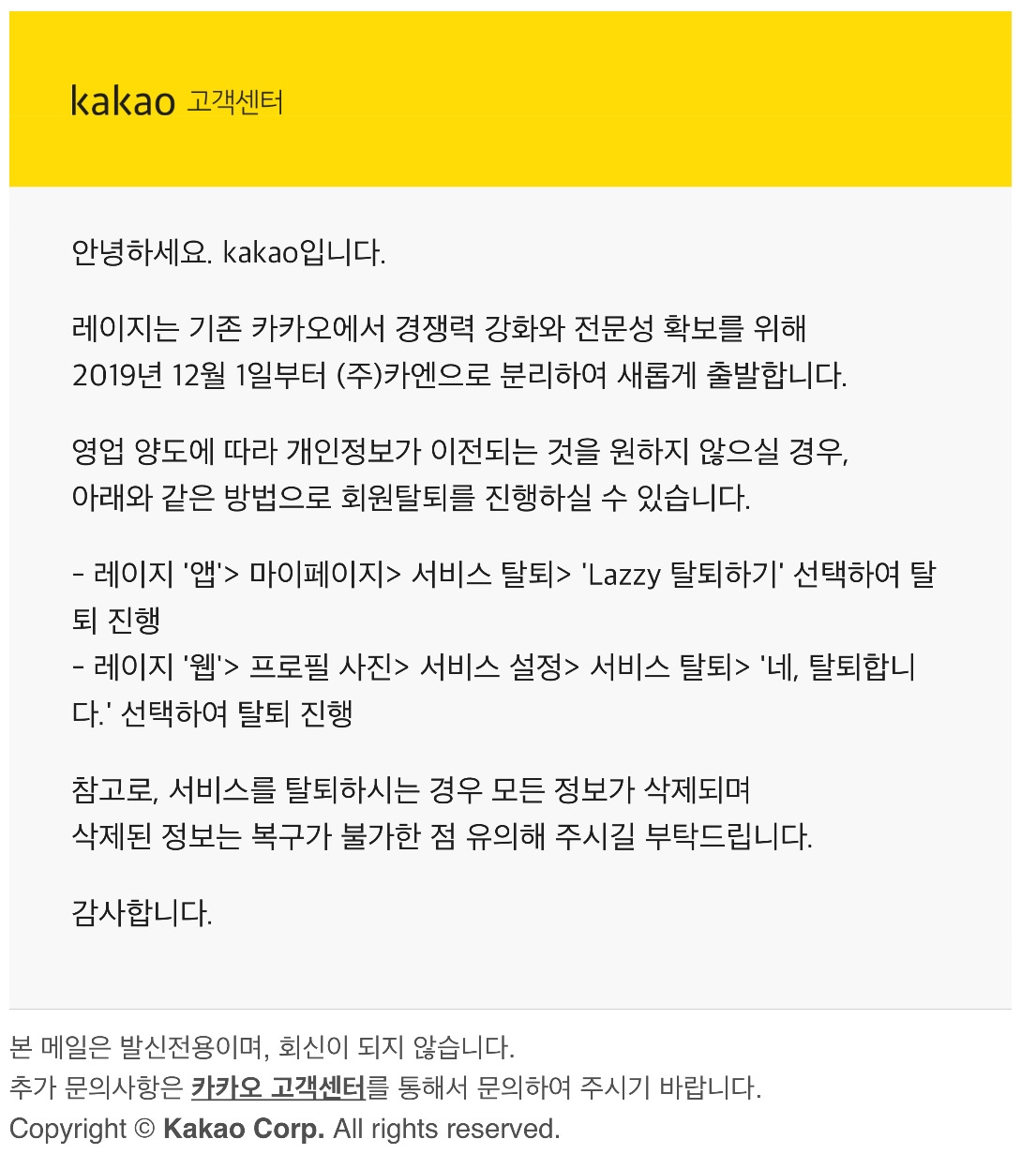 이게 뭔 소리지? 항상 레이지를 이용해줘서 감사하다고? 듣본데? (또) 개인정보 유출됐나? 온갖 생각이 다 들었다. 카카오 관계사라고 해도 믿을 수가 없다. 뭐하는 회산지 어떤 서비스가 분리되어 설립된 법인인지 정보는 하나도 없고 설득할 생각도 없어 보인다.