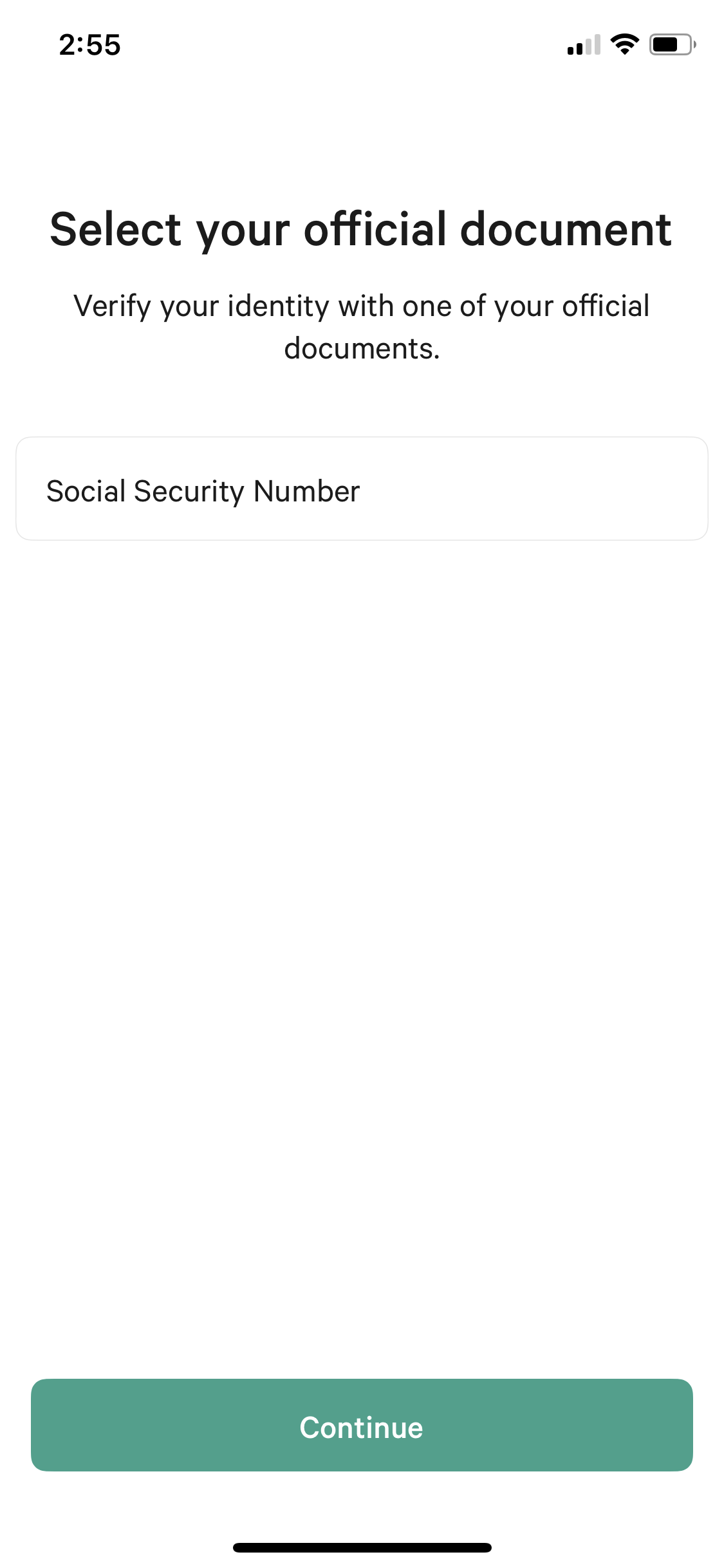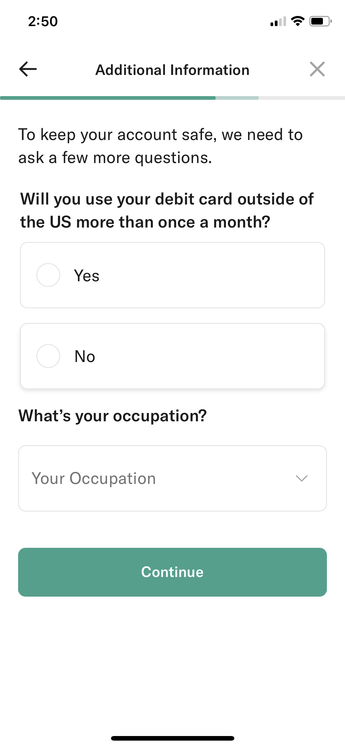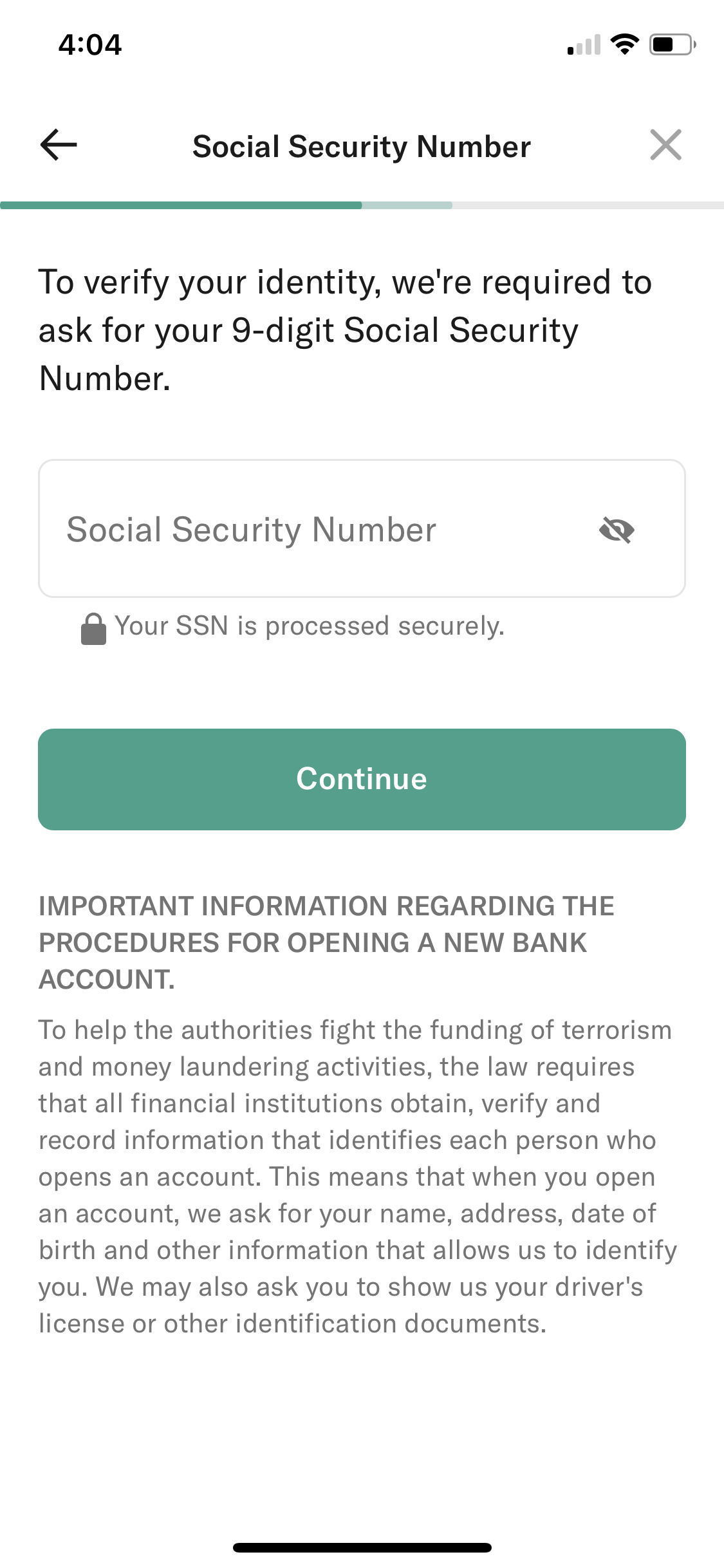 개인정보-주소지입력 및 확인-SSN입력-추가정보(직업 등)-비밀번호 설정 및 약관동의-이메일 인증