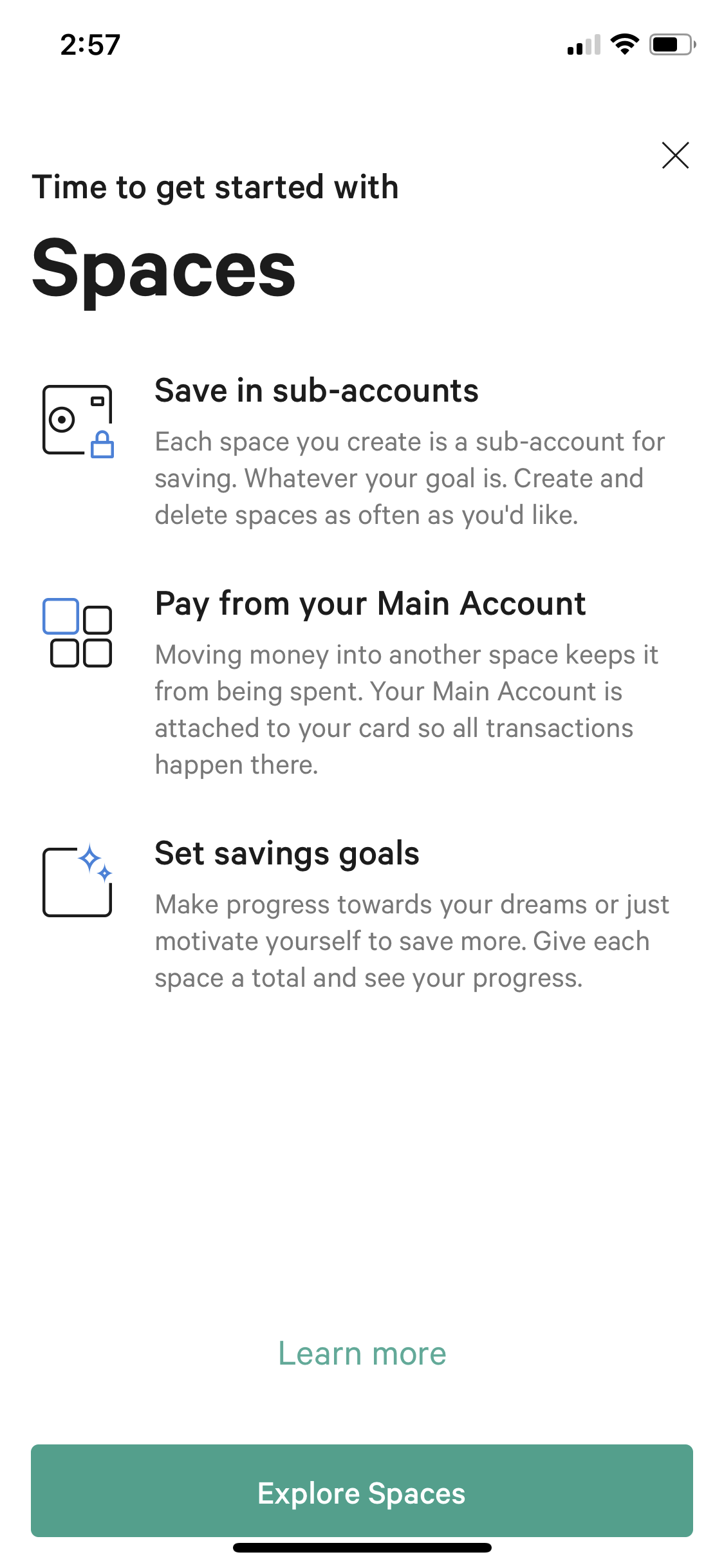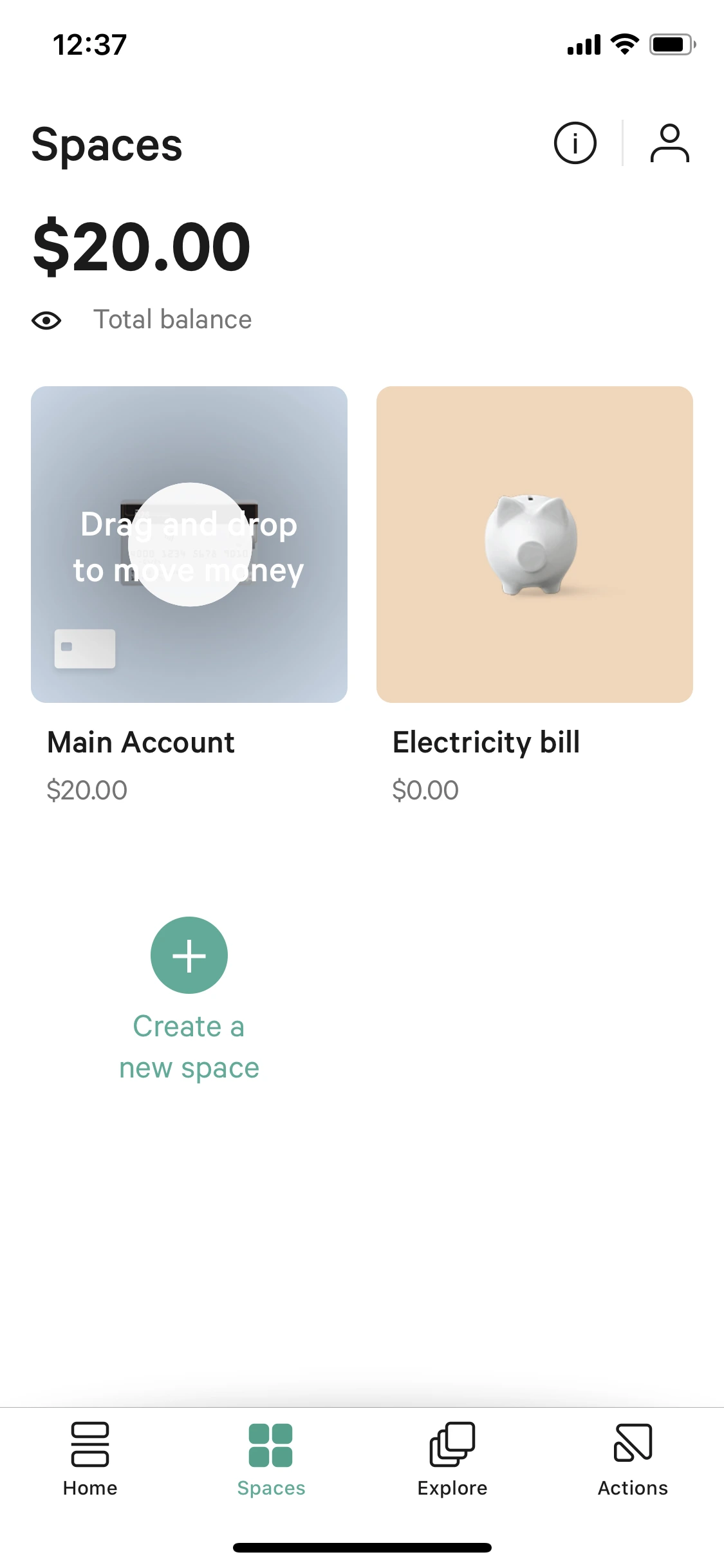 Space는 메인 계좌 안에 서브 카테고리를 만들어 돈을 나누어 담을 수 있는 기능이다. 메인계좌 안에 모든 돈이 다 들어있으면 모두 써버리기 쉽지만 이렇게 나누어 담으면 예산 관리하기도 편하고 상대적으로 지출도 덜하게 된다.