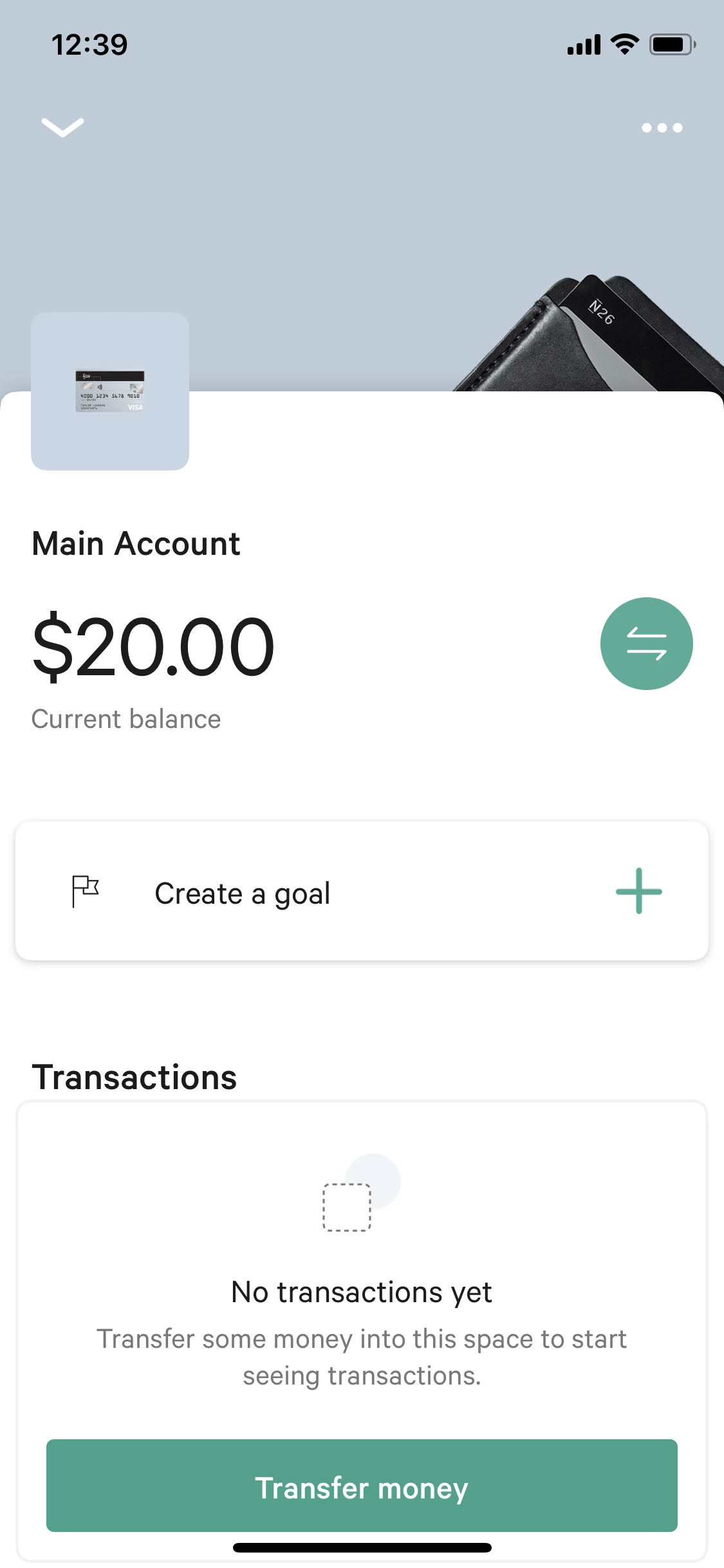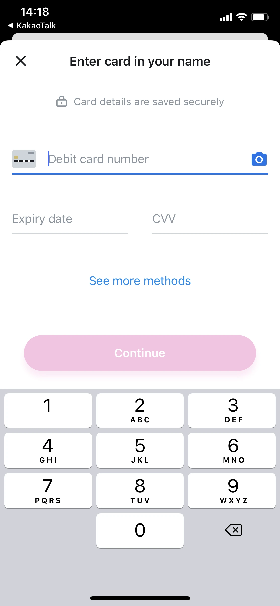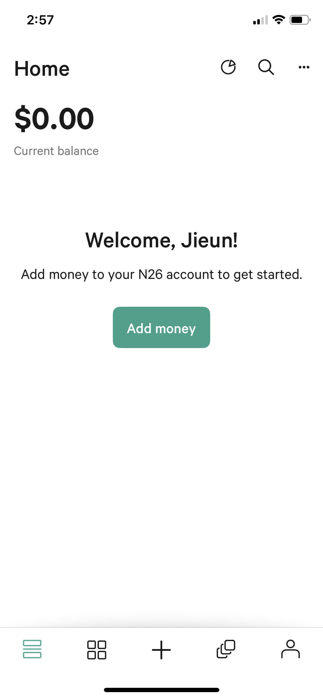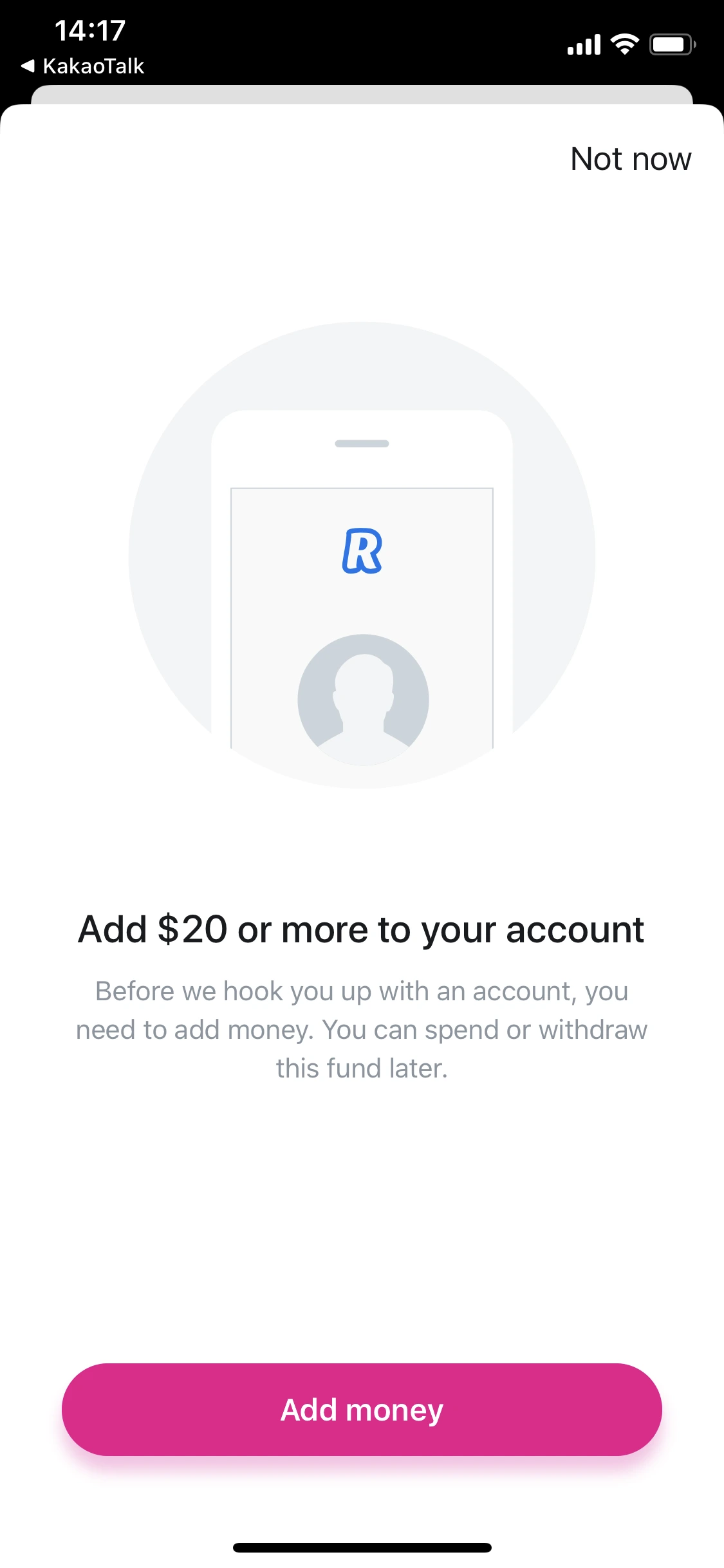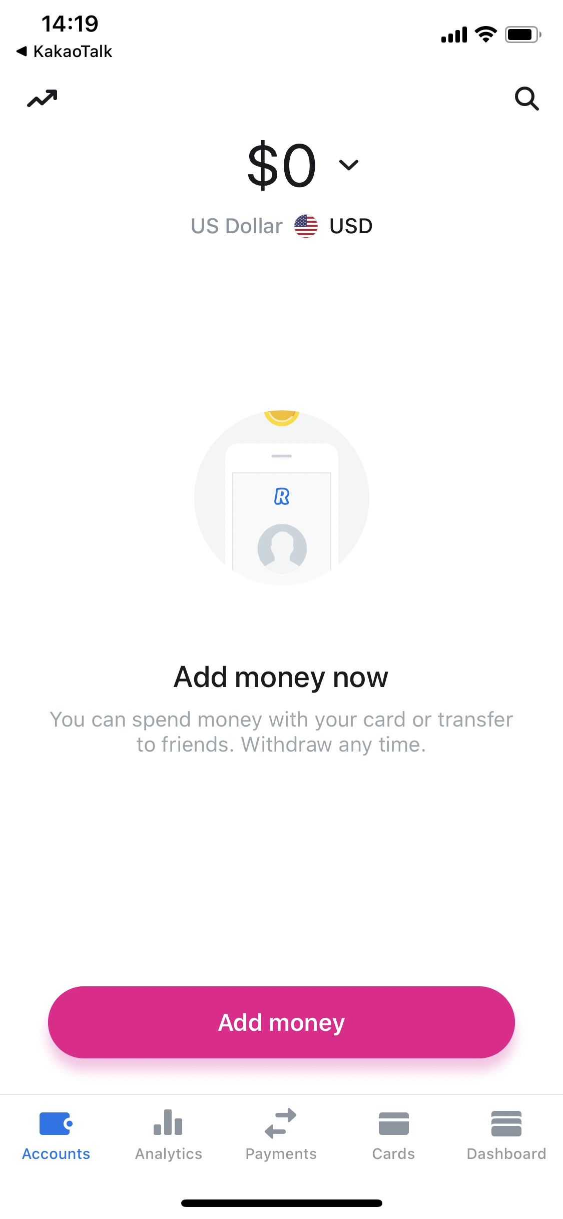 어카운트에 든 돈이 없으니 우선 돈부터 넣으라는 팝업이 뜬다. 다른 은행 카드를 등록해 이체할 수 있도록 설계되어있다.