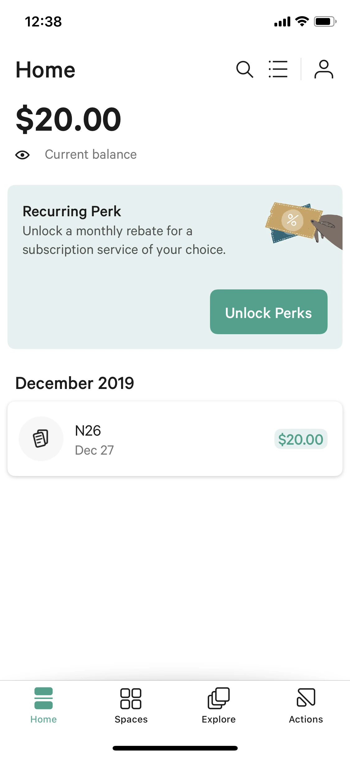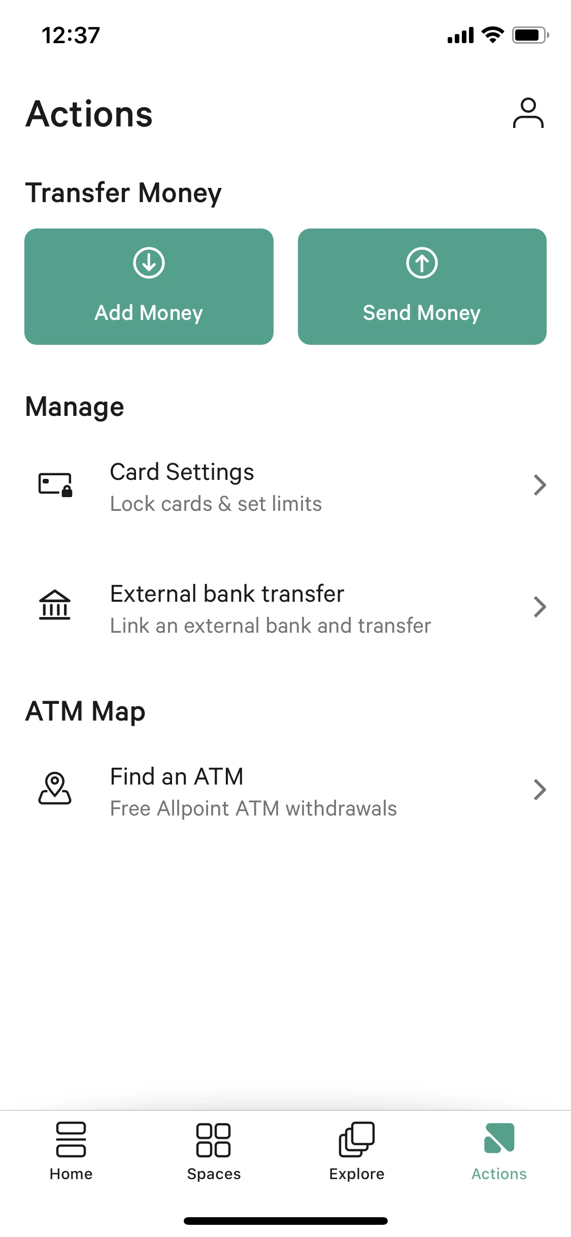 기존에는 Home, Space, Action, Explore, My Account 5개의 탭으로 구성되었던 네비게이션이 My Account를 상단우측으로 올리고 4개로 변경되었다. 그리고 다른 은행에 비해 다소 생경한 Space, Action 등기능을 아이콘만으로는 이해하기 어렵다고 판단한 듯, 서비스 네임을 아이콘 아래 병기하였다. 기존에는 친구들과 돈을 주고 받는 Action기능을 전면으로 내세워 가운데 배치했던 것과 달리 Action 메뉴는 맨 마지막으로 만든 것도 이번 개선의 특징이다. 송금 기능을 통해 사용자를 늘리고자 했던 정책이 아무래도 잘 실행되지 않은 것 같다.