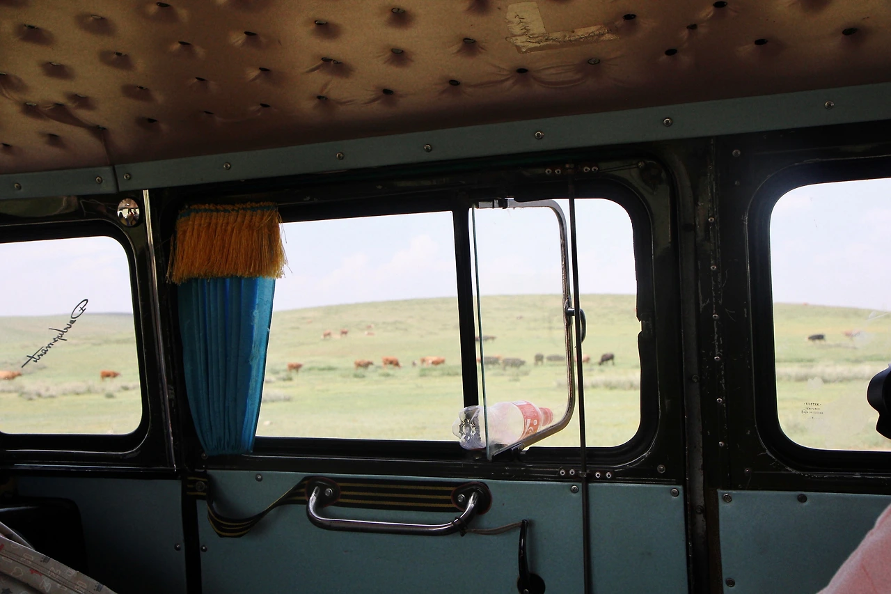 모포 같은 재질의 좌석은 착석감이 어찌나 형편없던지, 비포장 도로가 대부분인 여행 내내 멀미약과 목쿠션이 필수였다. 아 참, 다 마신 콜라 페트병도 한 두 개쯤 남겨놔야 했다. 창문 고정 장치도 없어서 늘 창틀에 페트병을 끼운 채 달려야 했으니까. 가끔 알 수 없는 몽골 가요가 흘러나오던 낡은 라디오가 이 자동차의 유일한 신문물처럼 느껴졌다. 우리가 탄 푸르공이 유독 고물이었는지도 모르겠지만, 그야말로 굴러가는 게 신기할 지경인 자동차였다.