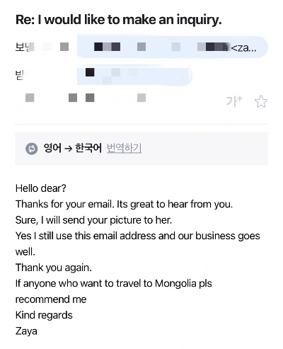 너무 오랜 시간이 지난 터라 여행사가 아직 운영 중일지, 메일 주소는 그대로일지 알 턱이 없었다. 돈도 되지 않는 귀찮은 일이라 답장하지 않을 가능성도 있겠다 싶었다. 여러모로 기대 없이 보낸 메일이었는데...