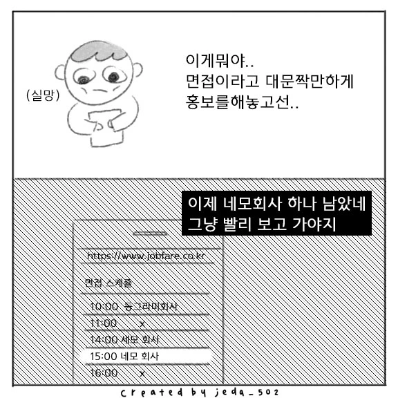 2030세대를 대표하는 직장인. 회사를 다니며 겪는 이야기. 보통의 제다가 사는 이야기를 그립니다. 누구나 겪을 수 있는, 누구나 고민할 수 있는 회사생활!