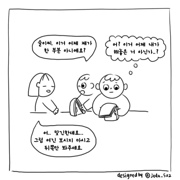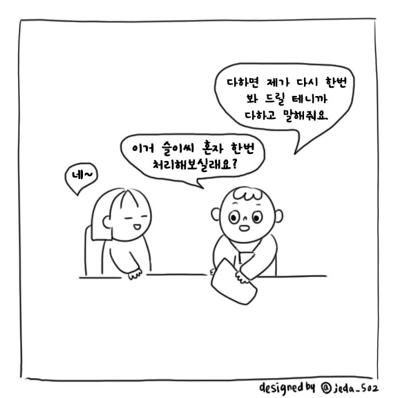2030세대를 대표하는 직장인. 회사를 다니며 겪는 이야기. 보통의 제다가 사는 이야기를 그립니다. 누구나 겪을 수 있는, 누구나 고민할 수 있는 회사생활!