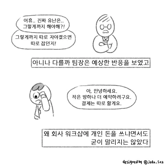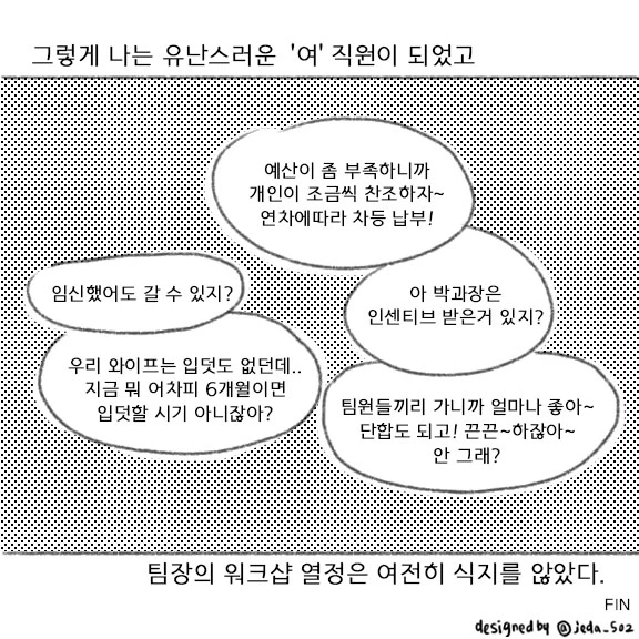 언제부터 팀원들의 스케쥴을 무시하는 것이 사회생활이 되었는지, 직원들의 불편함을 함부로 대하고 나의 재미가 팀워크, 회사생활이란 말로 포장되며 개인의 삶보다 우선이 되었는지.