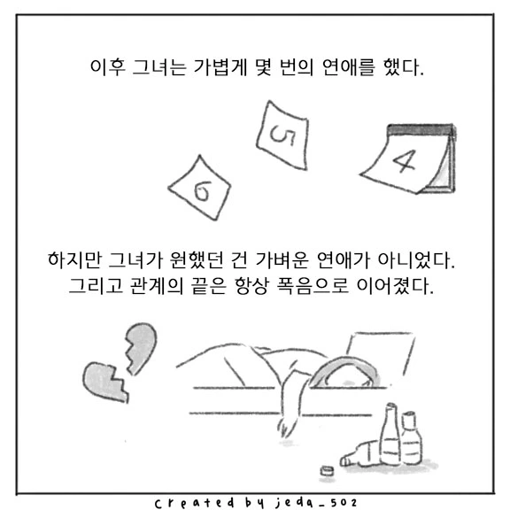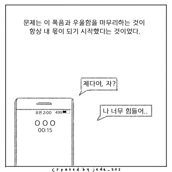 밤늦게 걸려오는 전화에는 항상 술취한 목소리의 그녀가 있었고, 어떠한 말로도 그녀의 맘을 위로할 수 없었다.