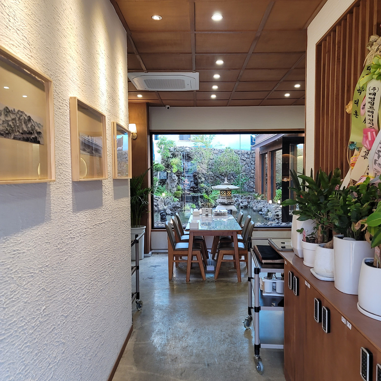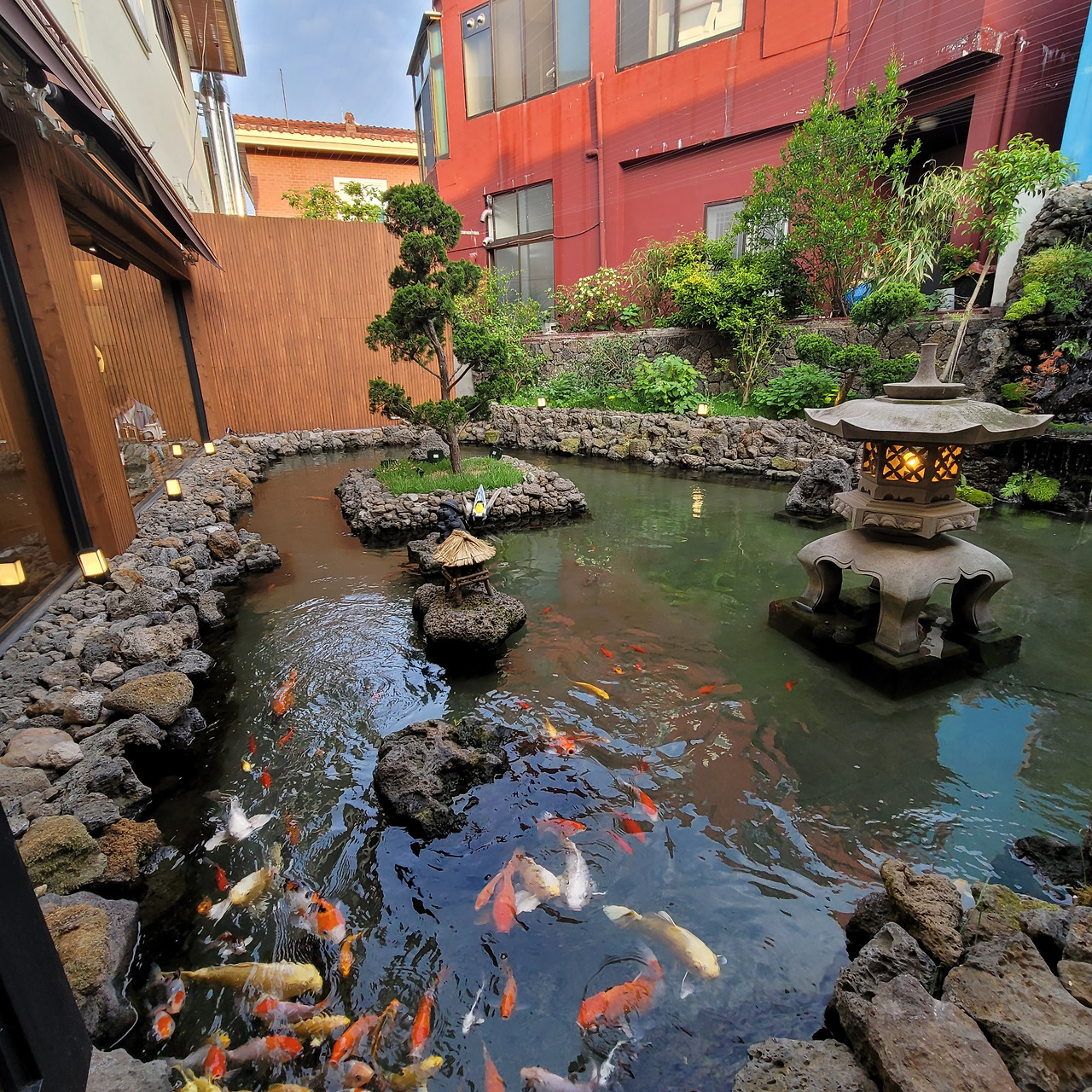 고국수집 도착. 내부로 들어가니 깔끔하고 특히 이 연못이 압권이었다. 이곳에 각종 새들도 자주 온다고 한다.