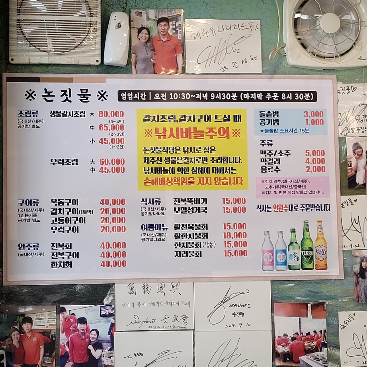 기다리는 동안 검색 해 보니 이 집 시그니처 메뉴는 갈치조림이다. 20분 정도 기다린 후 들어가서 갈치조림 2인분 시켰다. 갈치조림 시키면서 본 메뉴판이다.