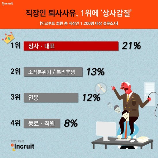 이 조사는 첫 번째 조사와는 많이 다르게 나타난다. 퇴사 이유로 상사/대표 갑질이 압도적인 1위로 나오고, 4위에도 동료/직원 등 사람 관련 항목이 있다.