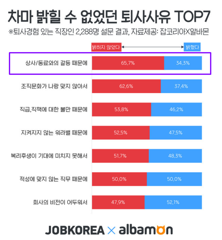 위 조사 결과에 의하면 퇴사 이유 증 <상사/동료 등 관계 문제>는 6위로 낮다. 정말 그럴까? 다른 조사 결과 하나 더 살펴본다.