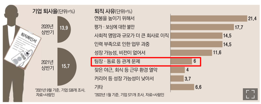 나의 인간지표에 의하면 과거에 비해서 상사/팀 동료 등 사람 관계로 인한 퇴사 이유가 줄어드는 경향은 보이지만 여전히 직장 내 사람과 갈등으로 인한 퇴사 이유가 상위권임은 확실하다고 생각한다.