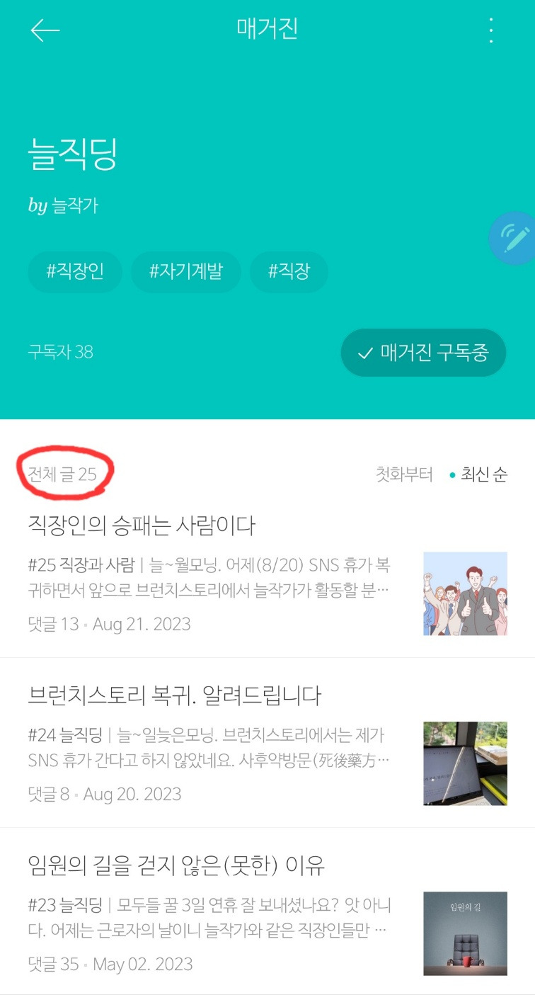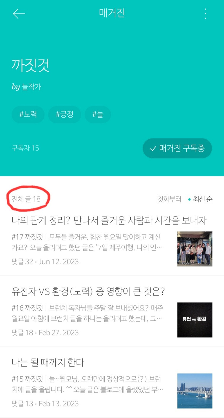 이미 늘직딩 매거진에 25편, 까짓것(자기 계발) 매거진에도 18편을 올렸네요. 이 글들은 다른 곳에는 없고 이곳 브런치스토리에만 있는 글 들이 대부분입니다.
