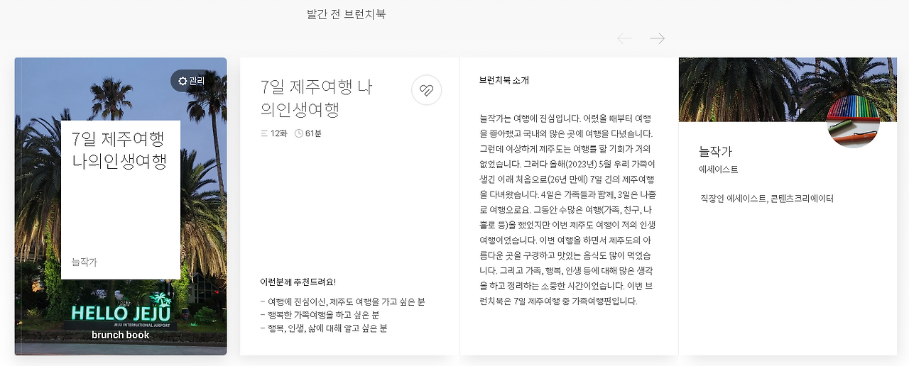 제가 올해부터 브런치북 발간을 시작하겠다고 했습니다. ‘7일간 제주여행, 나의 인생여행’를 첫 번째로 정하고 지난 8월 휴가 기간에 100% 완성시켜 놓았었습니다. (기존 발행된 글도 수정 완료) 지금 당장이라도 응모 버튼만 누르면 됩니다. 그런데 이렇게 되면 브런치스토리에서 제 포지셔닝은 ‘여행 작가’로 됩니다. 고민하다가 지난 일요일에 이야기해 드린 것처럼 제주여행 브런치북 발간은 하지 않기로 했었습니다. 그래서 올해는 응모를 포기했었습니다