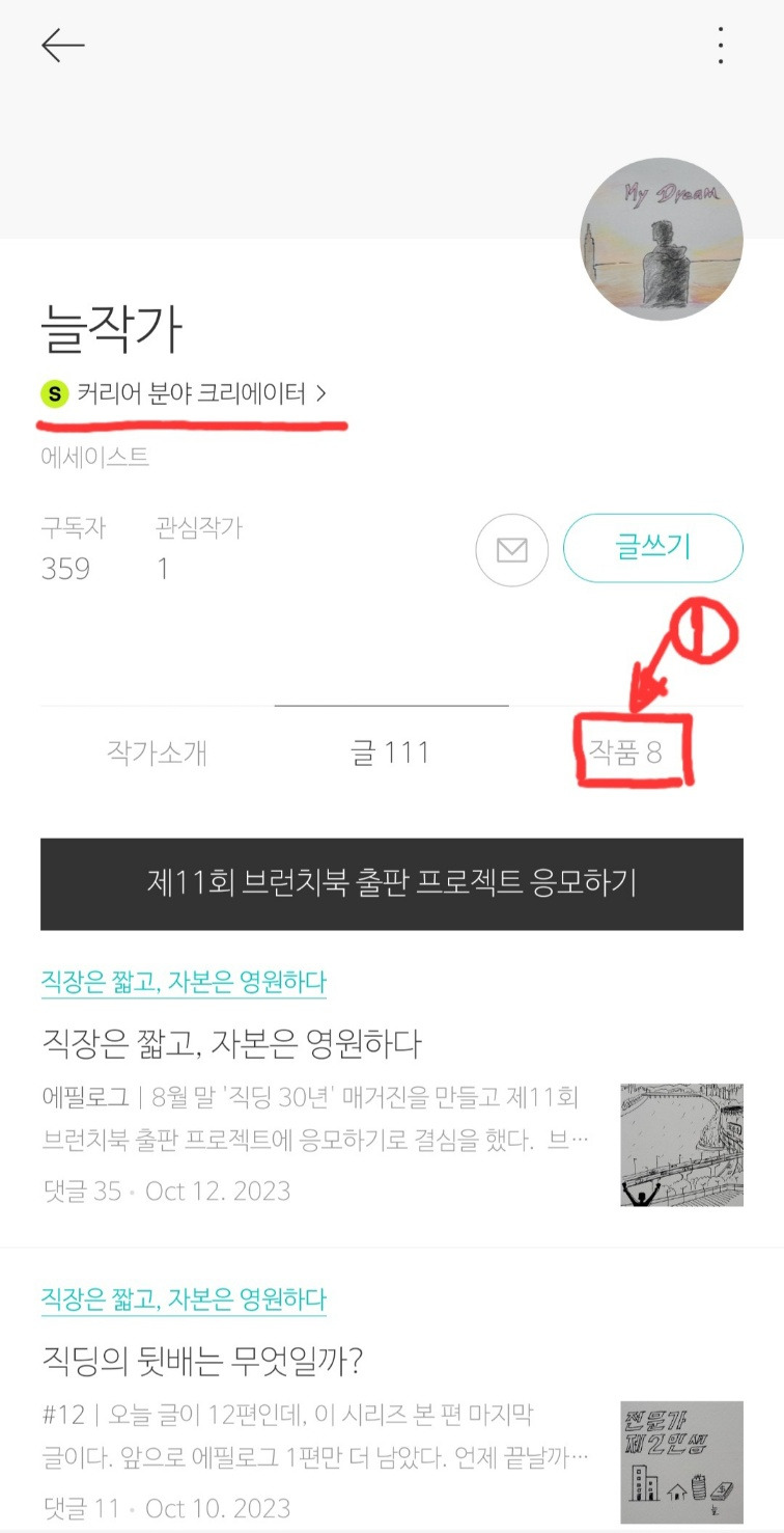 정말 우연이었는데, 브런치북 발행하는 날에 제가 '여행 분야 크리에이터'에서 ' 커리어 분야 크리에이터'로 바뀌어 있었습니다. 첫 페이지 오른쪽 작품 8을 클릭해 주세요.