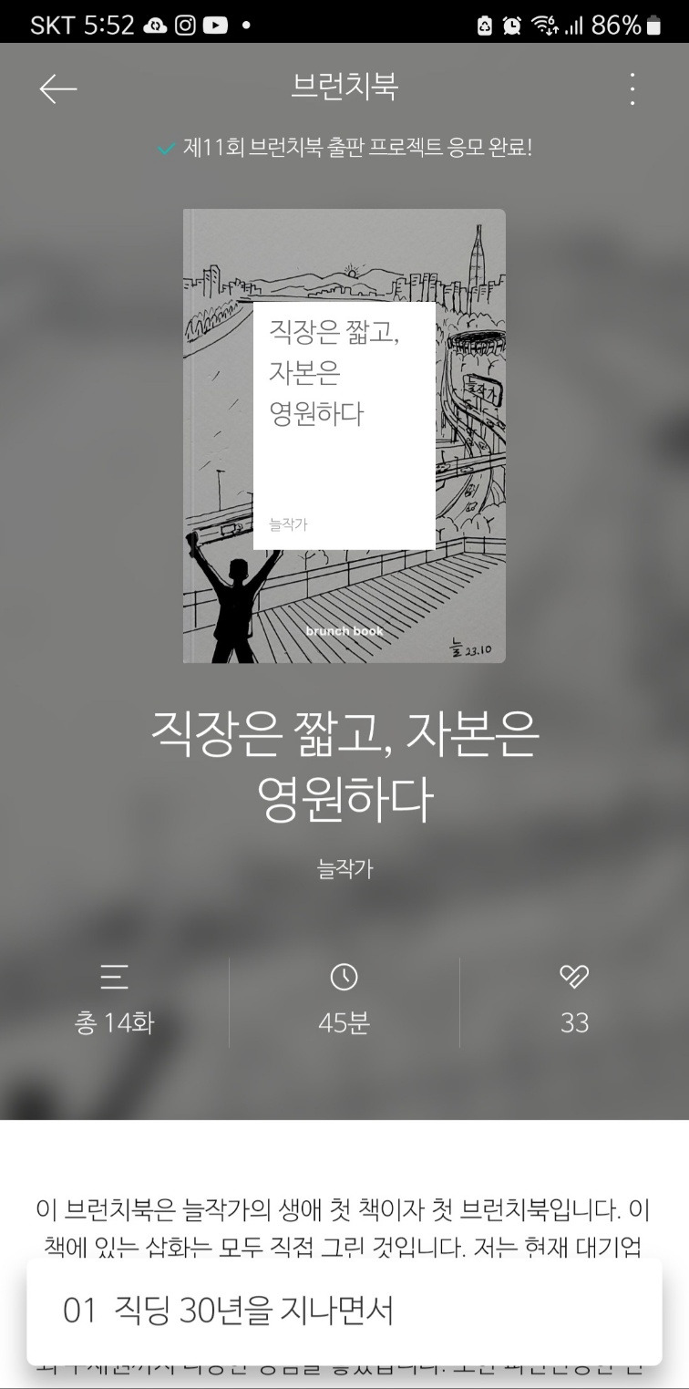 늘~월모닝. 즐거운 출근, 특히 월요일 출근 시간입니다. 말씀드렸지만 늘작가는 요즘 직장을 다니는 것이 즐겁고, 행복하고, 감사합니다. 왜 그런지는 '자본은 짧고, 직장은 영원하다'는 늘작가 최초 책이자 브런치북에서 설명드렸습니다. 참, 그런데 독자님들! 생애 첫 브런치북에 좋아요와 댓글 달아달라고 했는데, 좋아요 겨우 33명(?^^) 만 해주셨네요. 현재 구독자 수 370명인데 너무 적네요.