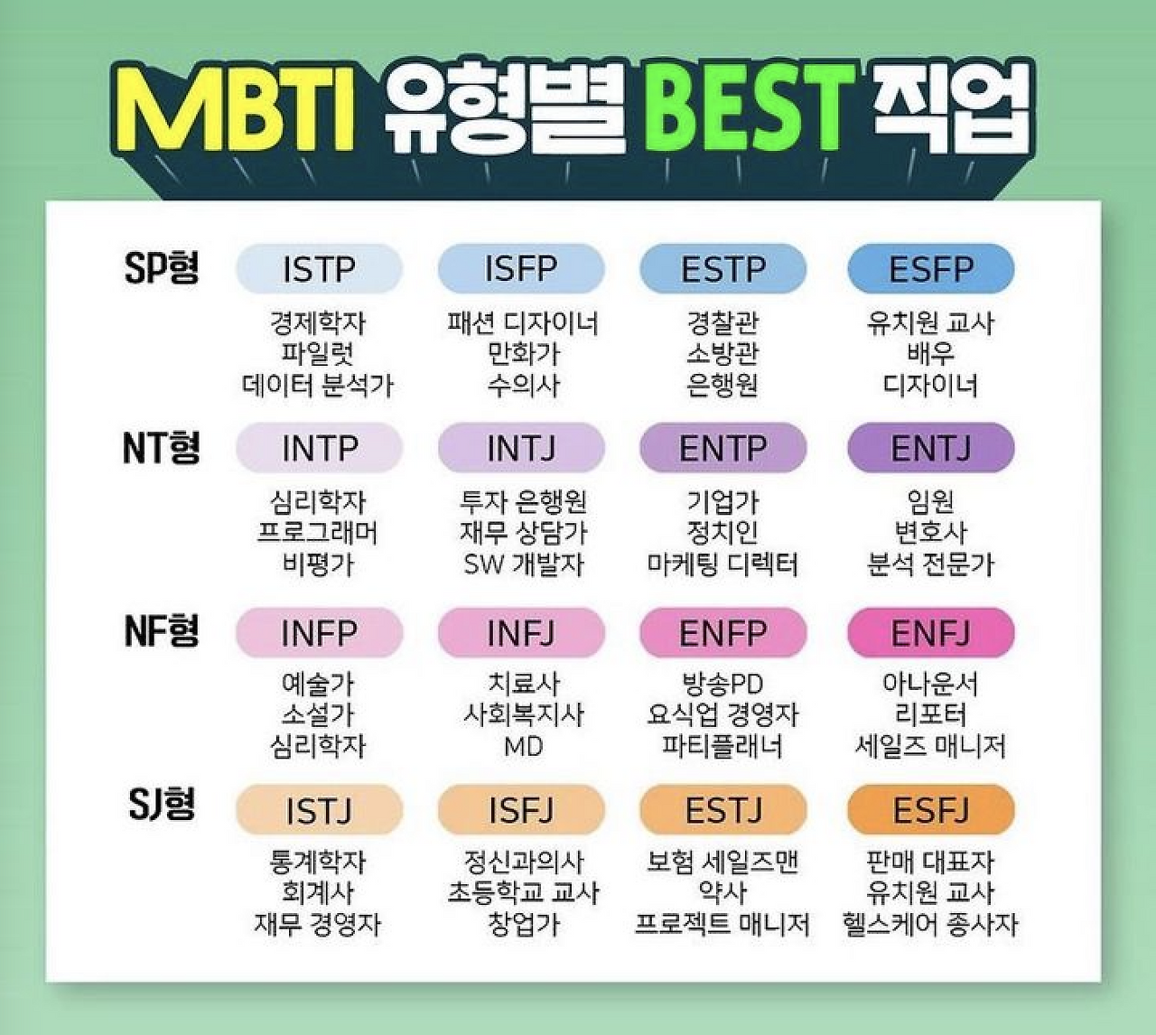 이렇게 MBTI 유형별로 적합한 직업 리스트까지 있다. 단 주의해야 할 것이 위 유형에 따른 직업이 100% 맞는 것은 아니고 개인 성격도 변한다는 것이다. 늘작가의 경우 몇 년 전까지는 100% 극강 E형, F형이었다 그런데 지금은 EF가 60~70% 정도 I와 T가 30~40% 정도 되어 사람이 되고 있다. ㅋㅋㅋ 나의 인간 지표와 배운 지식에 의하면 타고난 기질(유전)도 본인의 노력에 의해서 얼마든지 바꿀 수 있다. 단 그 한계는 분명히 있는 듯하다. Maximum 40~50%이고 경영권 확보하는(=성격 유형이 바뀌는) 51% 까지는 안 되는 것 같다. ㅎ