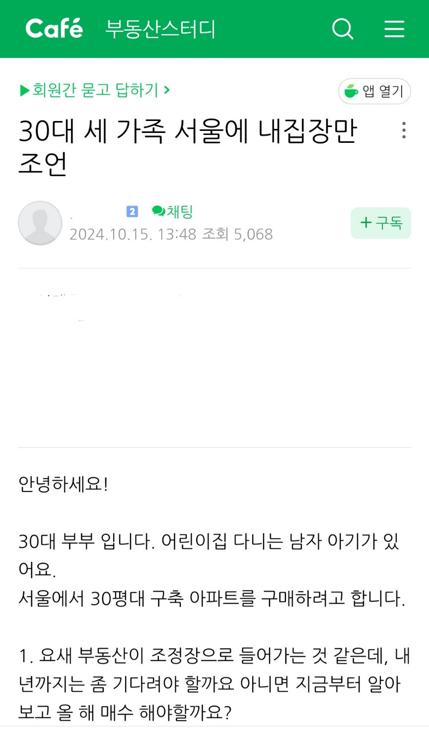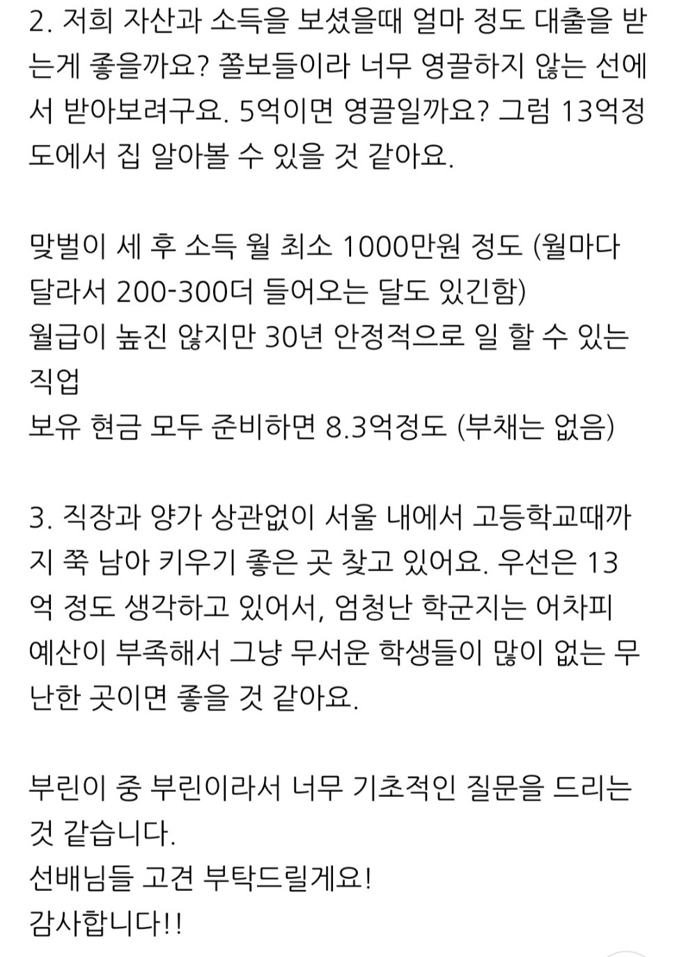 오늘 이렇게 예고 없이 브런치에 등판한 이유는 어제 부동산스터디 카페에 내 집 마련을 위한 글을 올렸던 분에게 진심 어린 조언을 했었기 때문입니다. 먼저 그분 글 올려드립니다, (개인 정보로 닉네임은 지웠습니다)