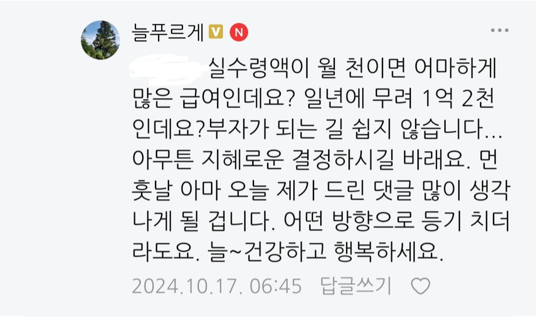 이분 나이가 아마 30대 일 듯한데 (남아가 어린이집 다니니까요) 이 정도 수입이면 정말 어마하지 않나요? 월 수령액이 월 천이 되려면 대기업 그것도 잘 나가는 대기업 부장 정도 되어야 받는 급여입니다. 대부분 직장인들은 월 천 실수령액 받지 못하고 퇴사합니다.