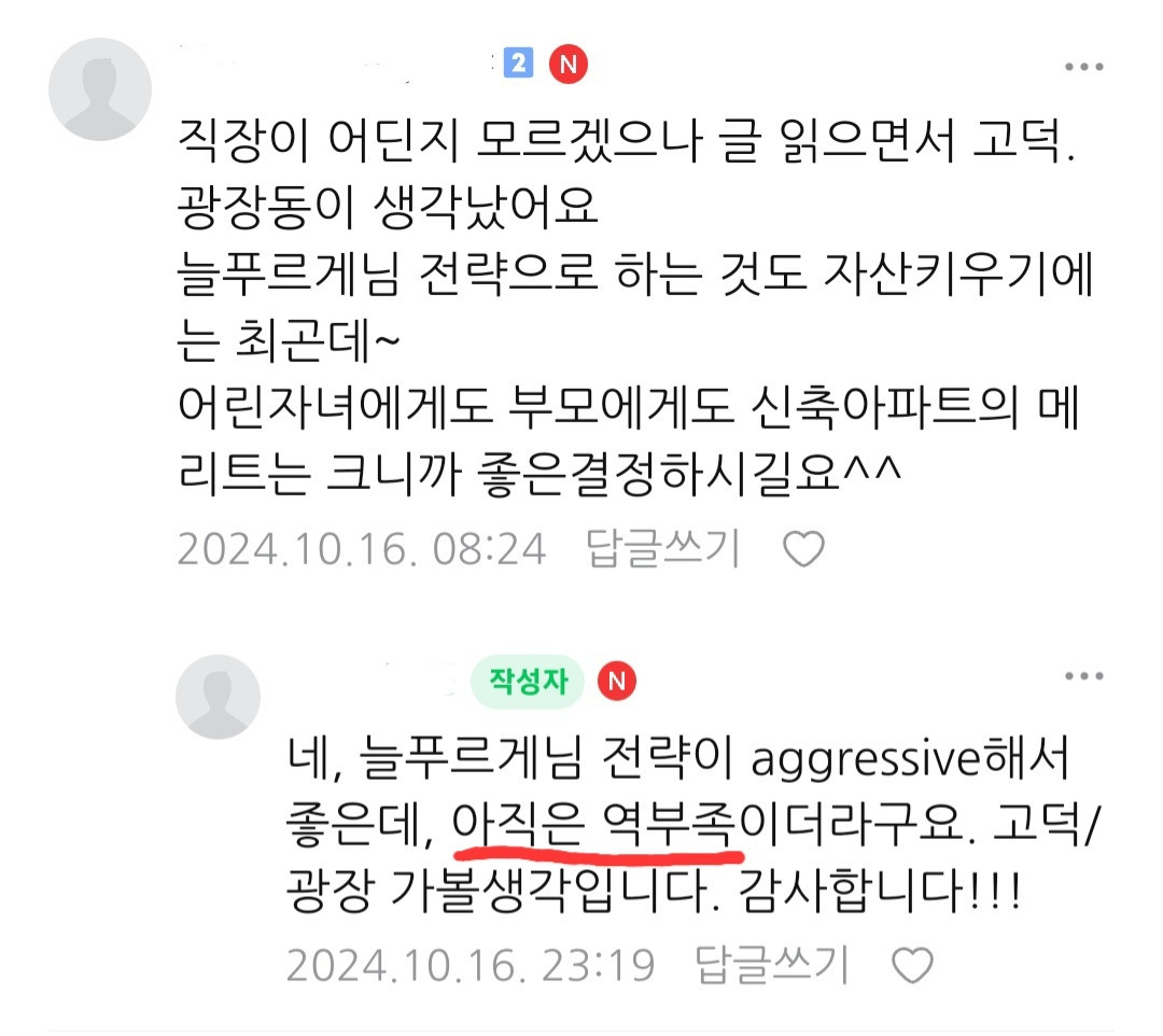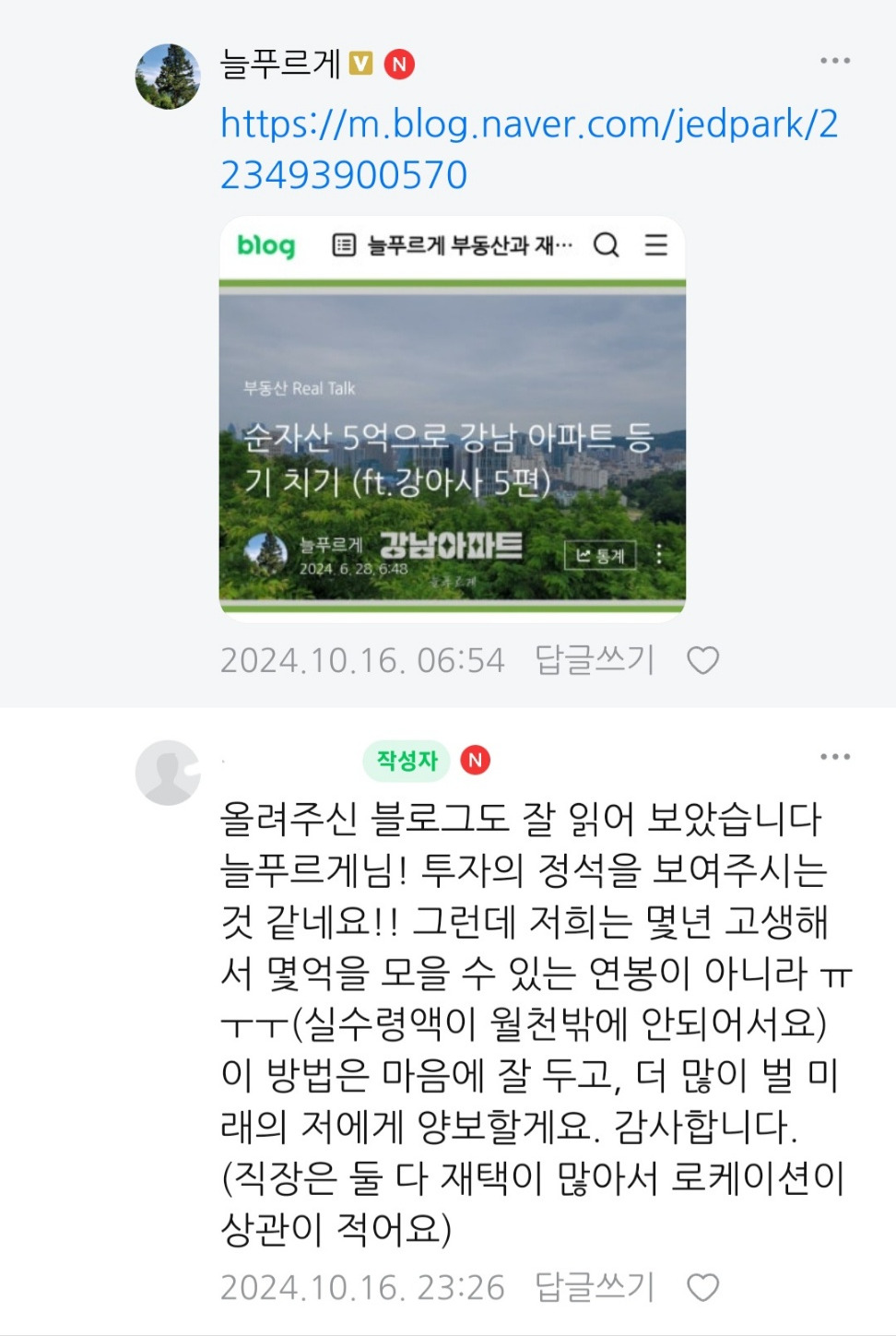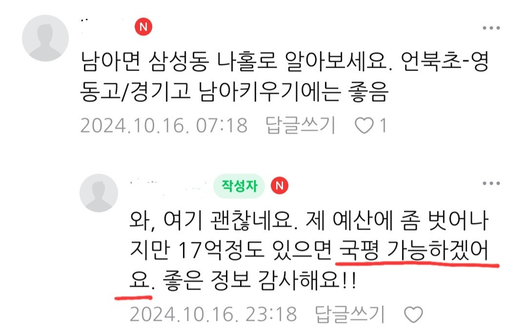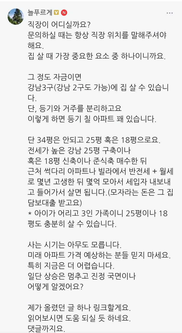 여려 분이라면 이 분께 어떤 조언을 하실까요? 이 분에 조언하는 댓글을 보니 대부분 보통 생각하는 수준의 내 집 마련 방법뿐이었습니다. 그리고 강남에 아파트 살 수 있다고 이야기하는 분들은 제가 댓글 달기 이전에는 한 분도 없었습니다. 이 카페에서 댓글 조언은 자주 하지 않지만, 진심이 보이고 본인이 올린 글에 댓글 주신 분들에게 감사하다는 답을 하는 분들에게만 가끔씩 댓글을 합니다.