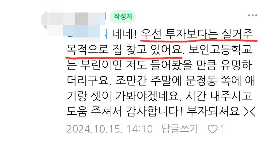 또 하나 투자보다는 실거주 목적이라고 하네요. 아파트, 내 집 마련이 어떻게 투자 따로, 실거주 따로인가요? 같이 하는 것이지요. 전세 끼고 집 미리 사놓은 것도 결국은 실거주를 위한 것입니다. 물론 갭으로 사서 투자만을 위한 것도 있지만 이 케이스는 그런 것이 아닙니다.