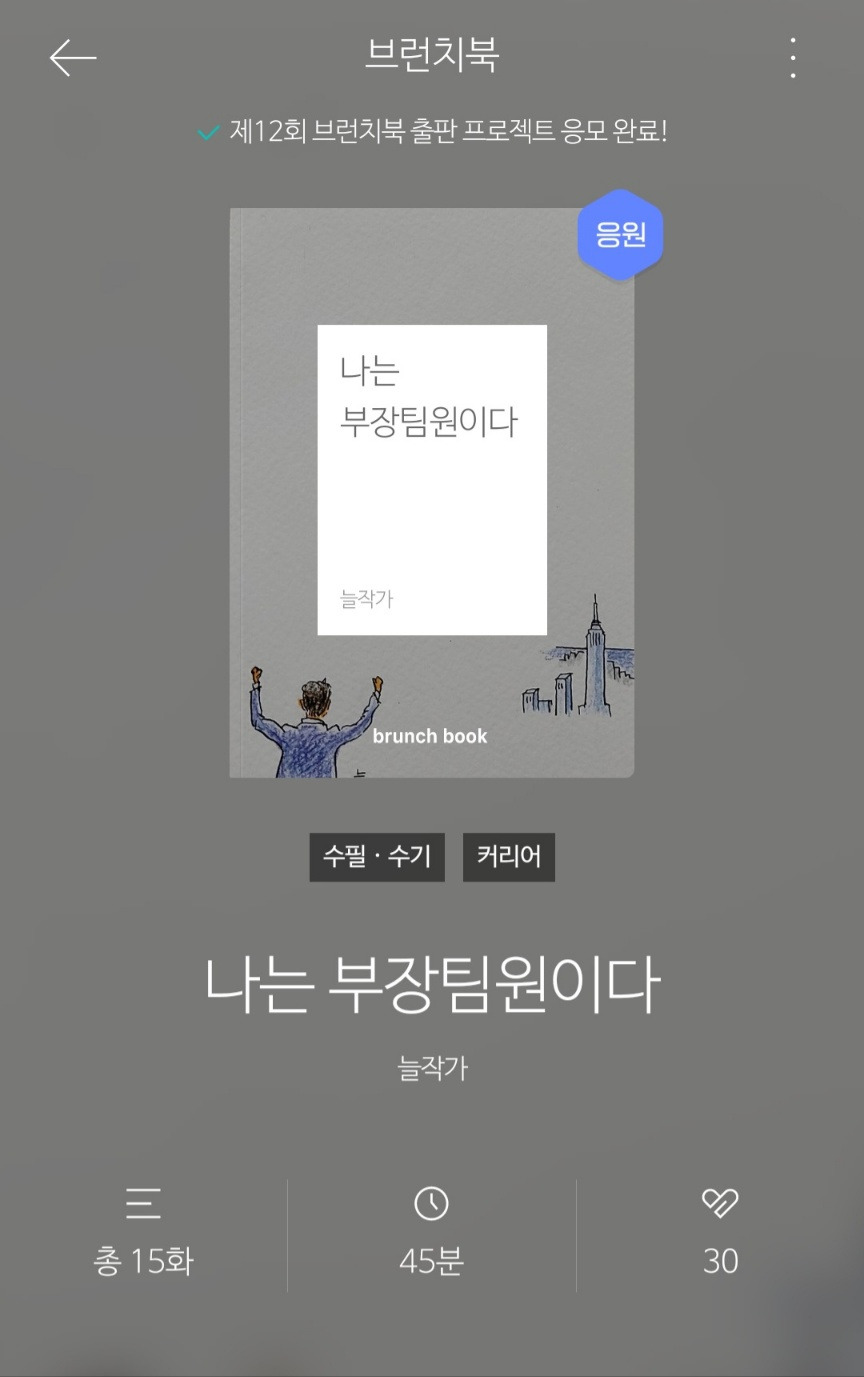 일주일 중 제일 편안하고 좋은 목요일 퇴근길에 저의 세 번째 브런치북인 '나는 부장 팀원이다' 발행하고 집에 도착하여 글을 올립니다. 지난 일요일 저녁에는 '걸어온 33년, 걸어갈 33년' 브런치북을 발행을 했고, 오늘 마무리해서 올해 초 제가 세웠던 계획 중 가장 중요한 것 중의 하나를 마무리했습니다.
