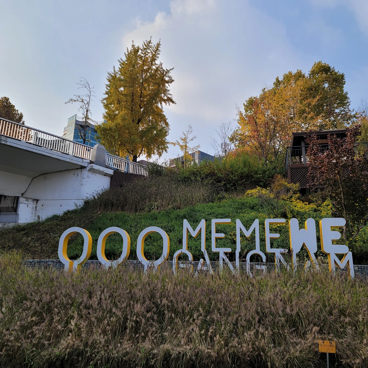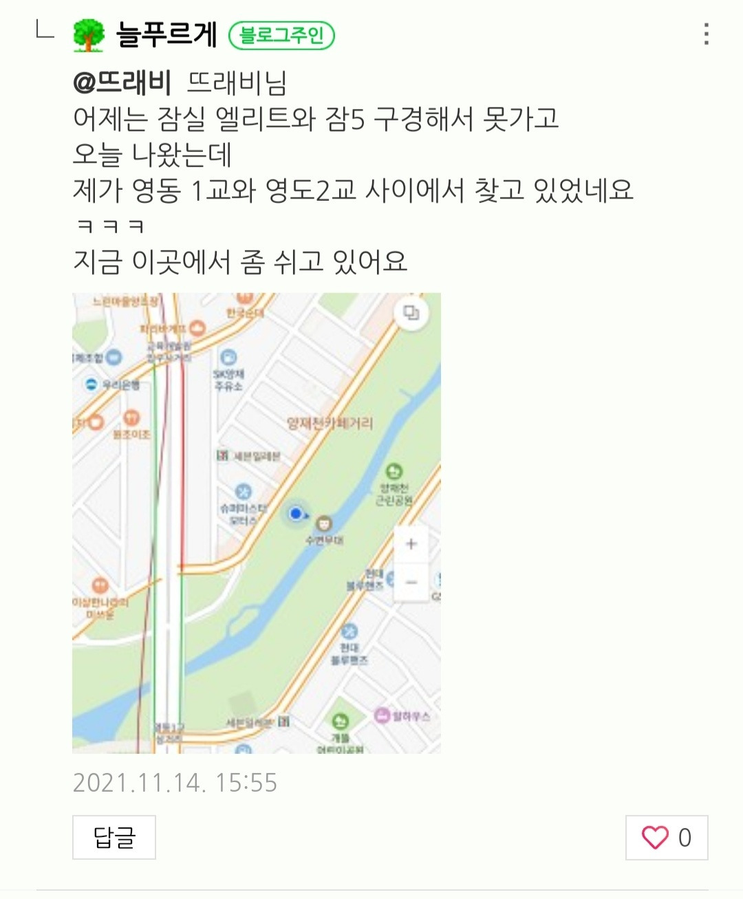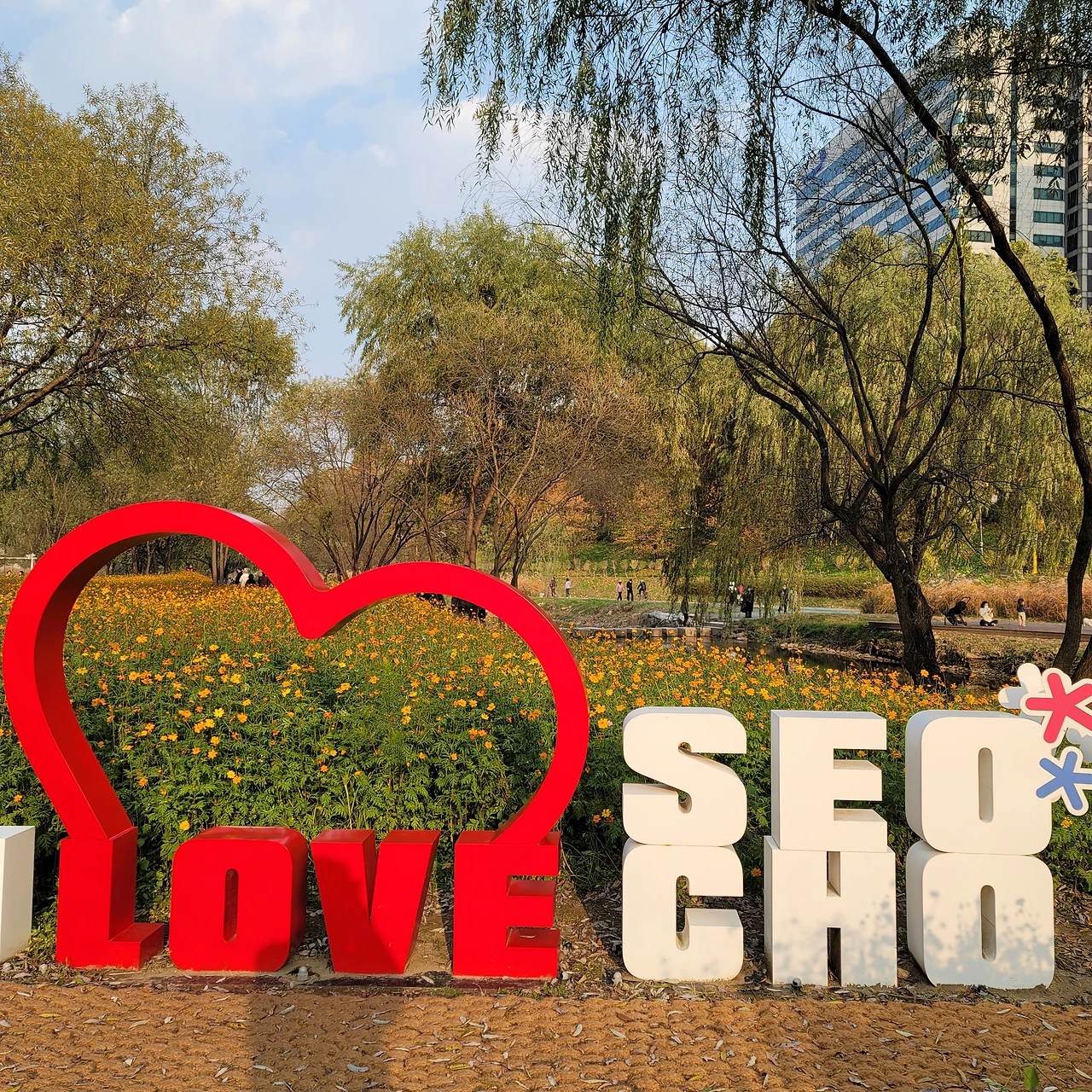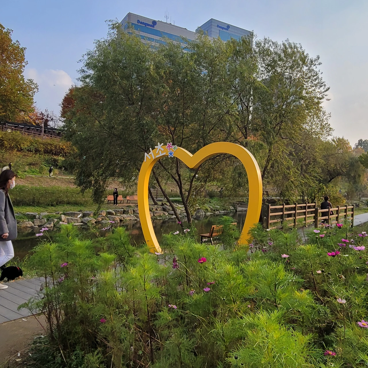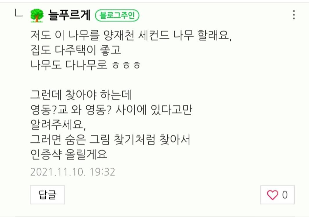 영동 2교 가는 길에 보이는 서초구에서 만든 예쁜 포토존도 보인다. 그런데 아무리 찾아도 뜨래비님이 알려준 나무가 보이지 않는다. 그래서 뜨래비님께 댓글을 드렸다.