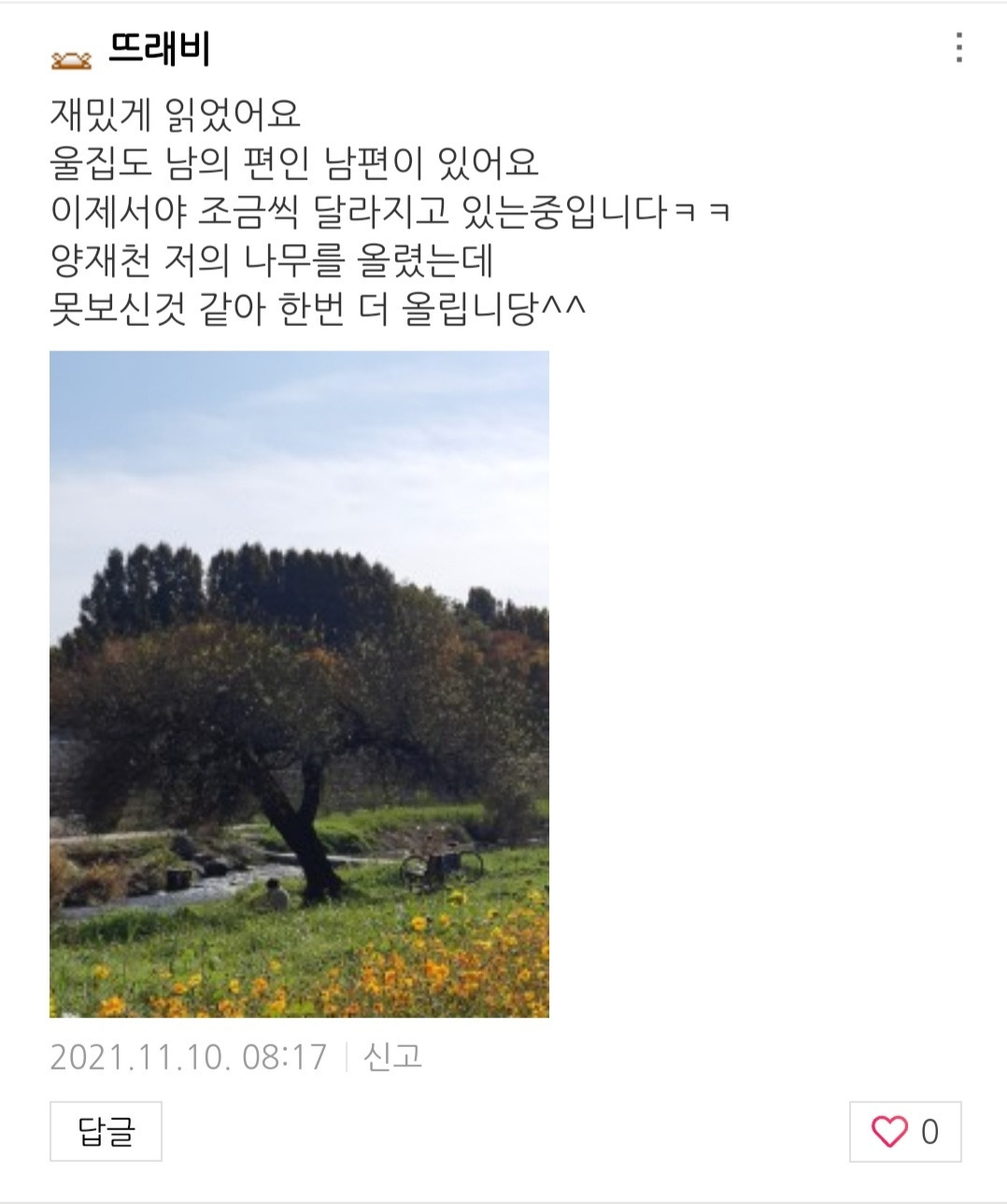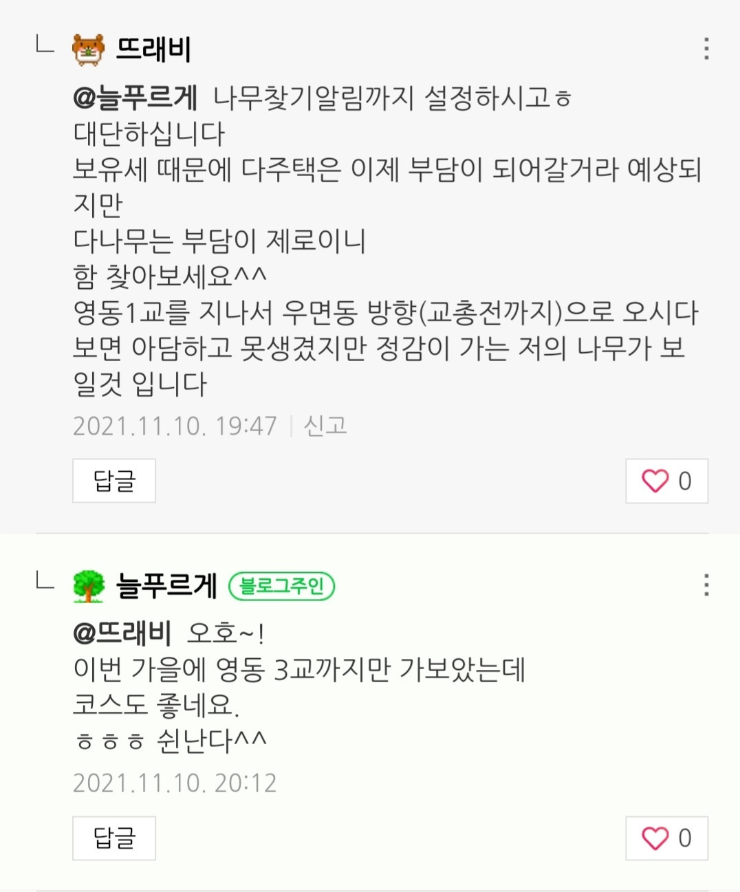 이 나무 사진을 보고 이렇게 댓글 대화가 서로 오갔다.(몇 개 문장은 제외)