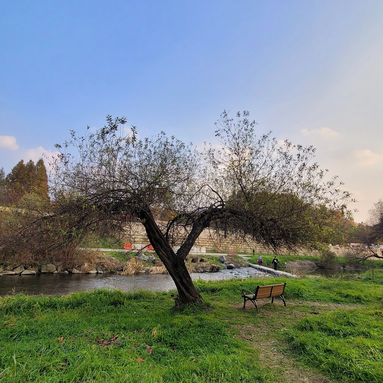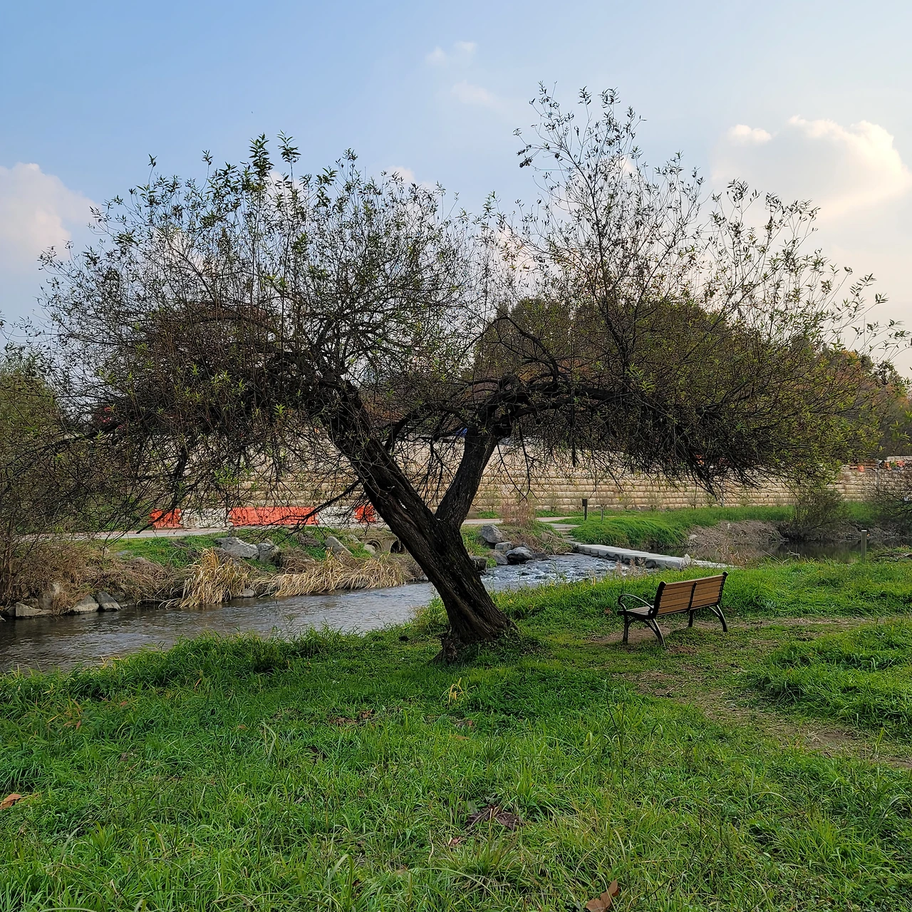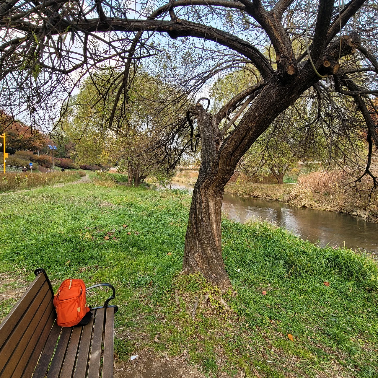 나무 건너 도로 공사 중이라 옹벽이 새로 생긴 것이 살짝 아쉽긴 하지만 자태로 훌륭하고 바로 앞에 양재천이 졸졸 흐르고, 뒤로는 언덕이 있고 정남향에 입지 끝판왕이 곳이다. 이전 양재천 늘푸르게 반려나무 2호는 나무 밑에 의자가 없고 많은 사람들이 지나는 길 옆이라 이 나무처럼 옆에 앉아 쉴 수 있는 공간은 없다. 다리 위에서, 먼발치에서 보는 그런 나무이지만, 이 반려나무 4호는 나무 아래 벤치가 있는 것이 너무 마음에 든다.