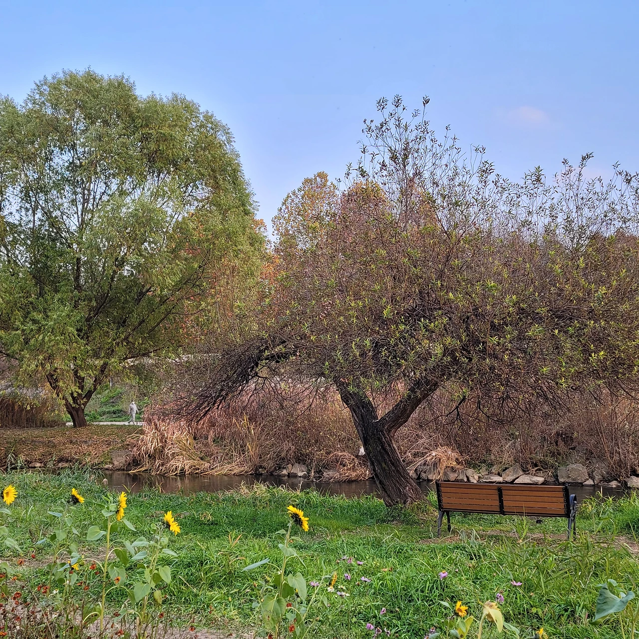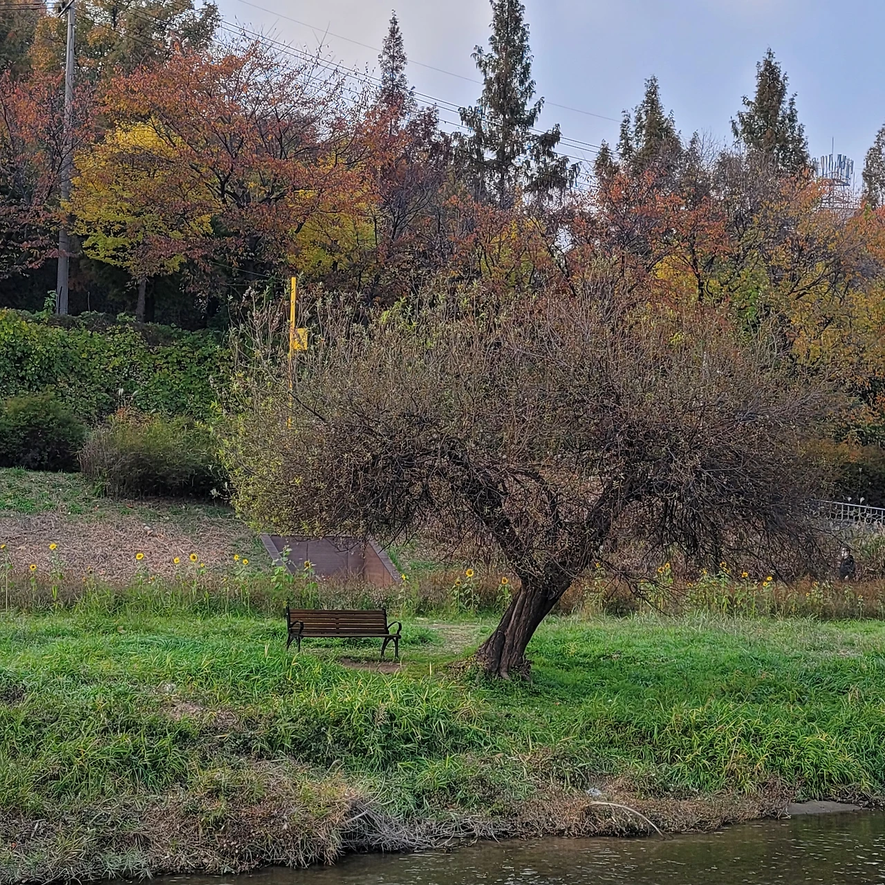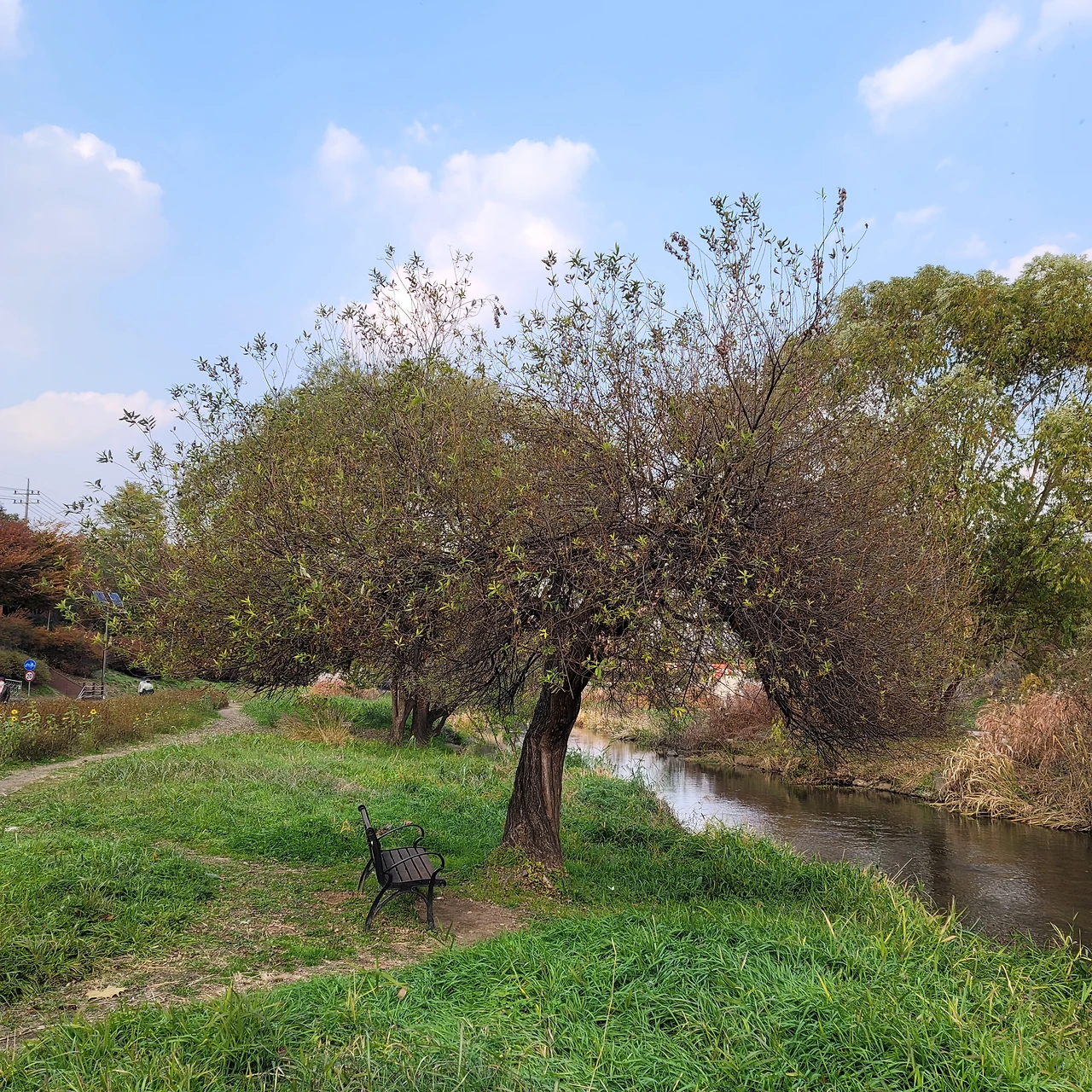 나무 건너 도로 공사 중이라 옹벽이 새로 생긴 것이 살짝 아쉽긴 하지만 자태로 훌륭하고 바로 앞에 양재천이 졸졸 흐르고, 뒤로는 언덕이 있고 정남향에 입지 끝판왕이 곳이다. 이전 양재천 늘푸르게 반려나무 2호는 나무 밑에 의자가 없고 많은 사람들이 지나는 길 옆이라 이 나무처럼 옆에 앉아 쉴 수 있는 공간은 없다. 다리 위에서, 먼발치에서 보는 그런 나무이지만, 이 반려나무 4호는 나무 아래 벤치가 있는 것이 너무 마음에 든다.